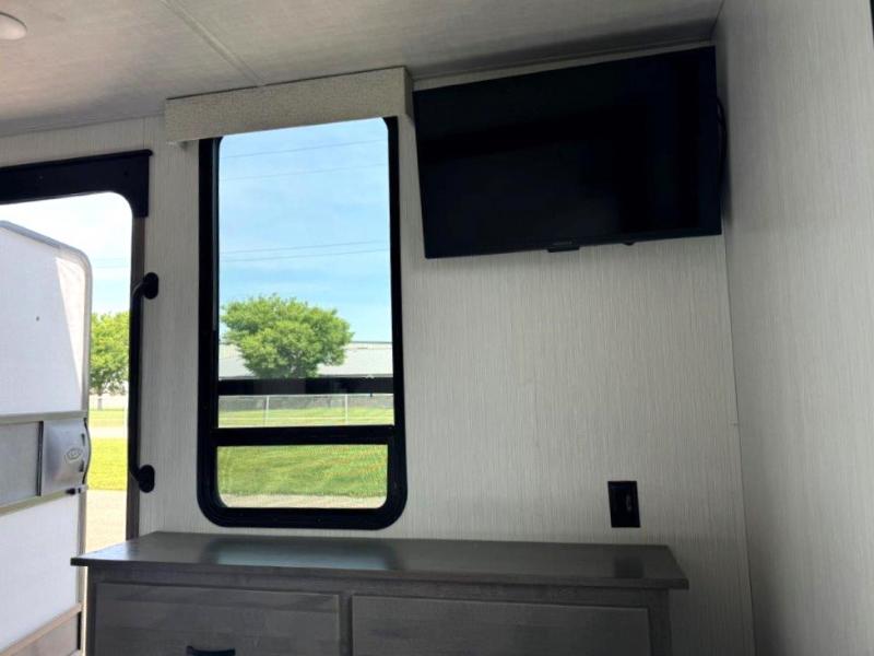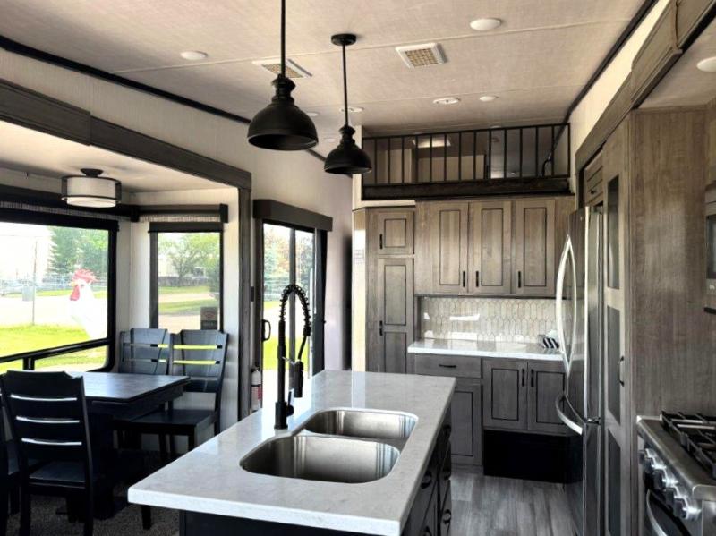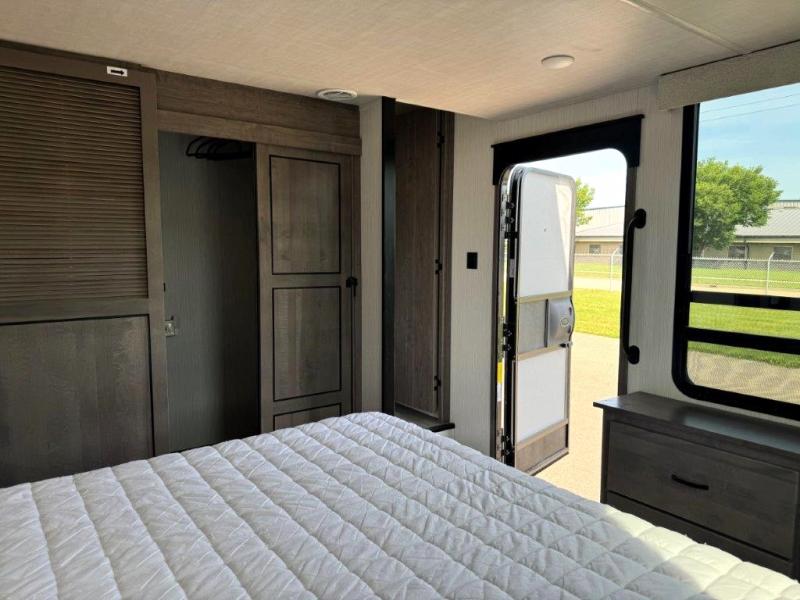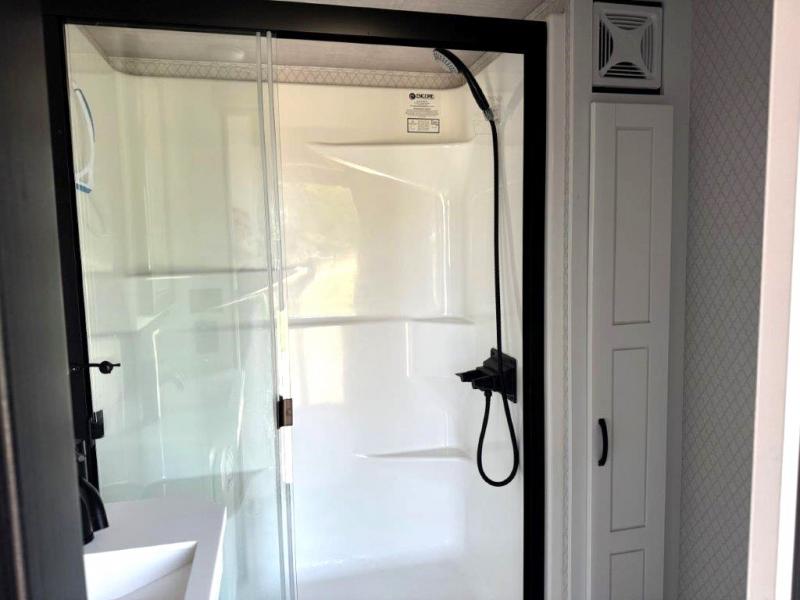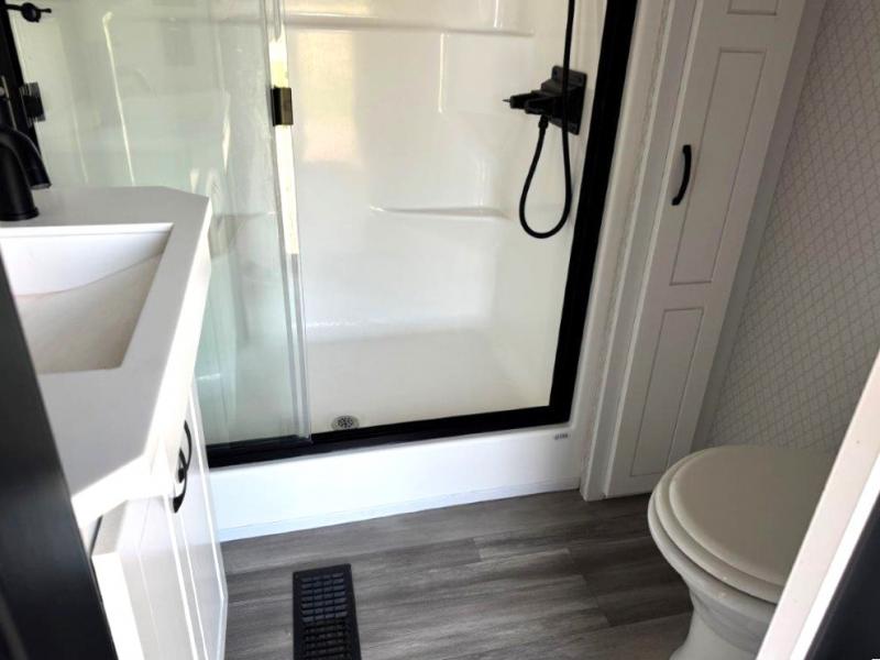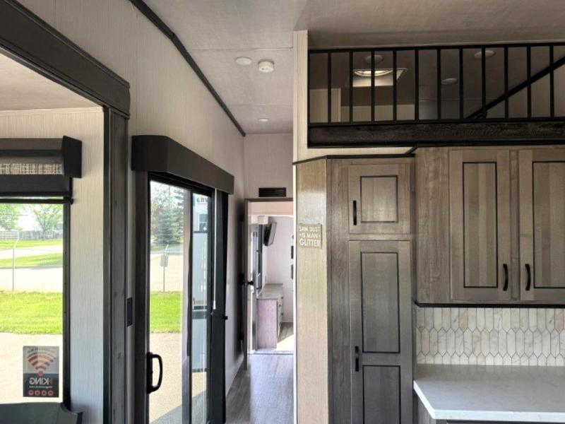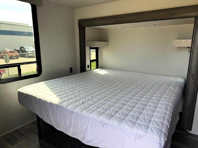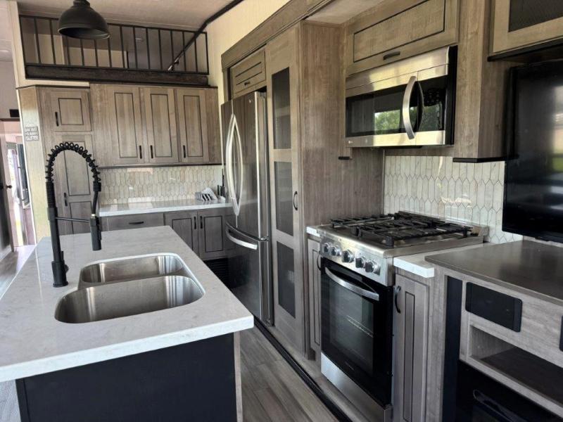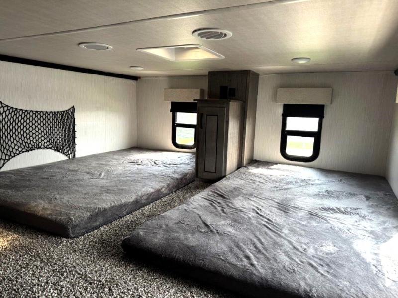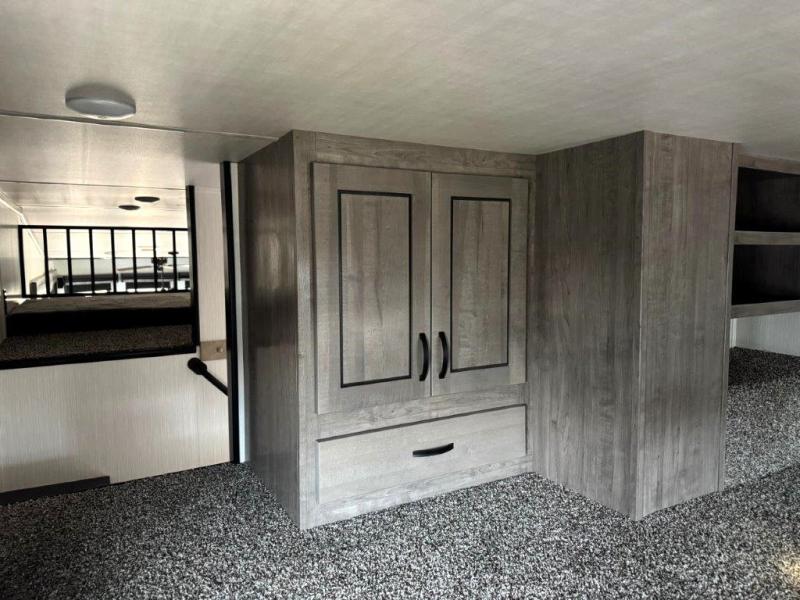 The star feature of this Cedar Creek Cottage destination trailer is the huge loft area. Take the stairs up to the loft to see the three bunk mats and wardrobe. There is also a railing that prevents anyone from falling off the edge. The rear private bedroom offers you another sleeping area with a king bed slide for the most comfort, and there is also a six-drawer dresser that you can use to store your socks and t-shirts. The full bathroom comes with a 30" x 48" fiberglass shower with seat, a bath towel rack, a toilet paper holder, a large, mirrored medicine cabinet with overhead makeup lights, and a linen closet, and the kitchen is also fully equipped with a full pantry, a one-piece backsplash, a Create-A-Breeze Fantastic Fan with thermostat and rain sensor, a stainless steel 30” over-the-range microwave with built-in vent, and crown molding that complements all overhead cabinets.