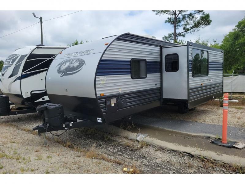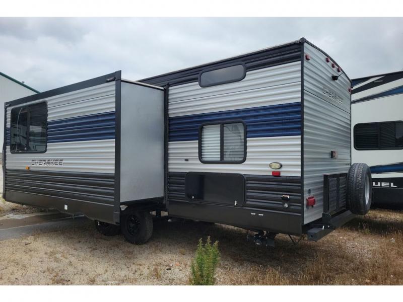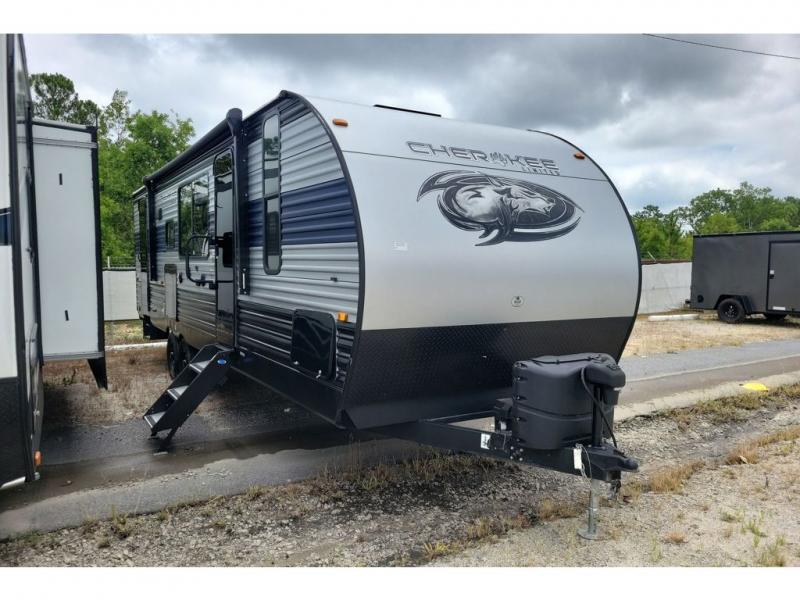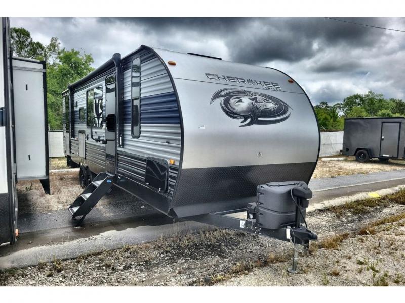 If the open road is calling your name, then answer it with one of these Forest River Cherokee travel trailers or toy haulers! A seamless roofing membrane with heat reflectivity covers these units and an armored underbelly tank enclosure protects it from road debris. The Power Gear frame technology holds them together and also comes with a space saver rail design. An outside shower with hot and cold water helps to keep the dirt outside where it belongs. With the Campfire package, you will get a beautiful entertainment center to watch your favorite movies, a sink cover for more prepping space, and a 6 gallon DSI gas/electric water heater for hot showers each morning. The Cherokee Total Control app and remote control system allows you to control your unit at the touch of a finger. A few other features you will appreciate include a super kitchen, USB charging station, and light filtering sheer shading premium blackout zebra shades for added privacy. Come find your favorite model today!