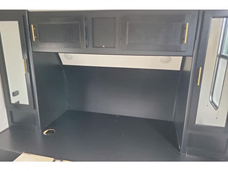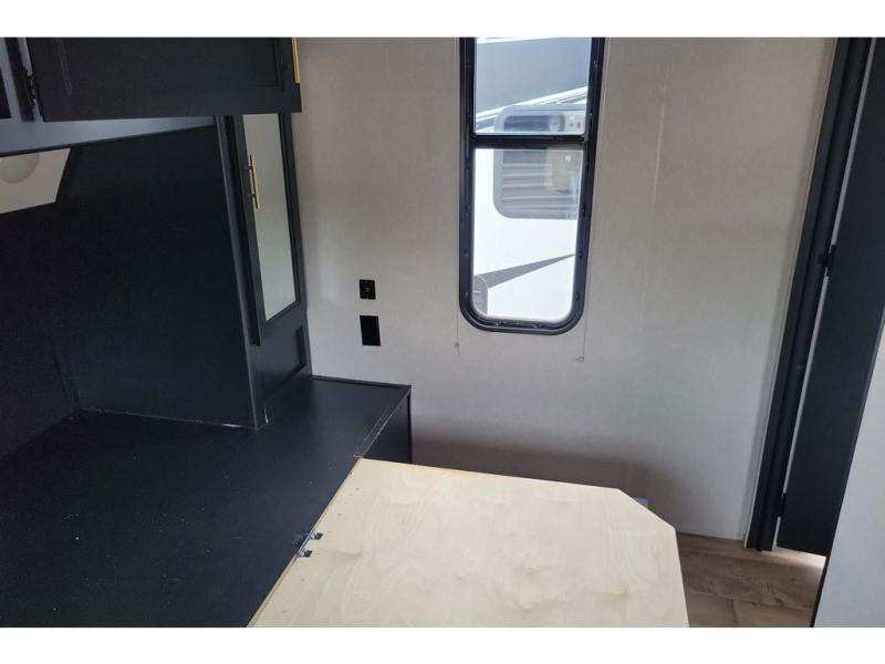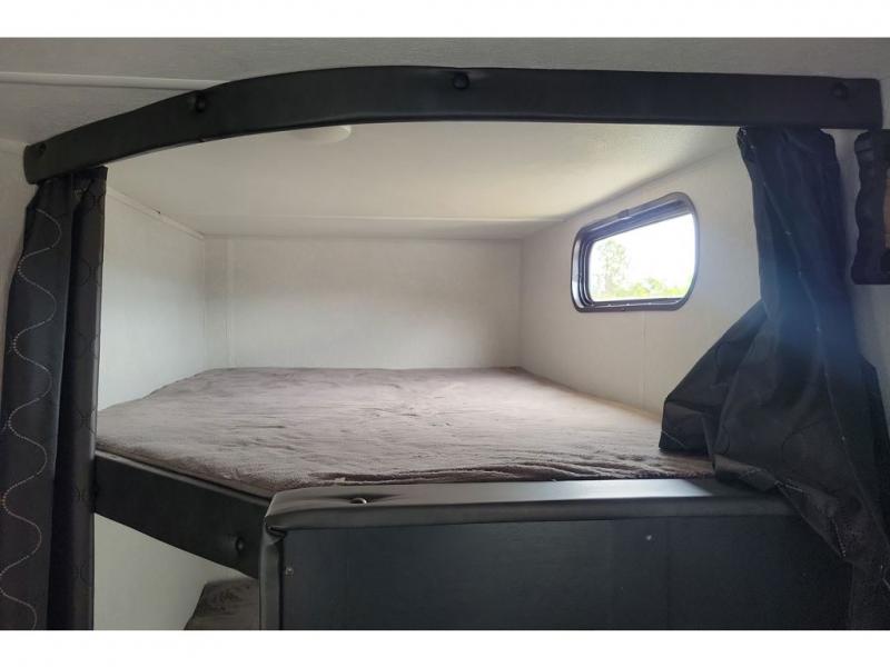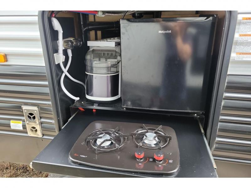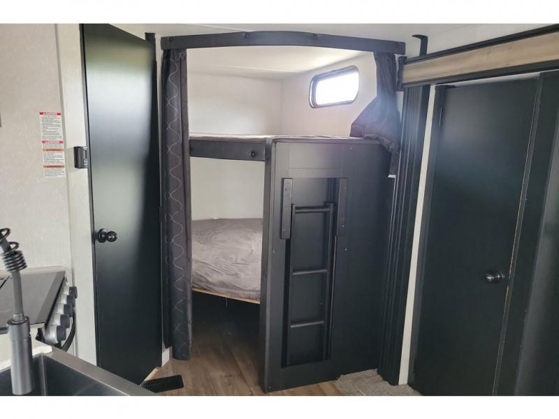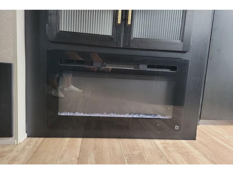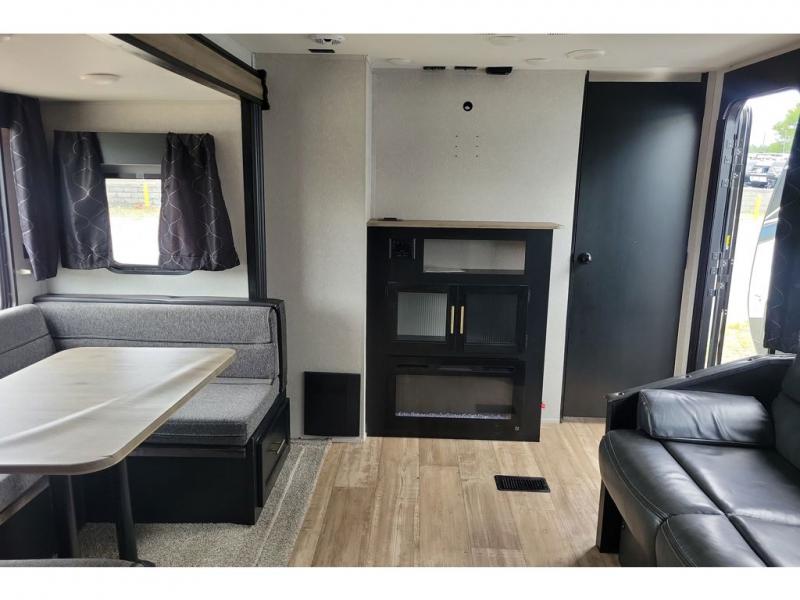 You won't believe all that is included with this travel trailer! Starting with the dual entry doors for a smooth flow of traffic to the outside storage areas, the outside TV mount, the outside kitchen, and the rear storage rack. The kiddos or guests can sleep on the set of double bunk beds with a ladder which are conveniently next to the rear corner bathroom that has a tub/shower and an entrance/exit door. The U-shaped dinette and sofa can also transform into extra sleeping spaces if needed. Lay your head at night on the walk around queen bed with wardrobes on either side, a TV mount area, and a linen closet for your clothes. There is even a fireplace below the TV mount at the entertainment center for a cozy evening indoors!
