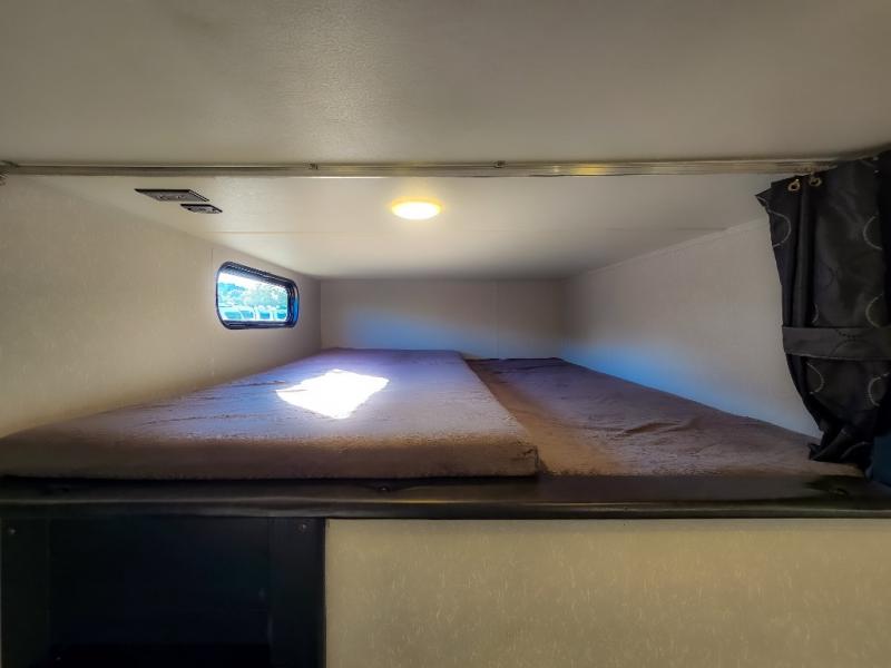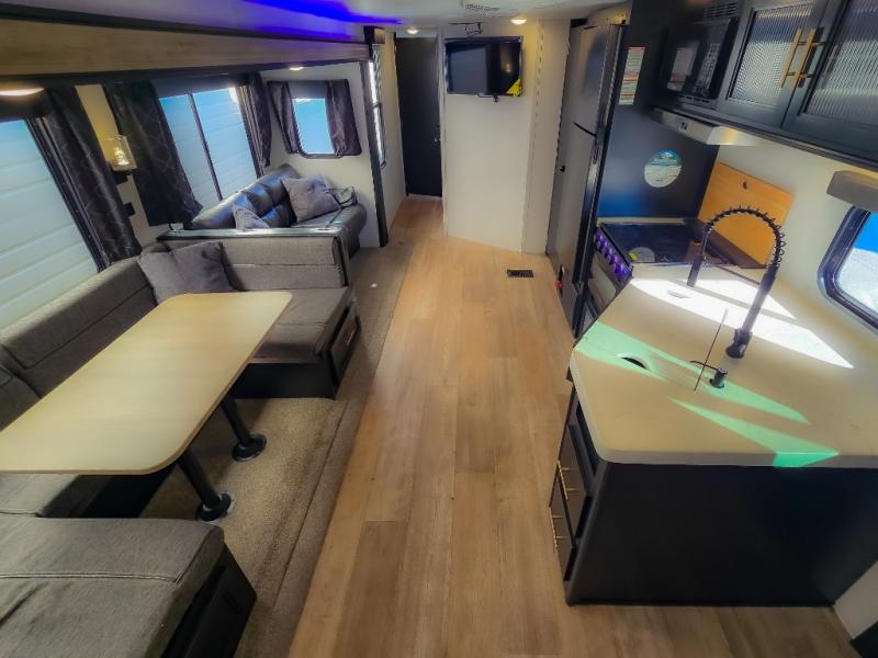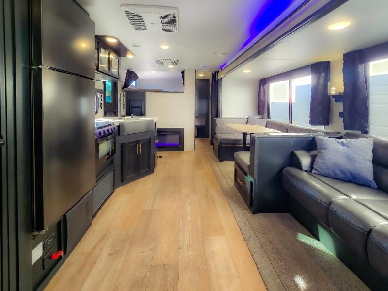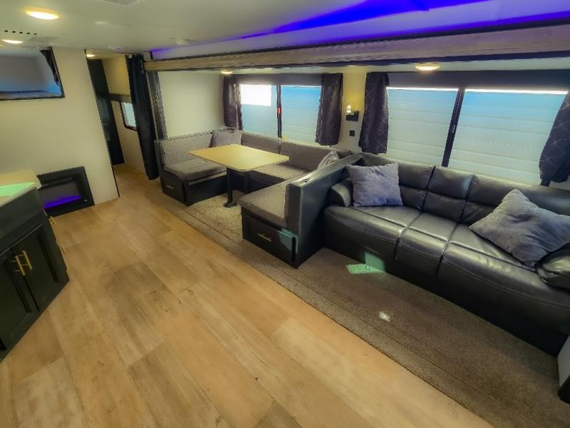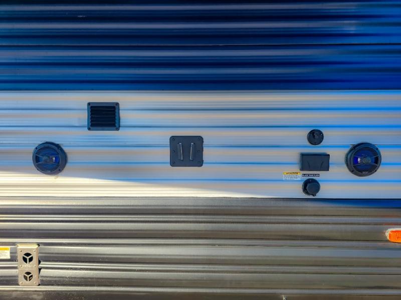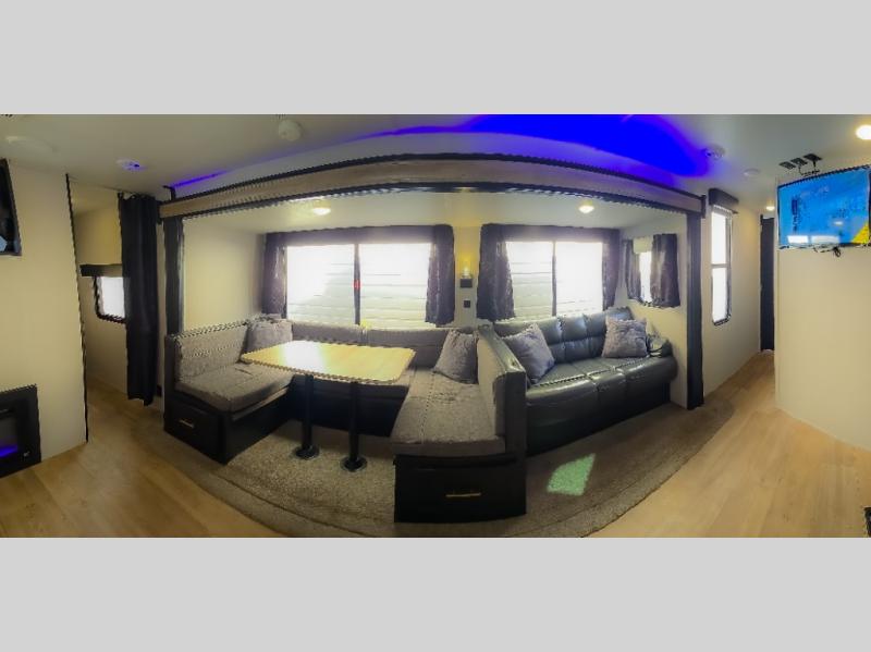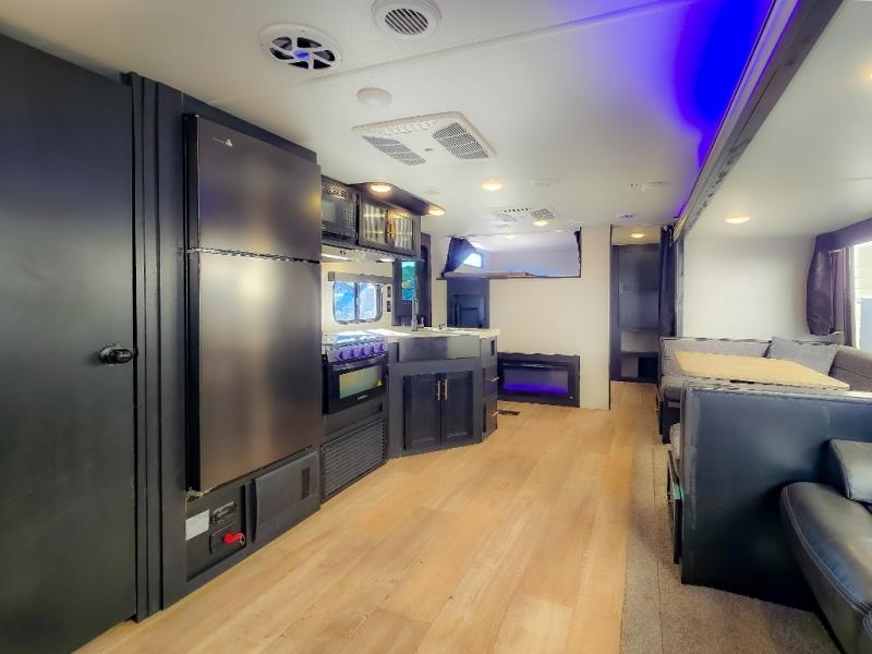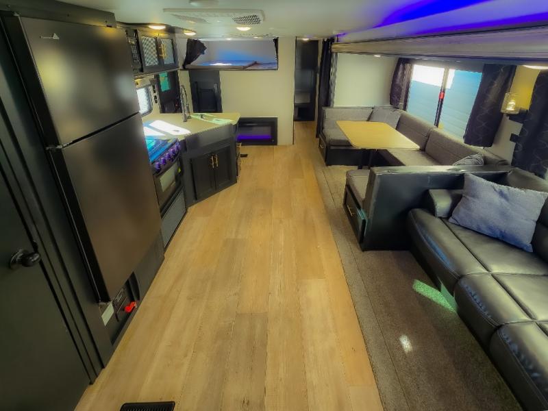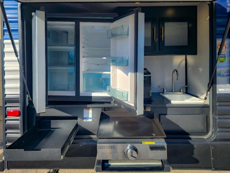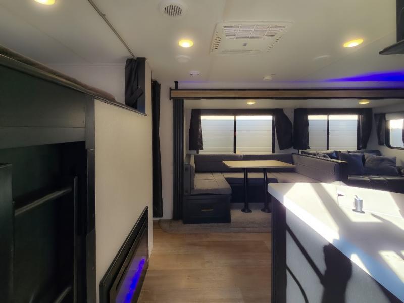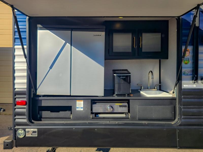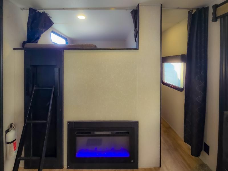 Escape your ordinary life with this innovative travel trailer! It features 64" top bunk bed above a 36" bottom bunk with wardrobes on either side of them, plus there is a wall at the foot of the beds with a fireplace on the other side. You will have your own privacy with the front private bedroom that has a walk around queen bed with wardrobes on either side and an entrance into the dual entry bathroom which has a radius shower to freshen up in each morning. The sofa and U-shaped dinette can also transform into extra sleeping spaces when you aren't using them to enjoy a meal or relax in front of the TV mount. The outdoor bar and grill comes with an exclusive side by side 3.2 cu. ft. refrigerator and freezer, a pull out two burner cooktop, a standalone ice maker, and a sink with an overhead cabinet with shelf for your cooking essentials. You even have a rear storage rack and outside storage areas to store your outdoor gear!