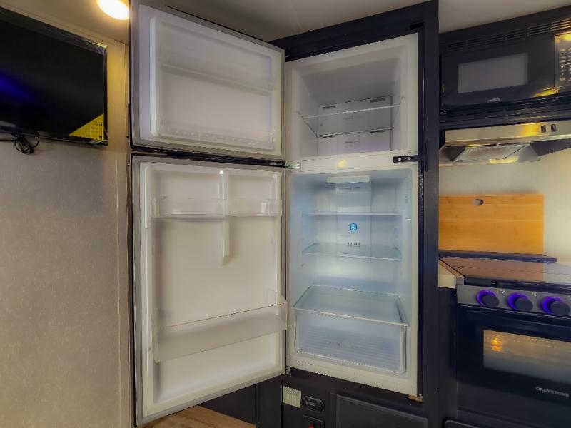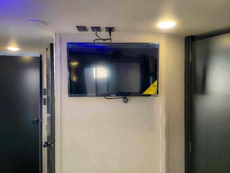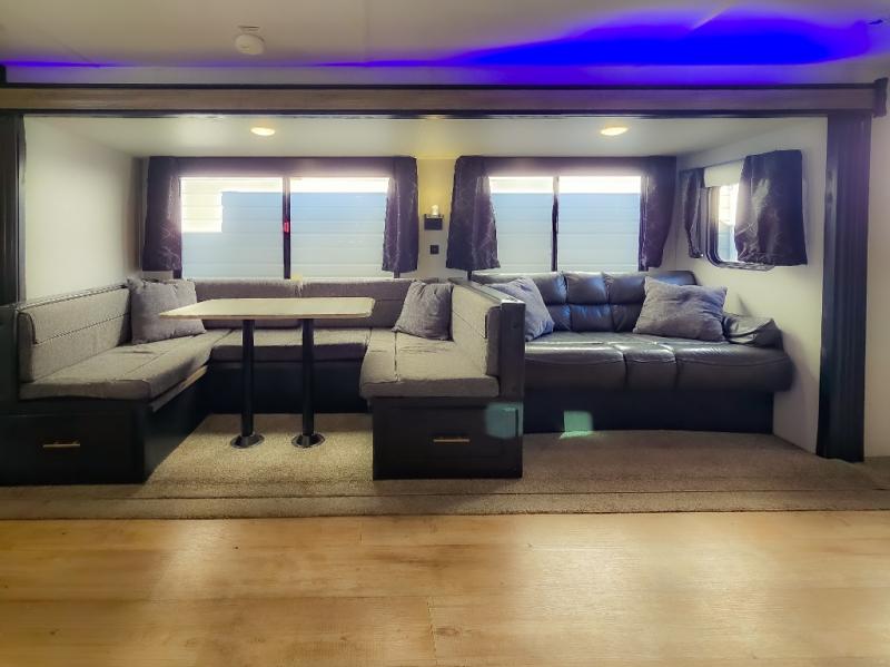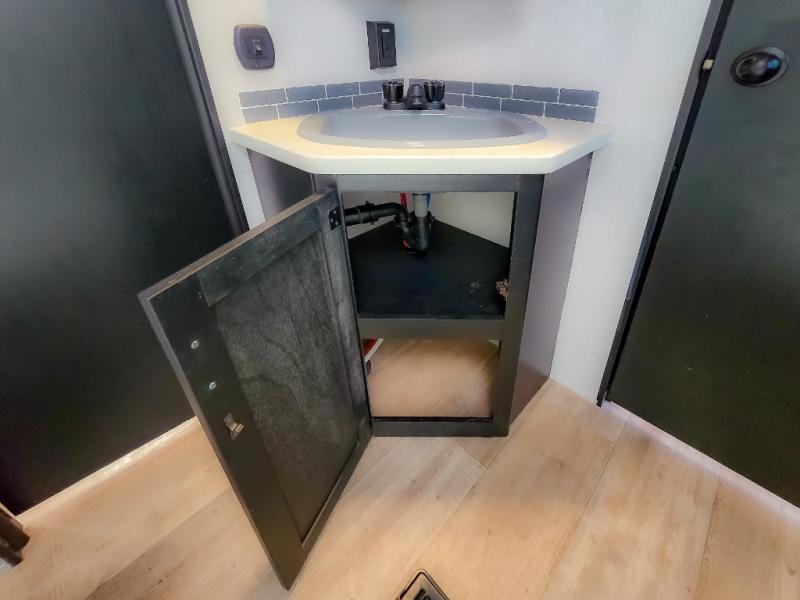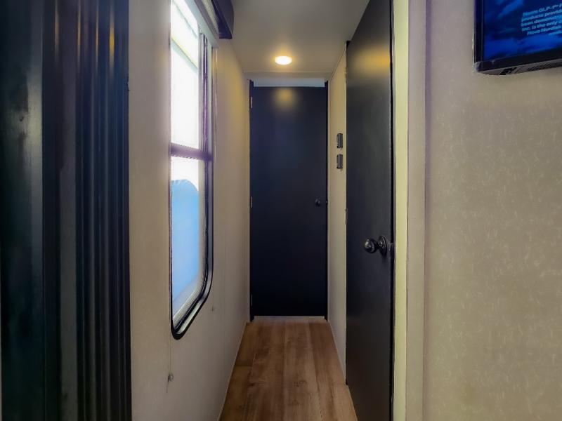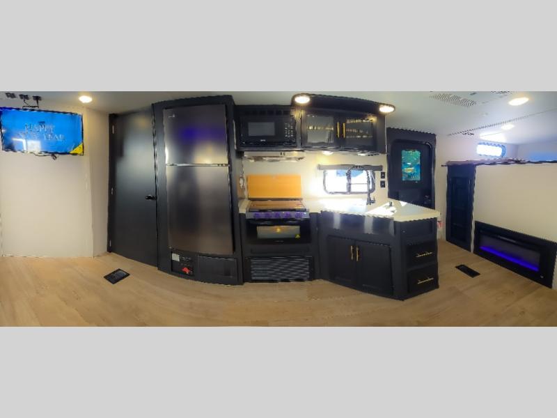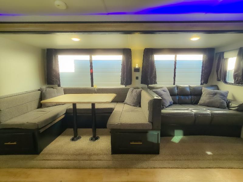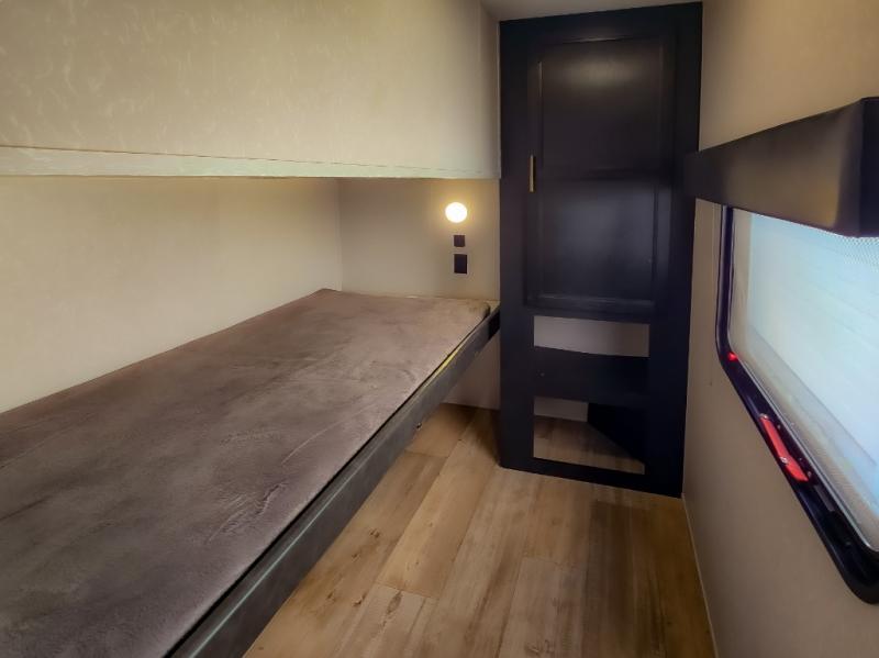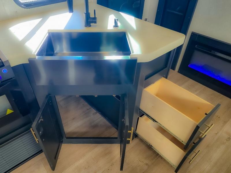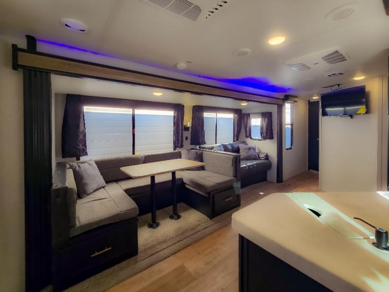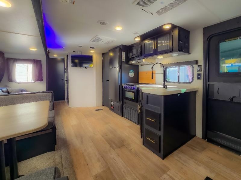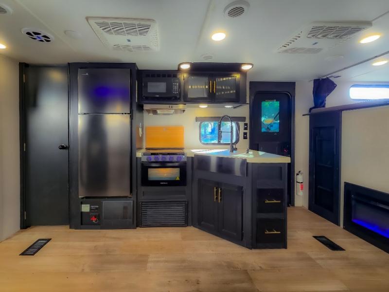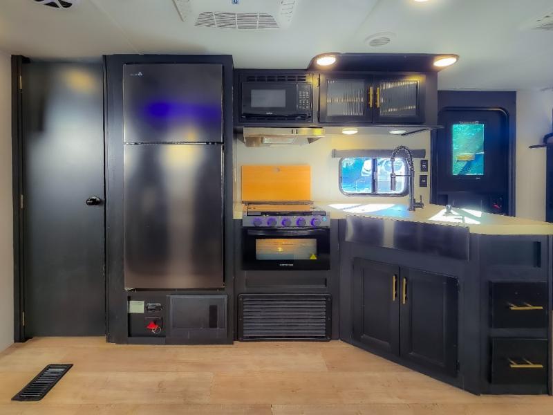 Escape your ordinary life with this innovative travel trailer! It features 64" top bunk bed above a 36" bottom bunk with wardrobes on either side of them, plus there is a wall at the foot of the beds with a fireplace on the other side. You will have your own privacy with the front private bedroom that has a walk around queen bed with wardrobes on either side and an entrance into the dual entry bathroom which has a radius shower to freshen up in each morning. The sofa and U-shaped dinette can also transform into extra sleeping spaces when you aren't using them to enjoy a meal or relax in front of the TV mount. The outdoor bar and grill comes with an exclusive side by side 3.2 cu. ft. refrigerator and freezer, a pull out two burner cooktop, a standalone ice maker, and a sink with an overhead cabinet with shelf for your cooking essentials. You even have a rear storage rack and outside storage areas to store your outdoor gear!