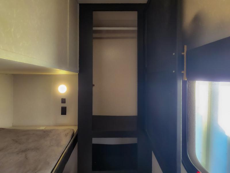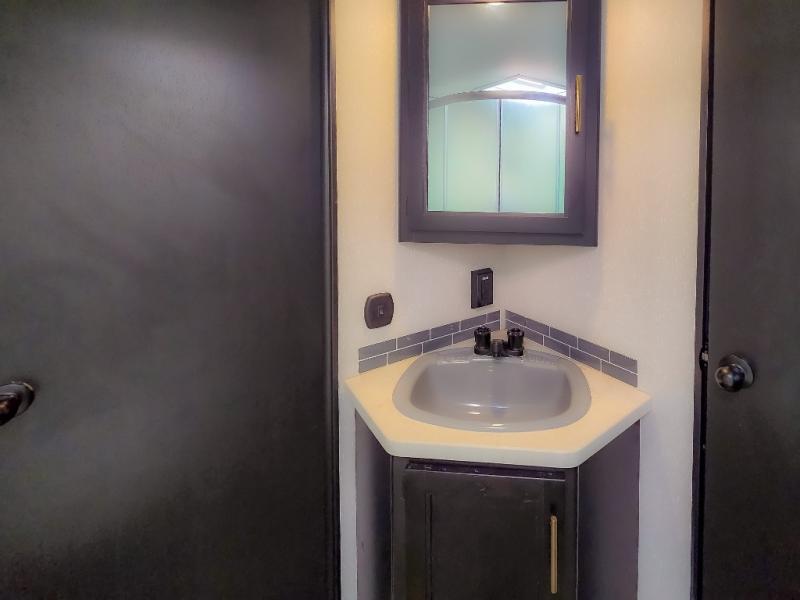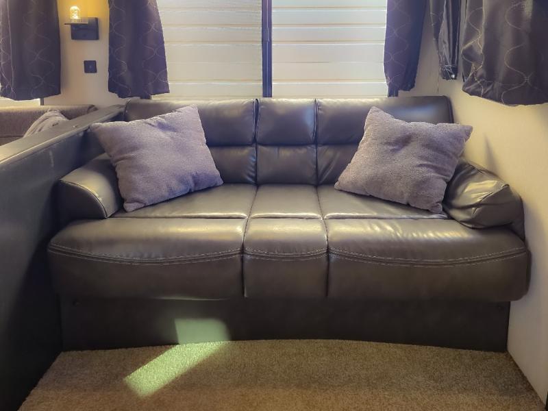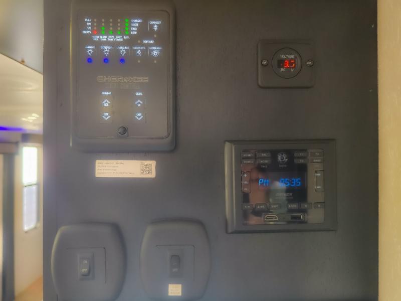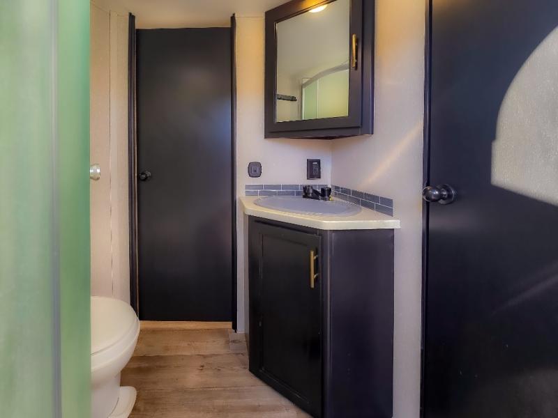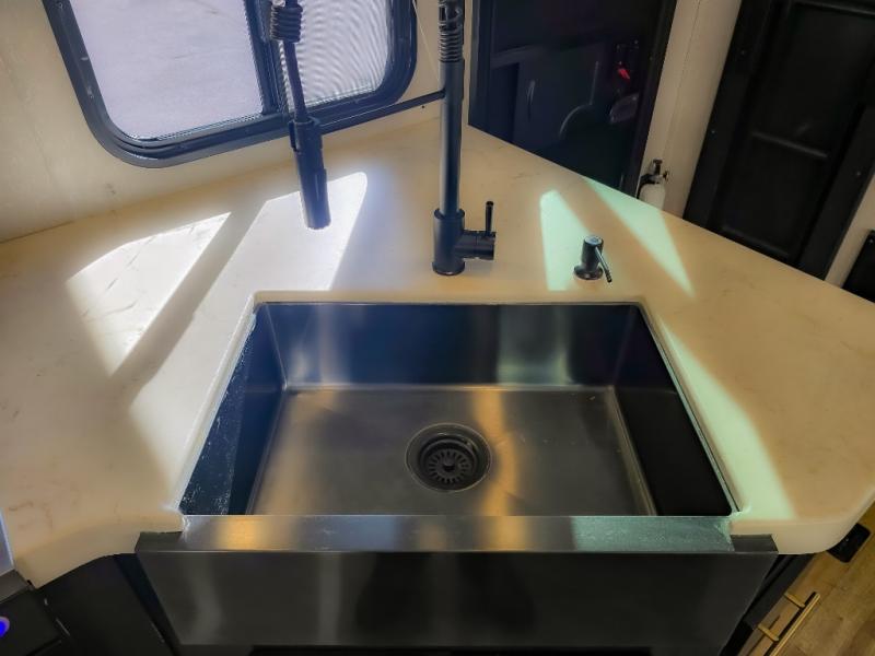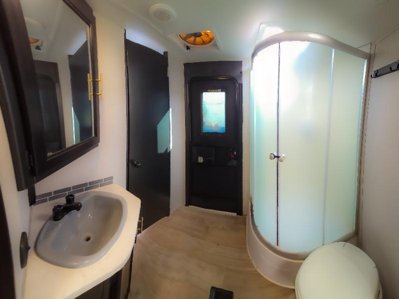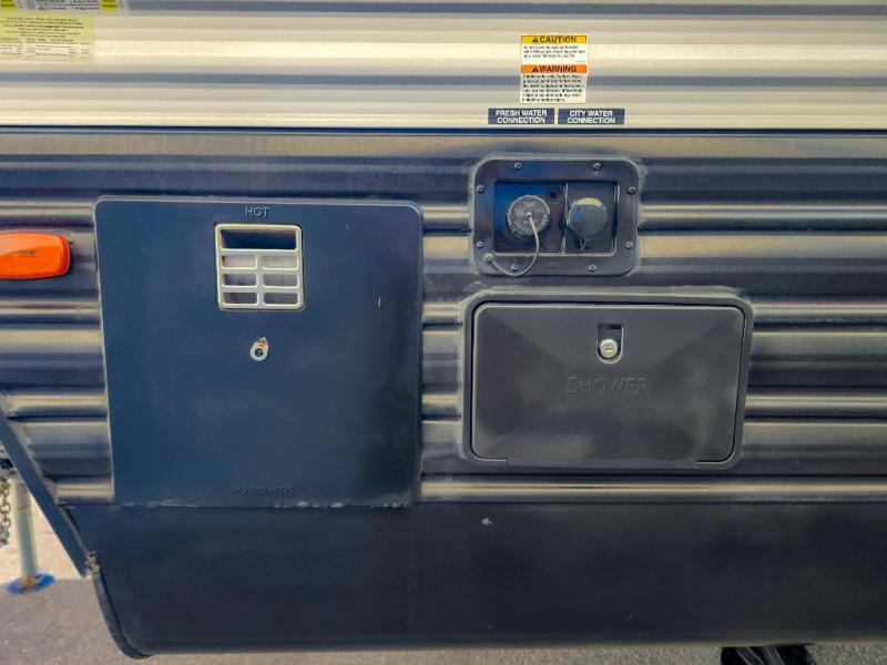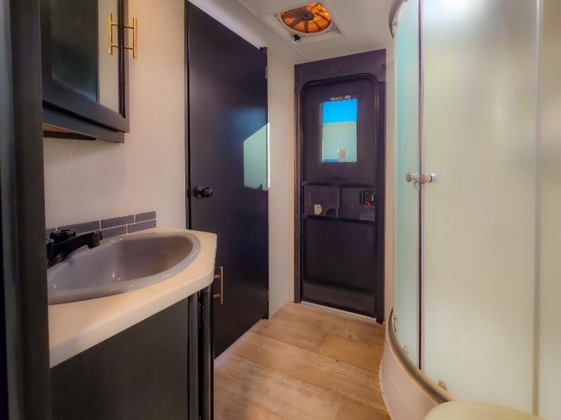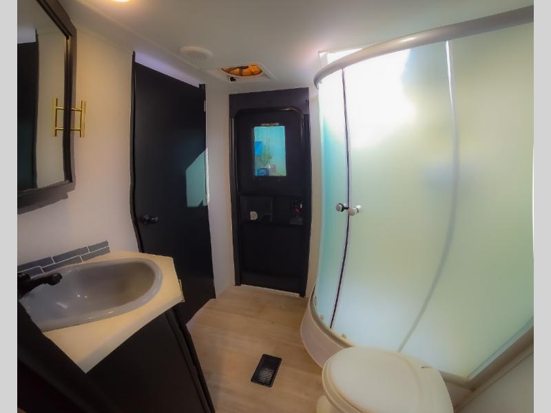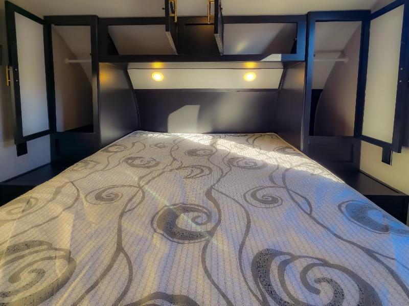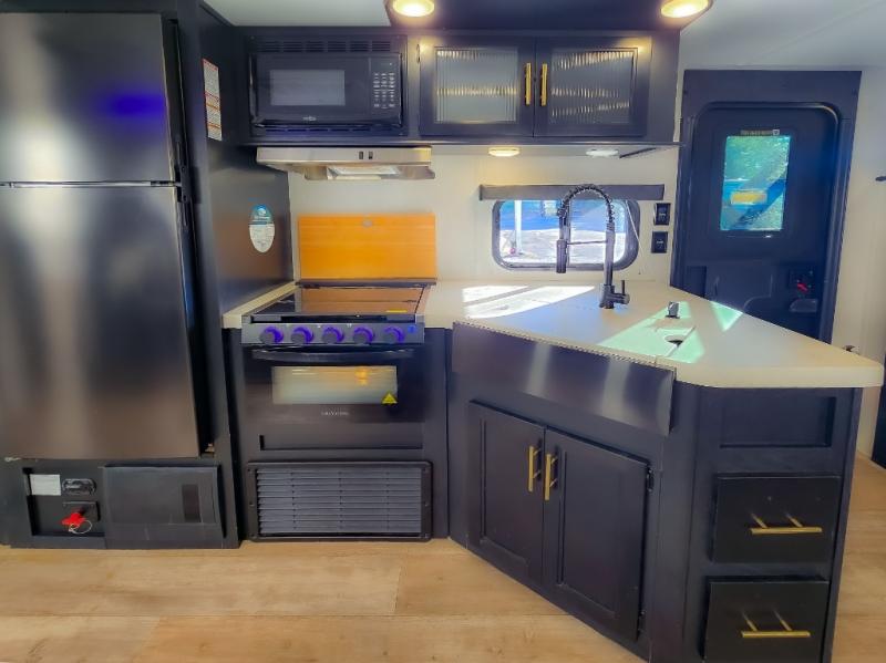 Escape your ordinary life with this innovative travel trailer! It features 64" top bunk bed above a 36" bottom bunk with wardrobes on either side of them, plus there is a wall at the foot of the beds with a fireplace on the other side. You will have your own privacy with the front private bedroom that has a walk around queen bed with wardrobes on either side and an entrance into the dual entry bathroom which has a radius shower to freshen up in each morning. The sofa and U-shaped dinette can also transform into extra sleeping spaces when you aren't using them to enjoy a meal or relax in front of the TV mount. The outdoor bar and grill comes with an exclusive side by side 3.2 cu. ft. refrigerator and freezer, a pull out two burner cooktop, a standalone ice maker, and a sink with an overhead cabinet with shelf for your cooking essentials. You even have a rear storage rack and outside storage areas to store your outdoor gear!