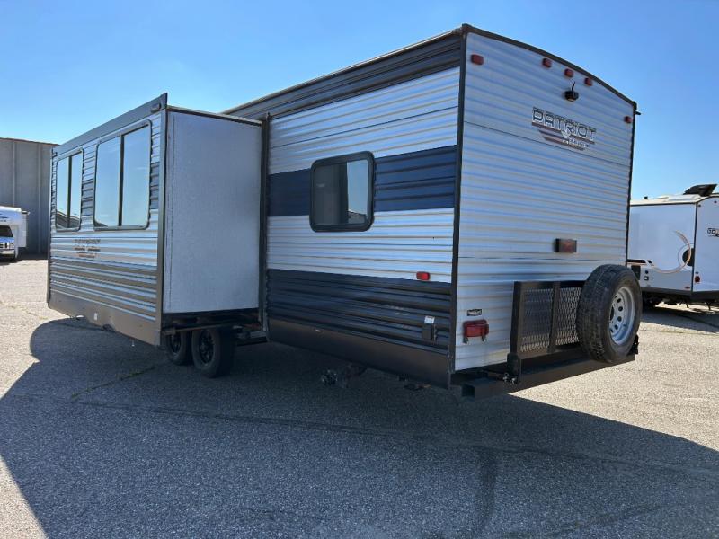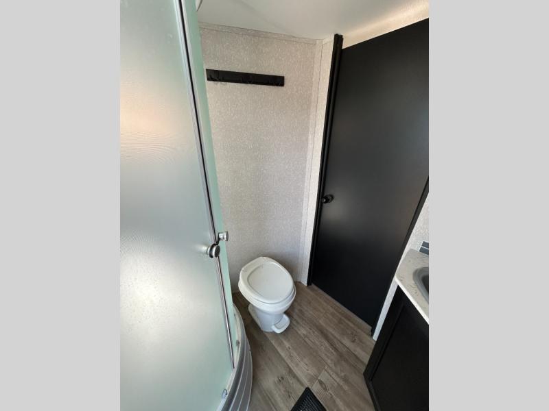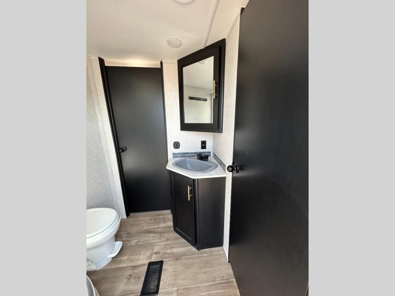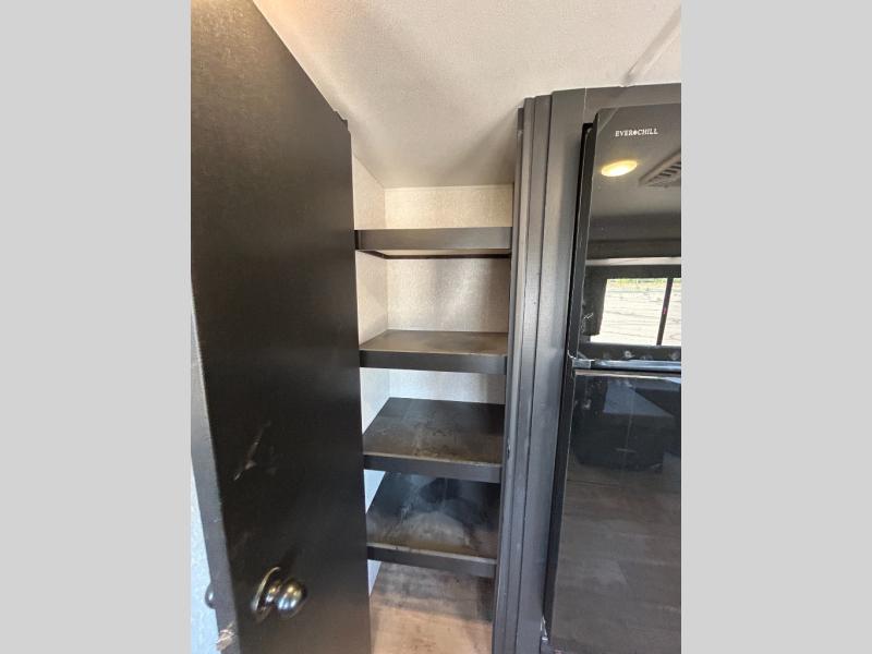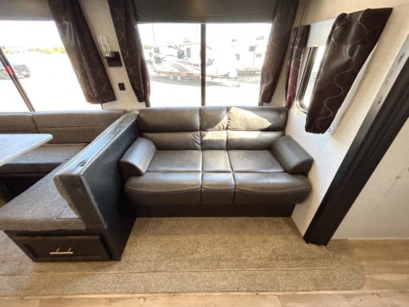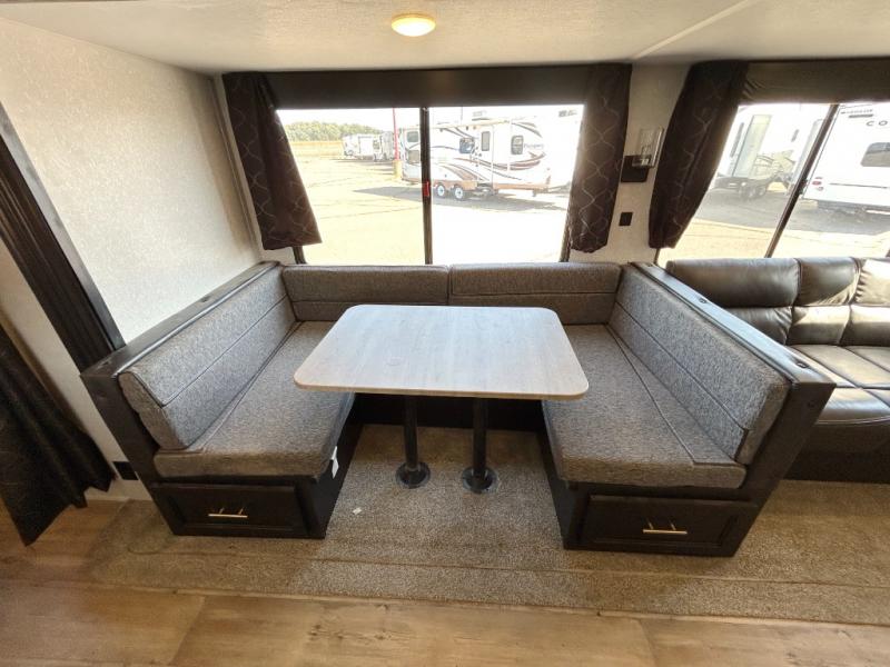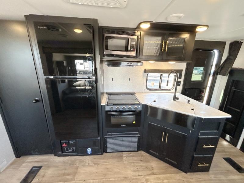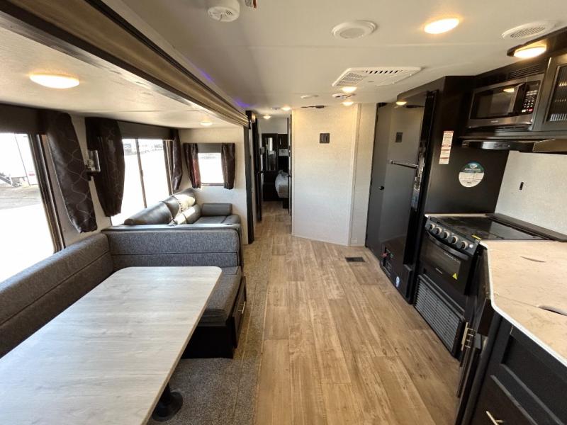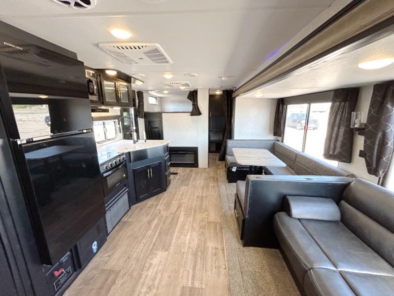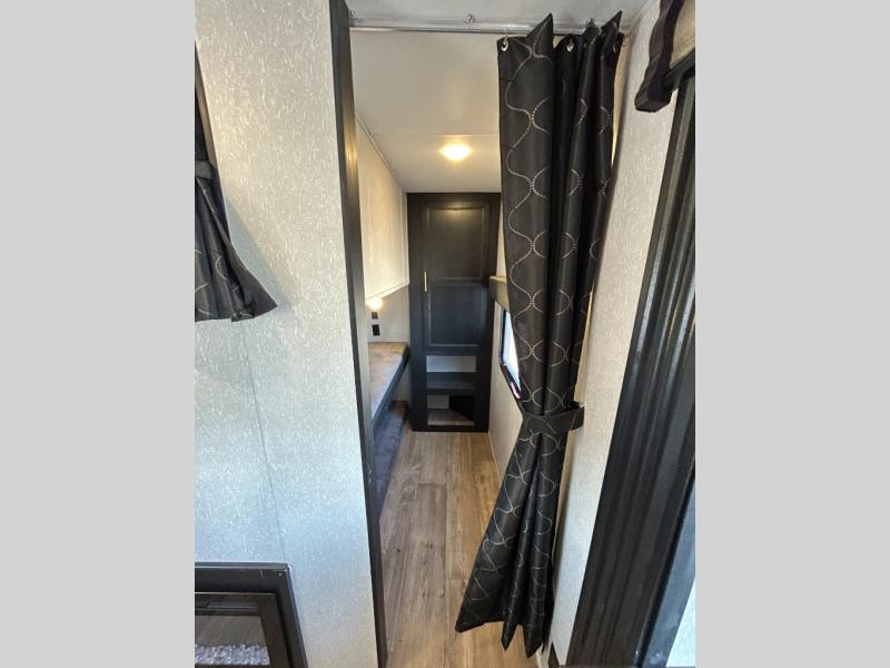 Escape your ordinary life with this innovative travel trailer! It features 64" top bunk bed above a 36" bottom bunk with wardrobes on either side of them, plus there is a wall at the foot of the beds with a fireplace on the other side. You will have your own privacy with the front private bedroom that has a walk around queen bed with wardrobes on either side and an entrance into the dual entry bathroom which has a radius shower to freshen up in each morning. The sofa and U-shaped dinette can also transform into extra sleeping spaces when you aren't using them to enjoy a meal or relax in front of the TV mount. The outdoor bar and grill comes with an exclusive side by side 3.2 cu. ft. refrigerator and freezer, a pull out two burner cooktop, a standalone ice maker, and a sink with an overhead cabinet with shelf for your cooking essentials. You even have a rear storage rack and outside storage areas to store your outdoor gear!