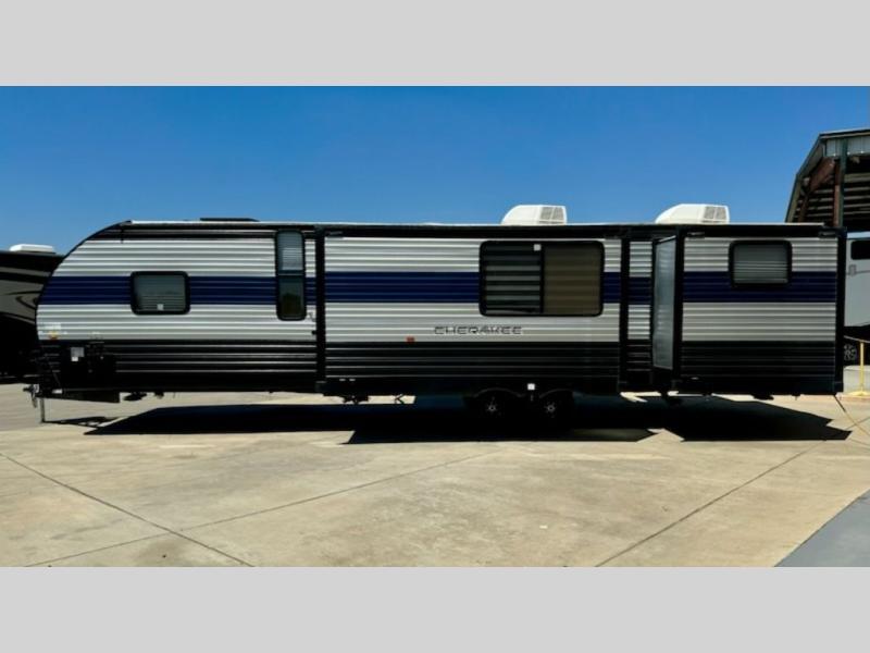 If the open road is calling your name, then answer it with one of these Forest River Cherokee travel trailers or toy haulers! A seamless roofing membrane with heat reflectivity covers these units and an armored underbelly tank enclosure protects it from road debris. The Power Gear frame technology holds them together and also comes with a space saver rail design. An outside shower with hot and cold water helps to keep the dirt outside where it belongs. With the Campfire package, you will get a beautiful entertainment center to watch your favorite movies, a sink cover for more prepping space, and a 6 gallon DSI gas/electric water heater for hot showers each morning. The Cherokee Total Control app and remote control system allows you to control your unit at the touch of a finger. A few other features you will appreciate include a super kitchen, USB charging station, and light filtering sheer shading premium blackout zebra shades for added privacy. Come find your favorite model today!