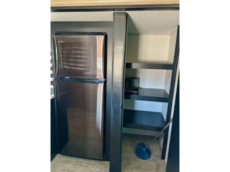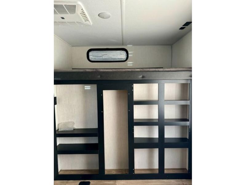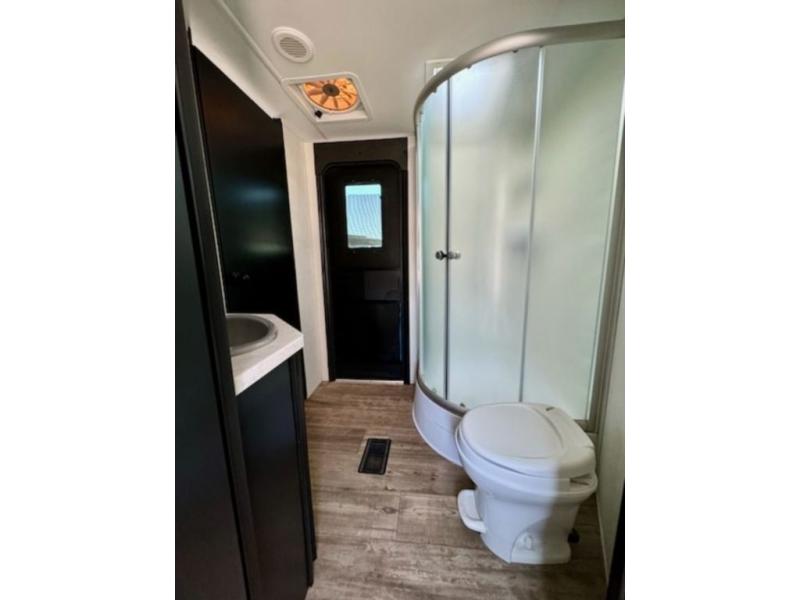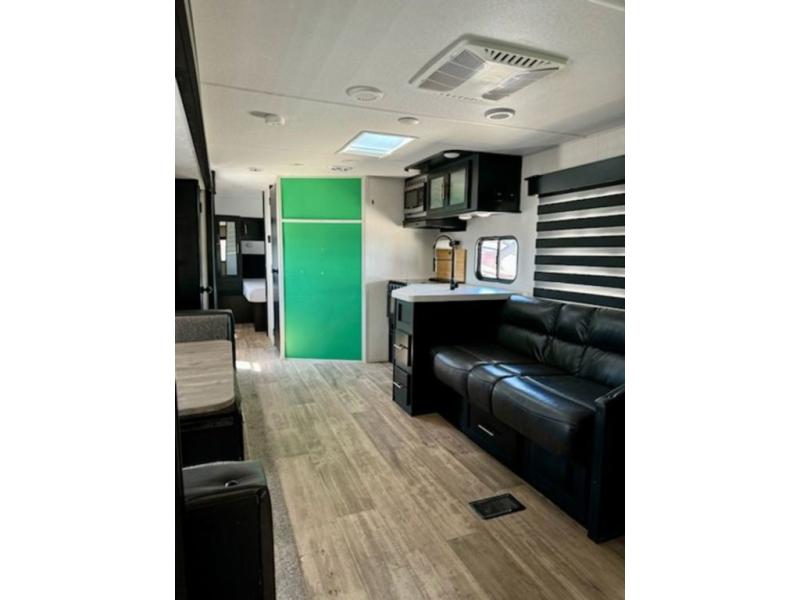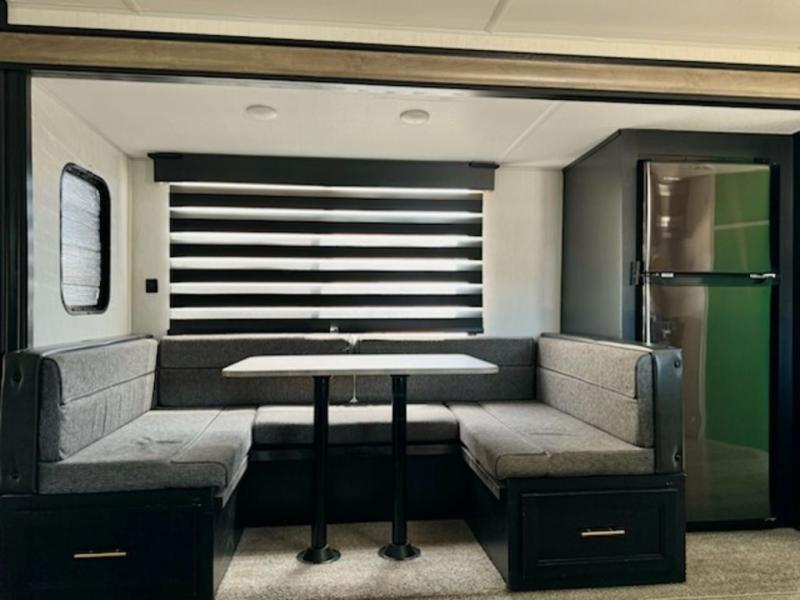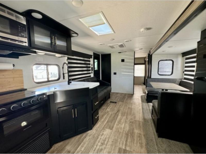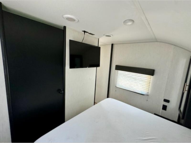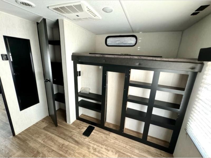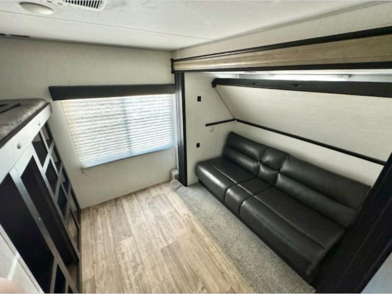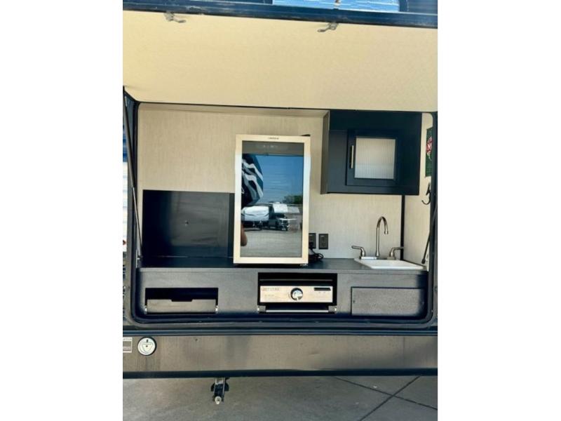 The whole family will love camping in this travel trailer! The kiddos or guests will have their own privacy with the rear private bunkhouse which has a bunk, a linen closet, and a flip up bunk above a sofa slide. And you will have your own privacy with the front private bedroom with a queen bed that has wardrobes on either side, a TV mount area, and an entrance into the dual entry bathroom. The bathroom also has one of the dual entry doors to the unit so you can get back to having fun outside fast. The kitchen has everything you need to prepare your best meals, and there is even an outside kitchen with a 3.2 cu. ft. refrigerator, a sink, and a pull out stove top to cook pancakes while watching the sunrise. Plus, an outside TV mount area to watch the big game under the stars!