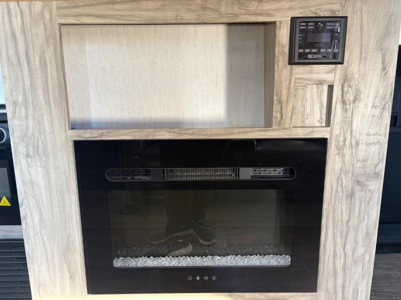 Looking for the perfect trailer for two with a spacious bathroom and bedroom? This Alpha Wolf provides a rear oversized bathroom complete with linen storage and a barn-style door that saves space and looks great. The front bedroom includes a walk-around queen bed, dual shirt closets and nightstands, a farm-style door plus windows for natural lighting and great views. The main living and kitchen area is spacious as well with a slide out that includes home theatre seating with removable dinner trays and cupholders plus heat, light and massage function, a residential refrigerator for lots of cold storage and a pantry for your snacks and such. Everyone will love the fireplace and cozy ambiance. The cook will appreciate the extra floor space provided by the slide when using all of the kitchen amenities including a farm-style sink, walk-in pantry, and butcher block style cutting board.