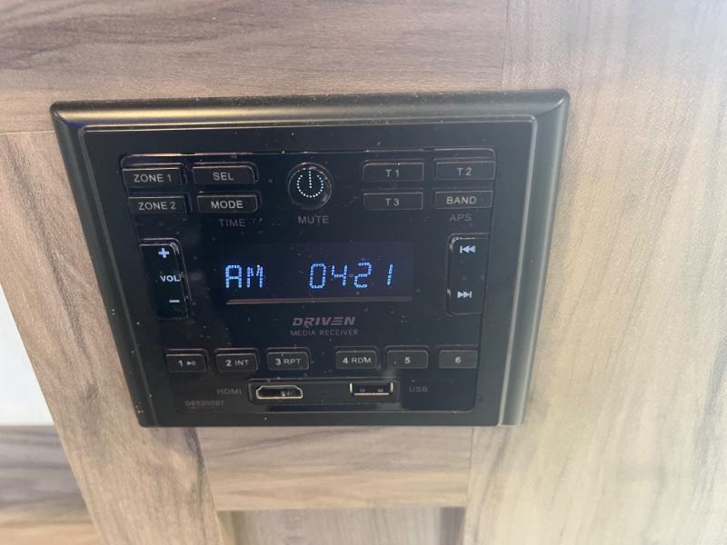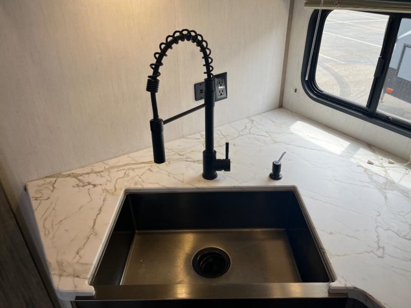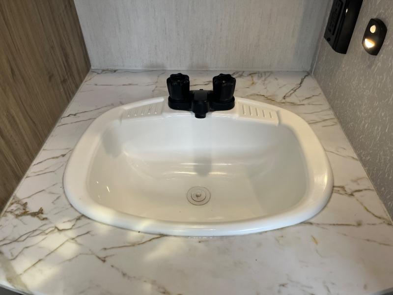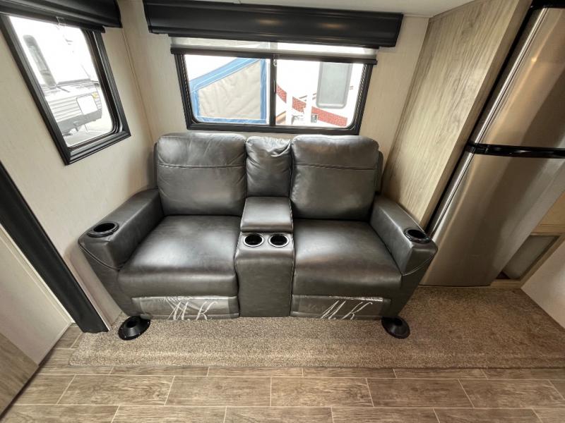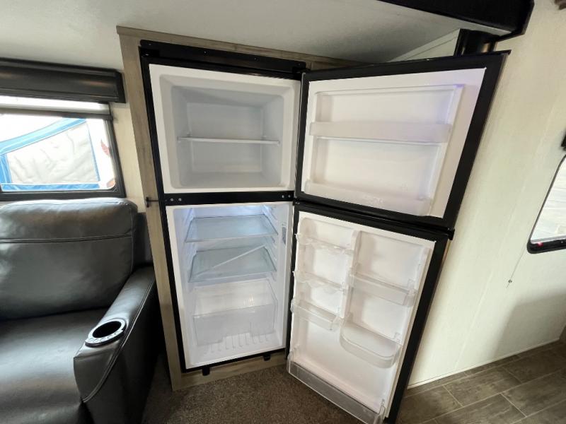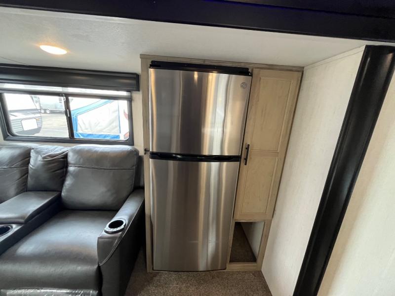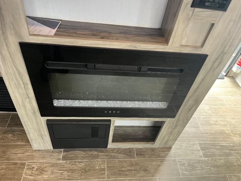 Looking for the perfect trailer for two with a spacious bathroom and bedroom? This Alpha Wolf provides a rear oversized bathroom complete with linen storage and a barn-style door that saves space and looks great. The front bedroom includes a walk-around queen bed, dual shirt closets and nightstands, a farm-style door plus windows for natural lighting and great views. The main living and kitchen area is spacious as well with a slide out that includes home theatre seating with removable dinner trays and cupholders plus heat, light and massage function, a residential refrigerator for lots of cold storage and a pantry for your snacks and such. Everyone will love the fireplace and cozy ambiance. The cook will appreciate the extra floor space provided by the slide when using all of the kitchen amenities including a farm-style sink, walk-in pantry, and butcher block style cutting board.