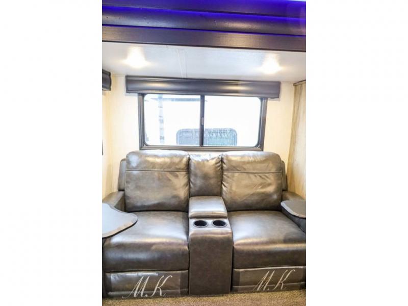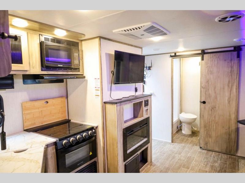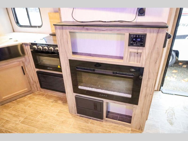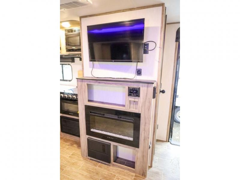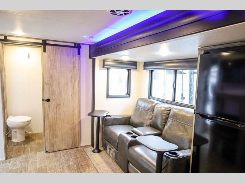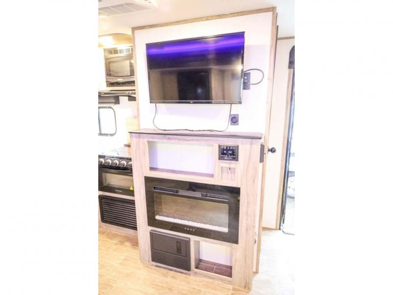Looking for the perfect trailer for two with a spacious bathroom and bedroom? This Alpha Wolf provides a rear oversized bathroom complete with linen storage and a barn-style door that saves space and looks great. The front bedroom includes a walk-around queen bed, dual shirt closets and nightstands, a farm-style door plus windows for natural lighting and great views. The main living and kitchen area is spacious as well with a slide out that includes home theatre seating with removable dinner trays and cupholders plus heat, light and massage function, a residential refrigerator for lots of cold storage and a pantry for your snacks and such. Everyone will love the fireplace and cozy ambiance. The cook will appreciate the extra floor space provided by the slide when using all of the kitchen amenities including a farm-style sink, walk-in pantry, and butcher block style cutting board.