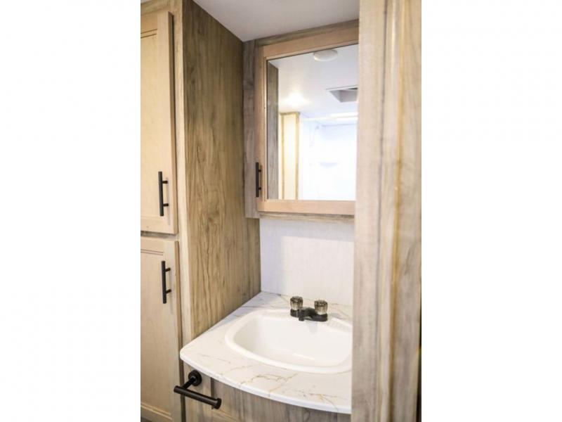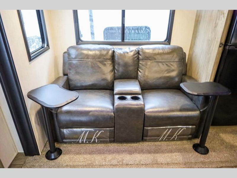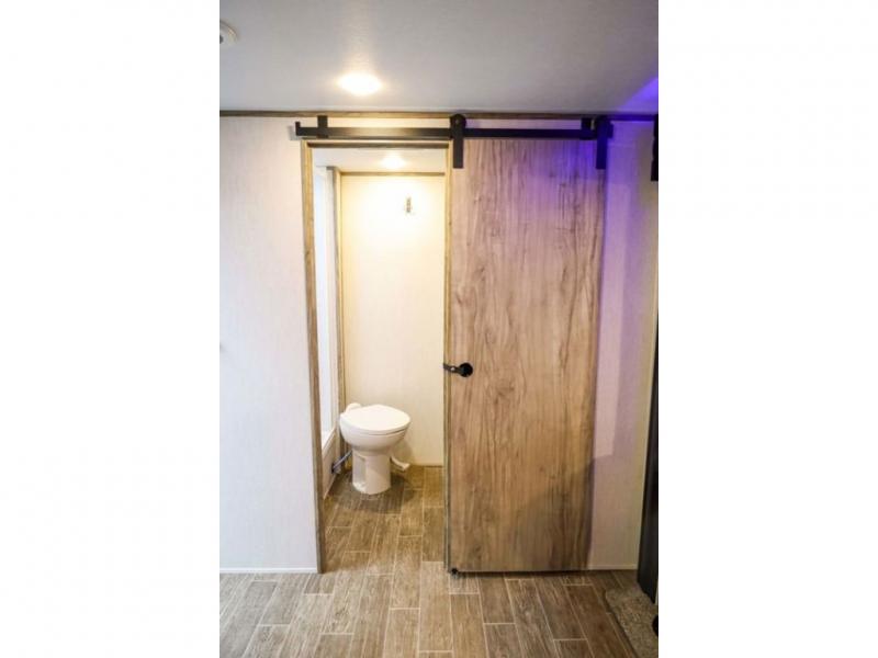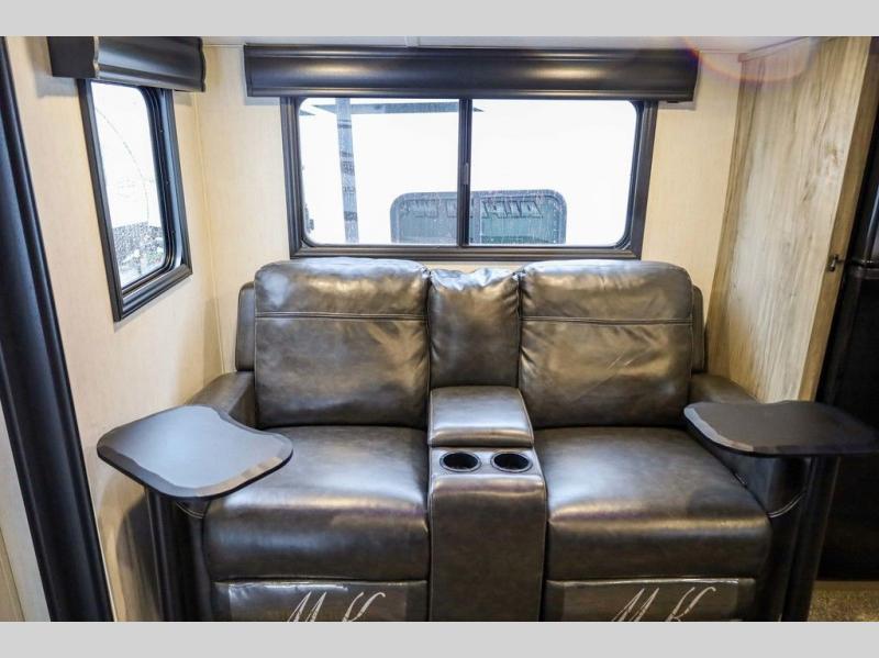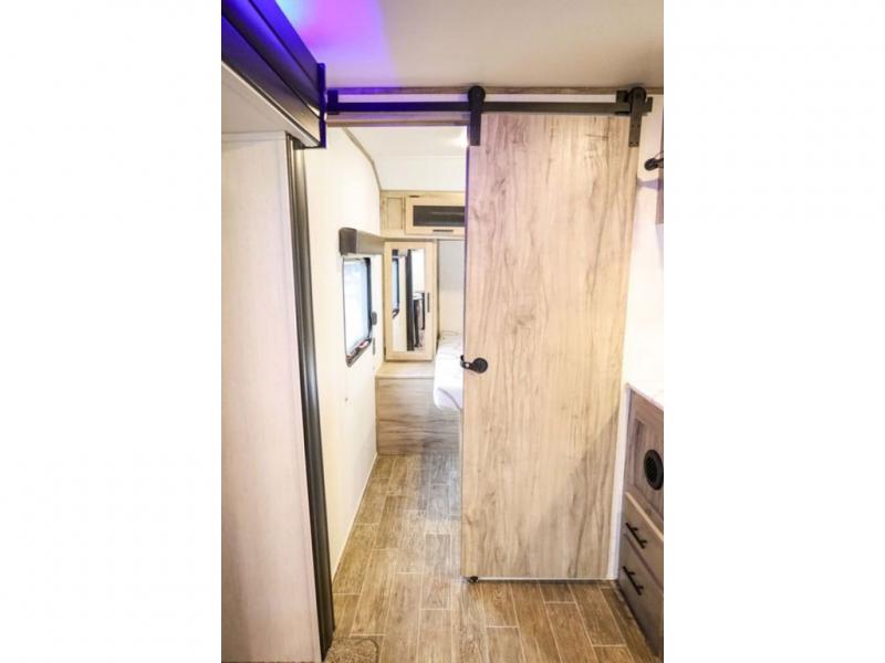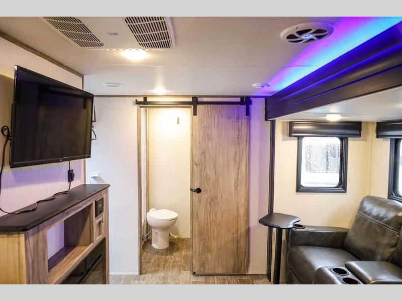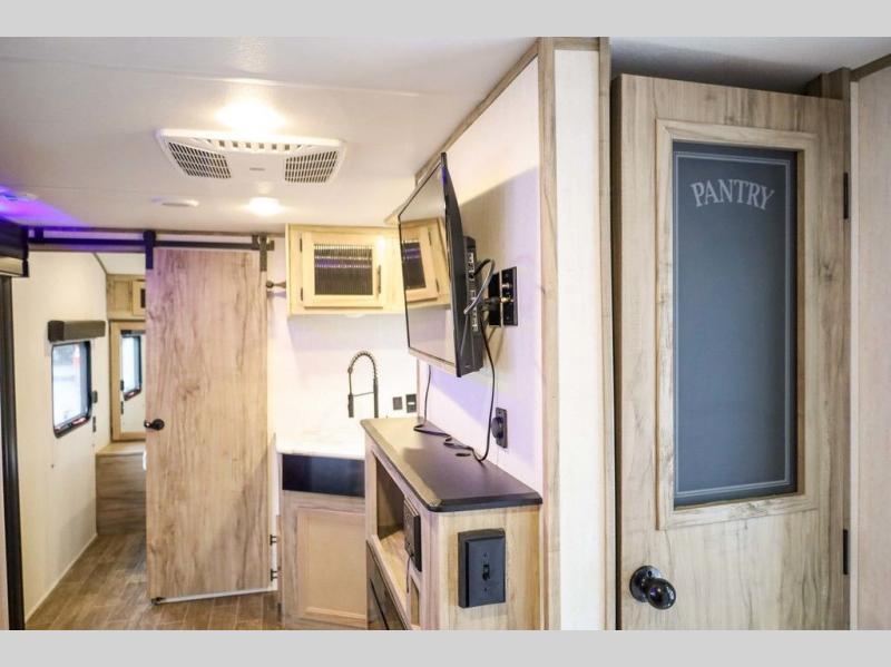 Looking for the perfect trailer for two with a spacious bathroom and bedroom? This Alpha Wolf provides a rear oversized bathroom complete with linen storage and a barn-style door that saves space and looks great. The front bedroom includes a walk-around queen bed, dual shirt closets and nightstands, a farm-style door plus windows for natural lighting and great views. The main living and kitchen area is spacious as well with a slide out that includes home theatre seating with removable dinner trays and cupholders plus heat, light and massage function, a residential refrigerator for lots of cold storage and a pantry for your snacks and such. Everyone will love the fireplace and cozy ambiance. The cook will appreciate the extra floor space provided by the slide when using all of the kitchen amenities including a farm-style sink, walk-in pantry, and butcher block style cutting board.