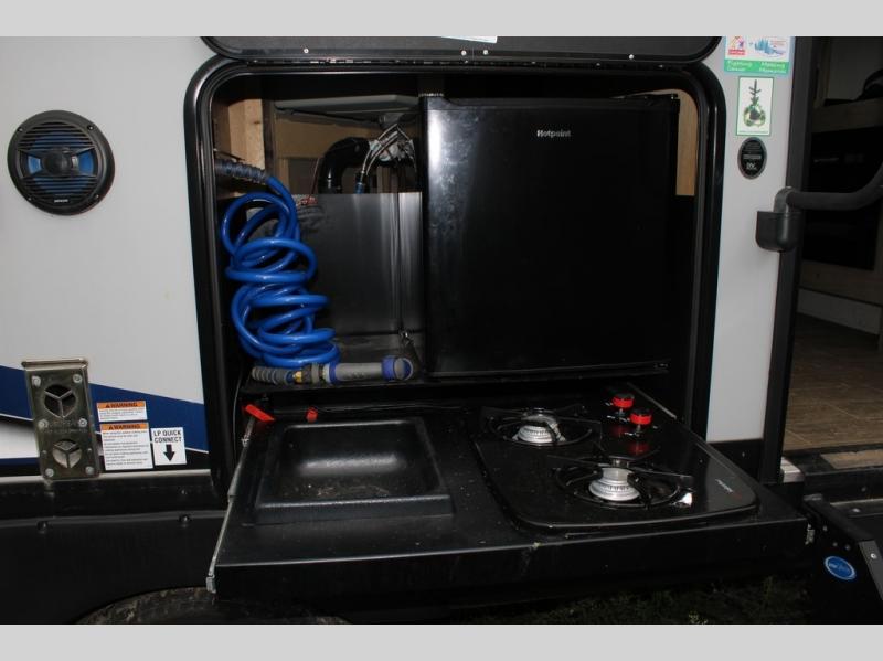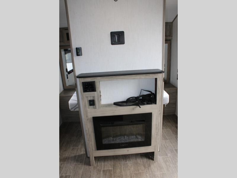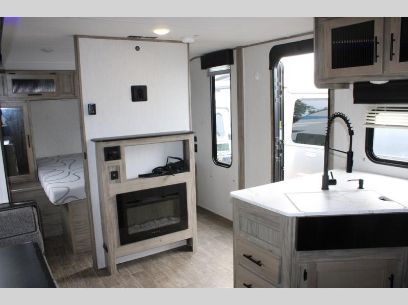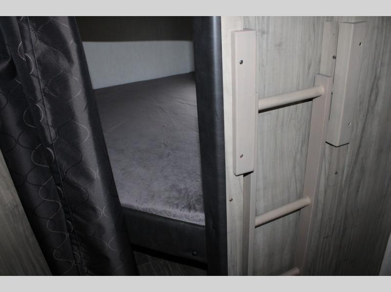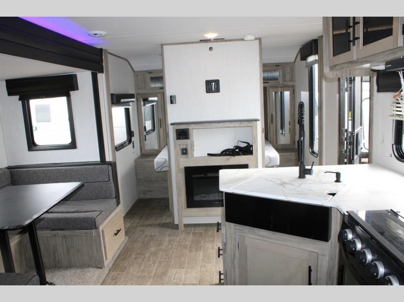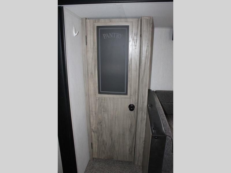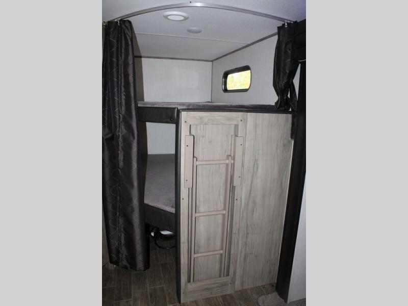 Get ready for fun with your group in this multi-sleeper trailer that offers double-sized bunks with a ladder next to a full bathroom which features a second exterior entry door for convenience when hanging outside under the 20' exterior awning. The camp chef will appreciate a deluxe outside kitchen, and full the full pass-through storage will make it easy to keep things neatly tucked away when not in use. Back inside, there is a super U-dinette for dining, playing games and this furniture provides extra sleeping space as well. You will also find a walk-in pantry and full kitchen amenities including a farm-style sink, a residential refrigerator, and a butcher block cutting board. The fireplace is another highlight in the main area, and the double entry bedroom takes you into your own space to sleep like a queen.
