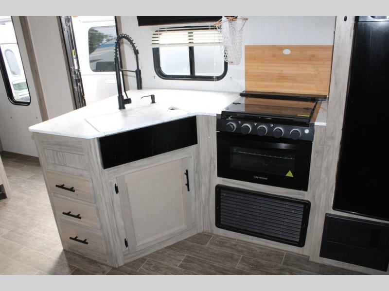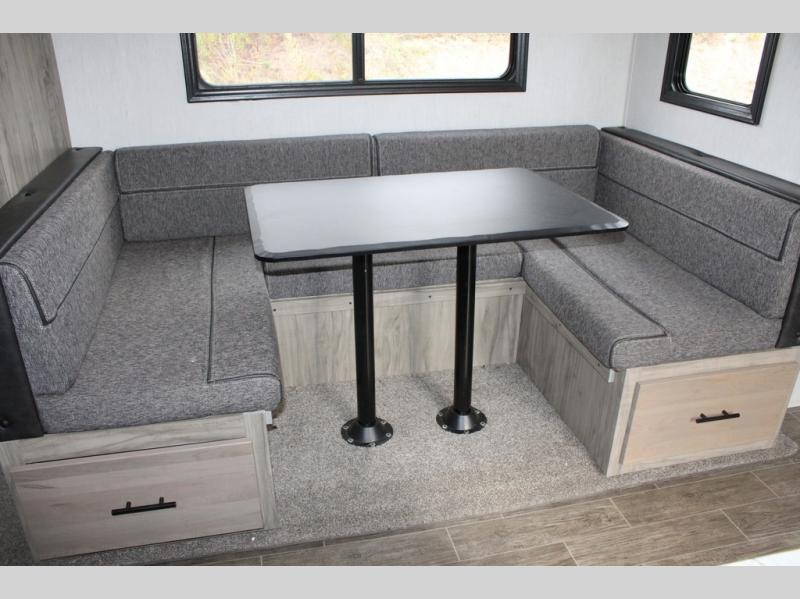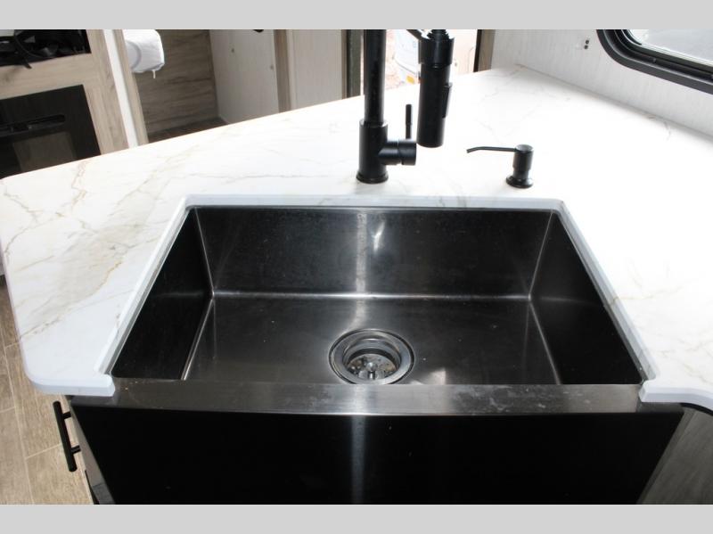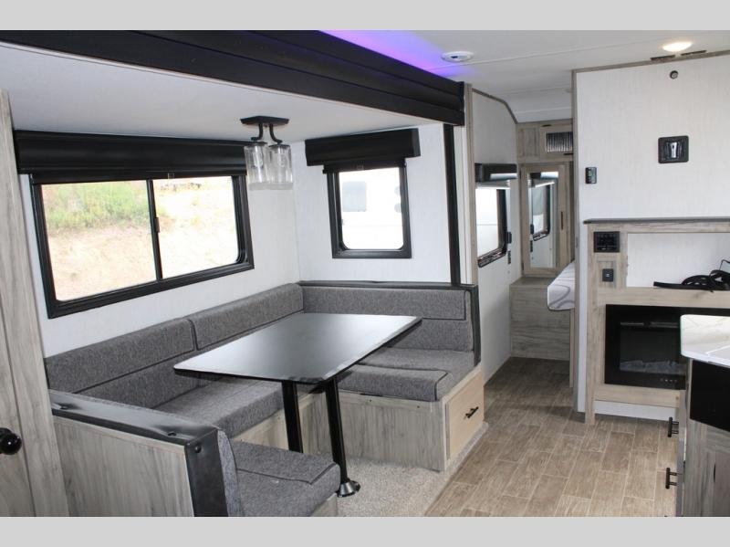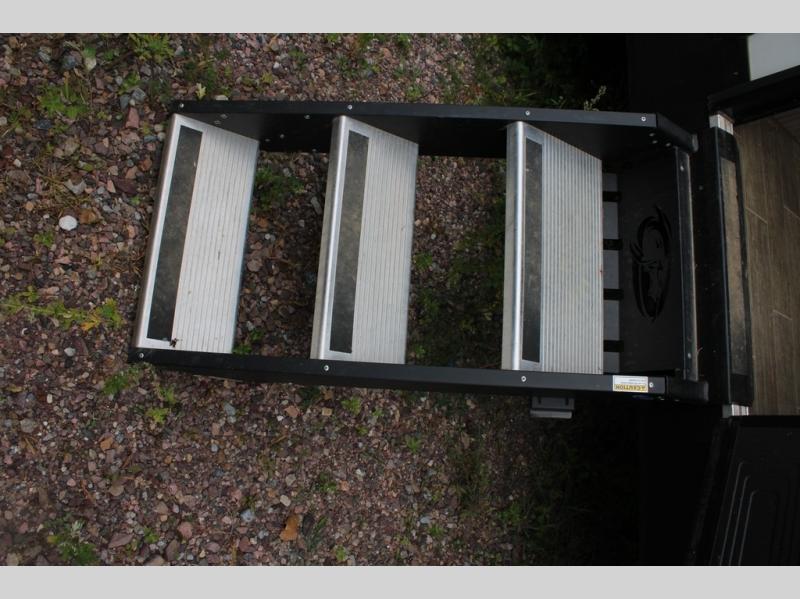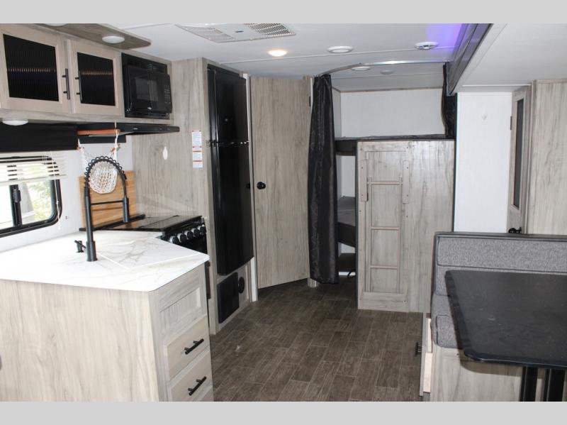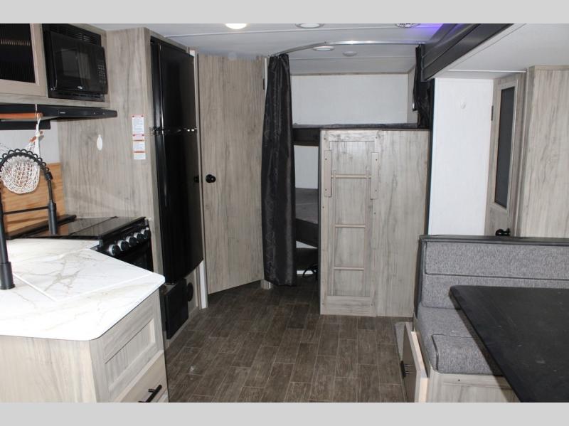 Get ready for fun with your group in this multi-sleeper trailer that offers double-sized bunks with a ladder next to a full bathroom which features a second exterior entry door for convenience when hanging outside under the 20' exterior awning. The camp chef will appreciate a deluxe outside kitchen, and full the full pass-through storage will make it easy to keep things neatly tucked away when not in use. Back inside, there is a super U-dinette for dining, playing games and this furniture provides extra sleeping space as well. You will also find a walk-in pantry and full kitchen amenities including a farm-style sink, a residential refrigerator, and a butcher block cutting board. The fireplace is another highlight in the main area, and the double entry bedroom takes you into your own space to sleep like a queen.