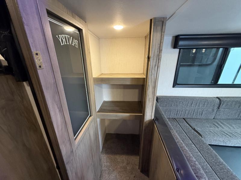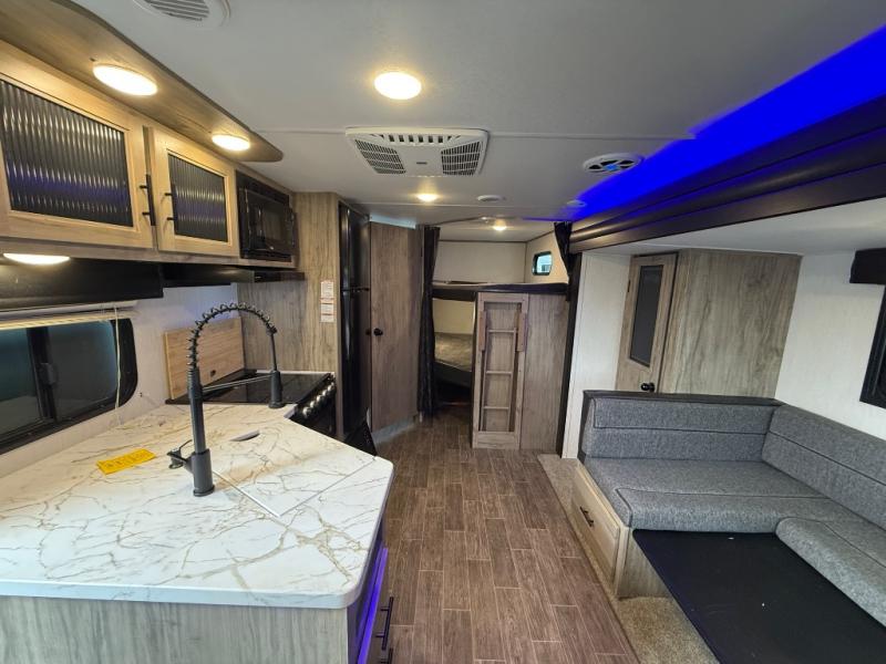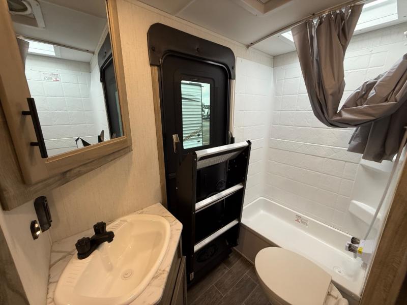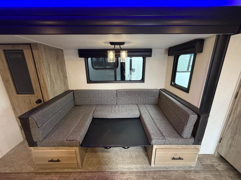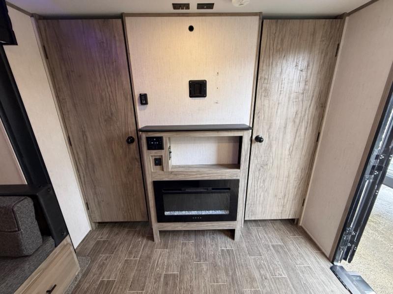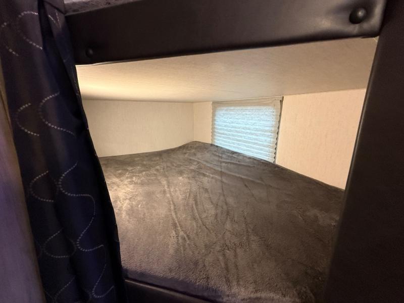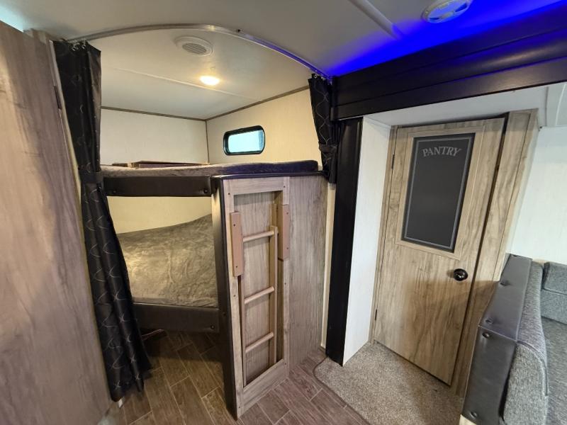 Get ready for fun with your group in this multi-sleeper trailer that offers double-sized bunks with a ladder next to a full bathroom which features a second exterior entry door for convenience when hanging outside under the 20' exterior awning. The camp chef will appreciate a deluxe outside kitchen, and full the full pass-through storage will make it easy to keep things neatly tucked away when not in use. Back inside, there is a super U-dinette for dining, playing games and this furniture provides extra sleeping space as well. You will also find a walk-in pantry and full kitchen amenities including a farm-style sink, a residential refrigerator, and a butcher block cutting board. The fireplace is another highlight in the main area, and the double entry bedroom takes you into your own space to sleep like a queen.