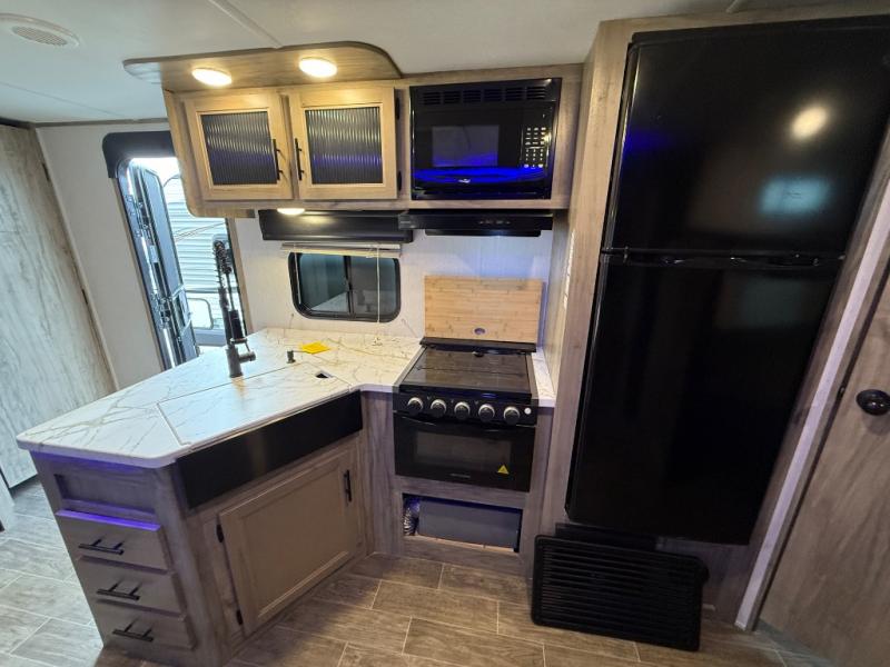 With every Forest River Cherokee Alpha Wolf travel trailer, you can enjoy off-grid camping with the Juice Pack solar power feature which includes a 50W roof mount panel, Series 27 battery, battery disconnect and box, volt meter and 30 Amp solar charger. The Juice Pack will continuously charge your battery bank and power your entire 12V electrical system including your Cannon refrigerator. With good sun your refrigerator will run for 60+ hours. Some other highlights include Zebra shades in the main living area, a motion sensing night light in the bathroom, plus deluxe furniture and bedding including a super-plush Evergreen mattress for your comfort. Each unit is constructed using a one-piece fiberglass, gel-coated, front cap with LED strip lights, an engineered wood "SuperTruss" roof structure, and "ToughBend" rigid skirt metal making each Alpha Wolf more aerodynamic and having increased structural strength. Be the Alpha in your group, choose your very own Cherokee Alpha Wolf trailer today!