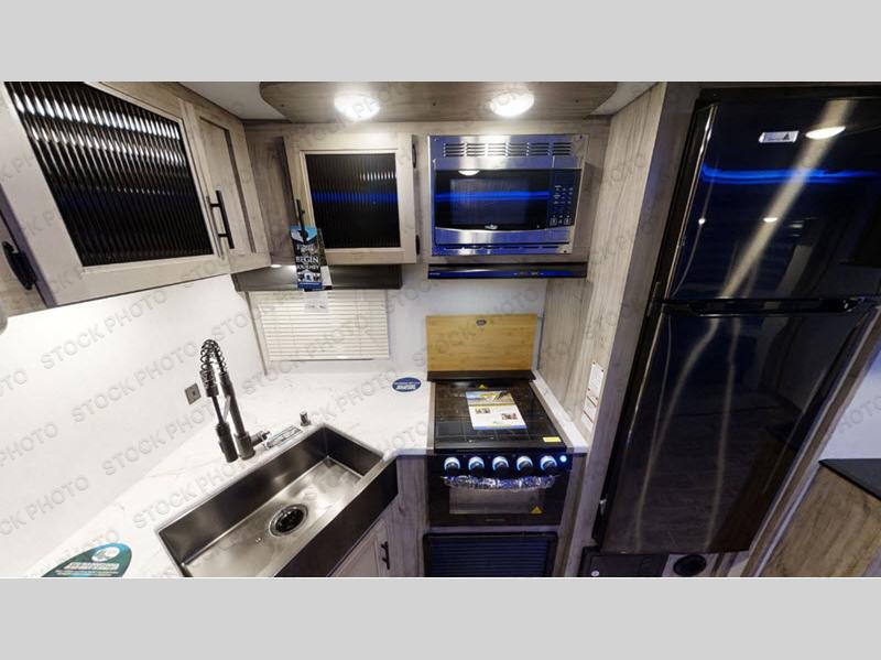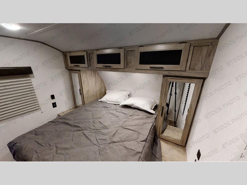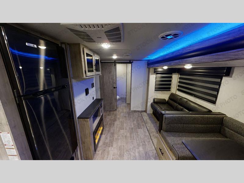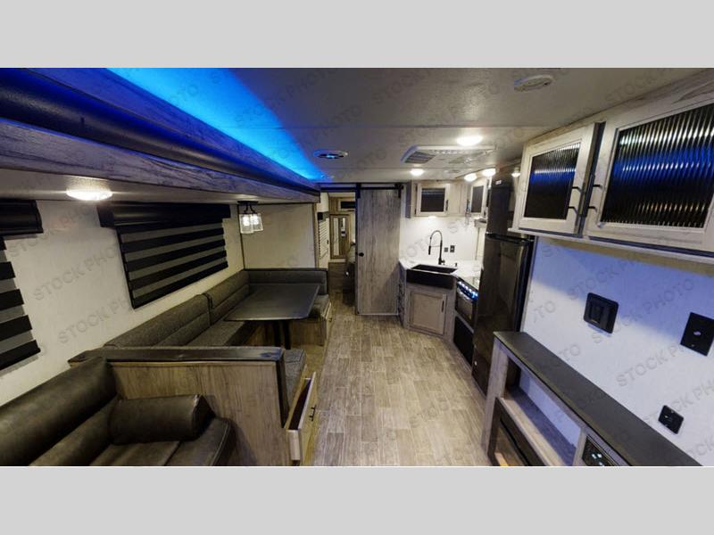 Whether you are a couple or family, this trailer will allow you to seek adventure and enjoy relaxation after hiking, fishing, and visiting with other RVers. The 20' exterior awning gives you an outdoor living area, the pass-through storage provides space for all your gear plus some, and the full outside kitchen includes a fridge/freezer, working sink, and cabinet storage. The interior is spacious thanks to the slide out in the main area that offers furniture to relax on, dine at, and even sleep on. You will also find an oversized rear bath with a barn-style entry door, and a robe/towel drop zone with linen storage above. The chef will love the walk-in pantry for non-perishables, the residential refrigerator, dual pots and pans drawers, and a farm-style sink. And the front bedroom offers an oasis through a barn-style door to enjoy a queen bed and clothing storage.