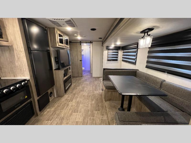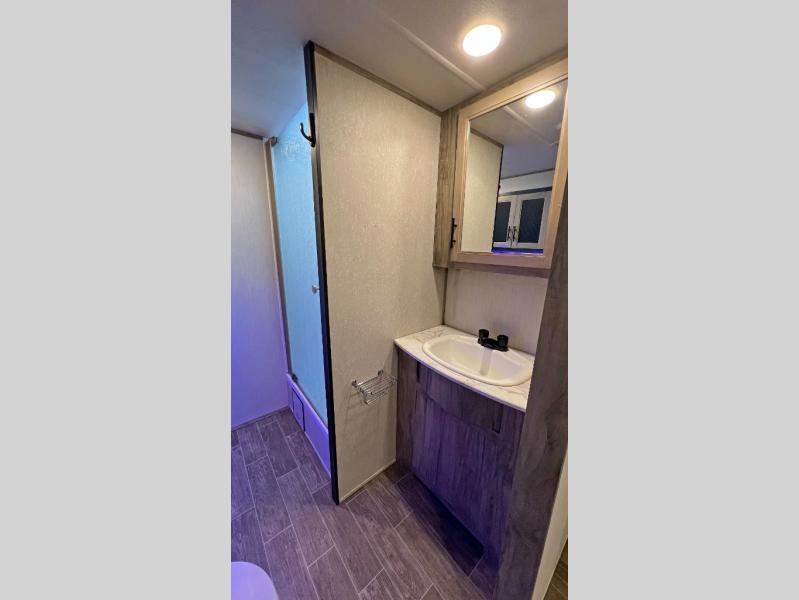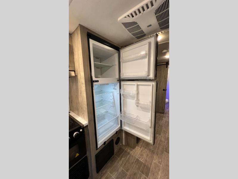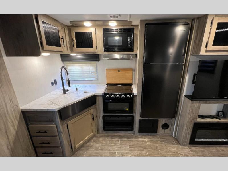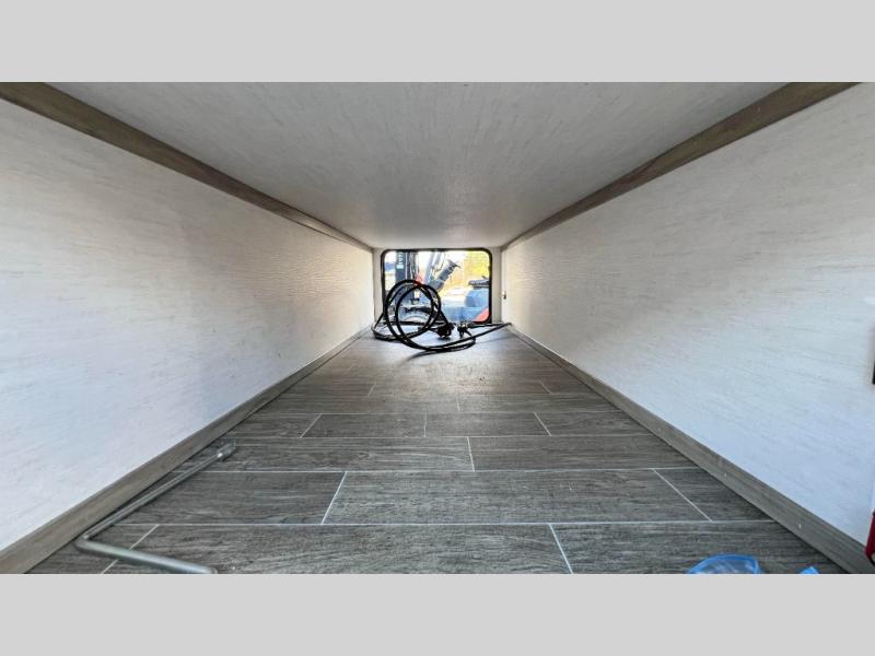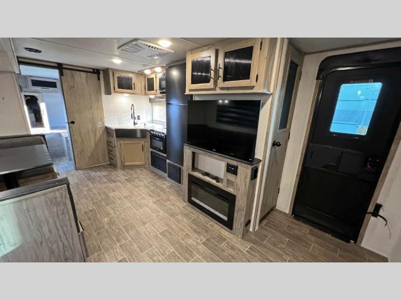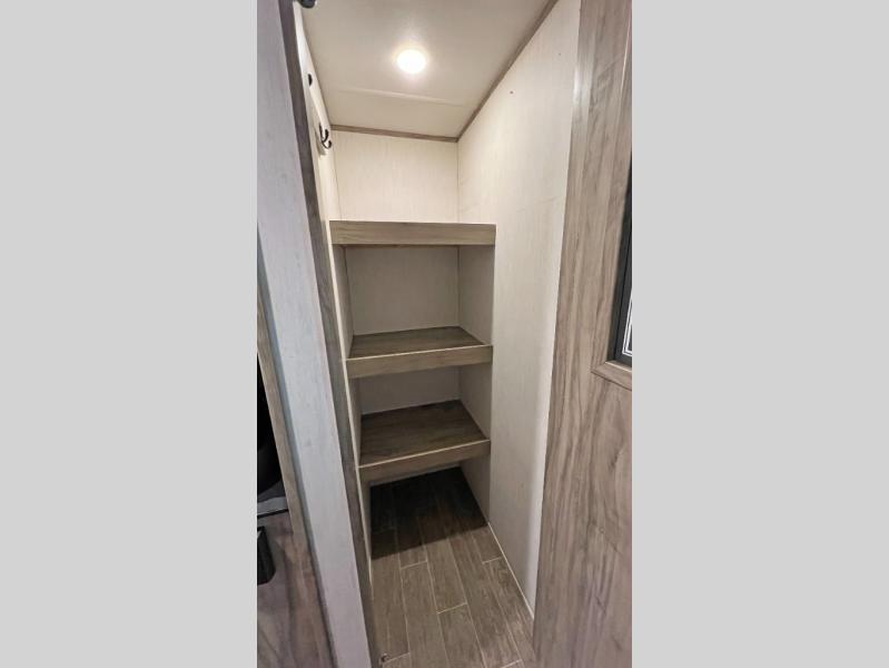 Whether you are a couple or family, this trailer will allow you to seek adventure and enjoy relaxation after hiking, fishing, and visiting with other RVers. The 20' exterior awning gives you an outdoor living area, the pass-through storage provides space for all your gear plus some. The interior is spacious thanks to the slide out in the main area that offers furniture to relax on, dine at, and even sleep on. You will also find an oversized rear bath with a barn-style entry door, and a robe/towel drop zone with linen storage above. The chef will love the walk-in pantry for non-perishables, the residential refrigerator, dual pots and pans drawers, and a farm-style sink. And the front bedroom offers an oasis through a barn-style door to enjoy a queen bed and clothing storage.