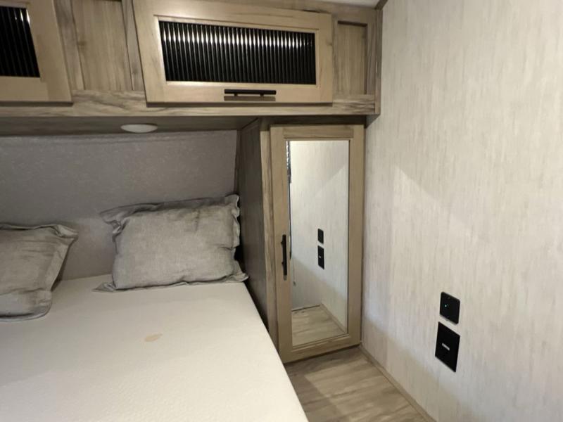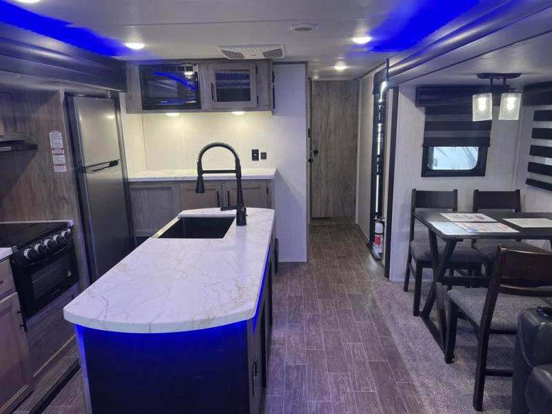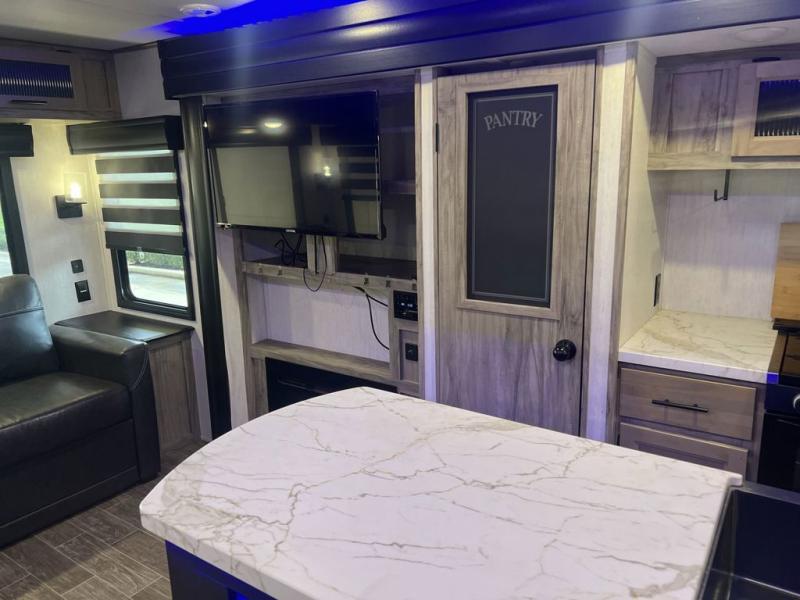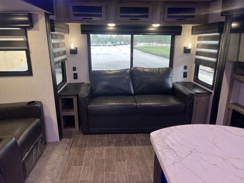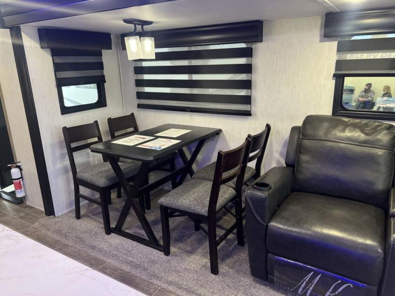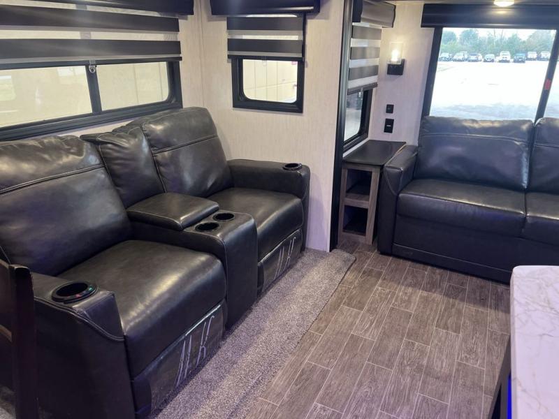 This trailer has it all for maximum comfort and convenience as well as entertainment! The rear living area includes a deluxe tri-fold hide-a-bed sofa with a panoramic rear window for great views of your campsite, and dual opposing slides widen this area so you can visit with friends while sitting on the home theatre seats with heat, light, and massage function with cupholders, and/or the free-standing table with two fixed and two folding chairs. Enjoy the fireplace on a cool night or when you want a little ambiance while seated inside. In the kitchen, the island will be handy for food prep and serving, and the unique coffee bar will be a favorite as well. Two patio awnings will provide an outdoor living area, just grab your camping chairs from the full pass-through storage. When you call it a night, fall quickly to sleep on the queen bed in the front bedroom with easy access to a dual entry bathroom which offers a radius shower with opaque glass doors.