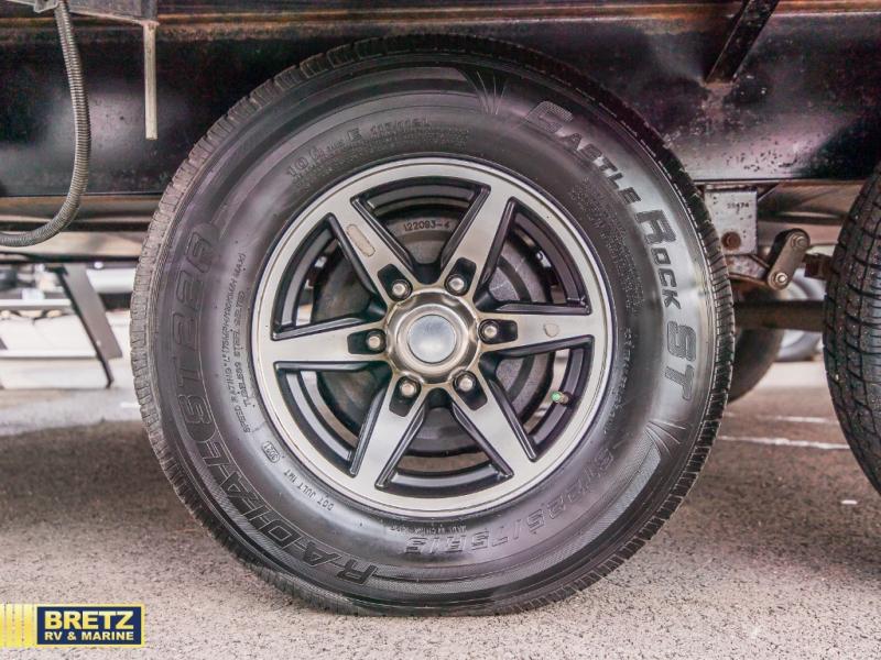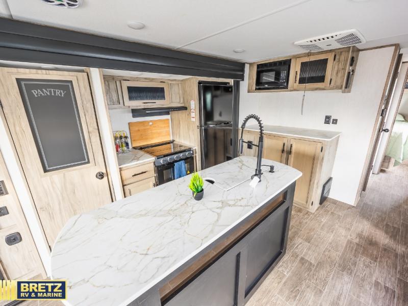 This trailer has it all for maximum comfort and convenience as well as entertainment! The rear living area includes a deluxe tri-fold hide-a-bed sofa with a panoramic rear window for great views of your campsite, and dual opposing slides widen this area so you can visit with friends while sitting on the home theatre seats with heat, light, and massage function with cupholders, and/or the free-standing table with two fixed and two folding chairs. Enjoy the fireplace on a cool night or when you want a little ambiance while seated inside. In the kitchen, the island will be handy for food prep and serving, and the unique coffee bar will be a favorite as well. Two patio awnings will provide an outdoor living area, just grab your camping chairs from the full pass-through storage. When you call it a night, fall quickly to sleep on the queen bed in the front bedroom with easy access to a dual entry bathroom which offers a radius shower with opaque glass doors.