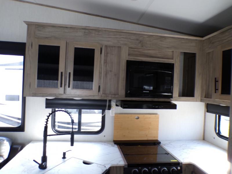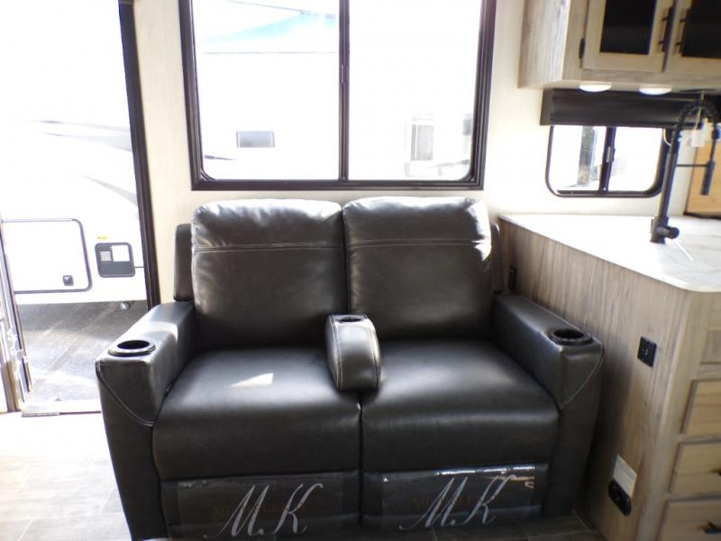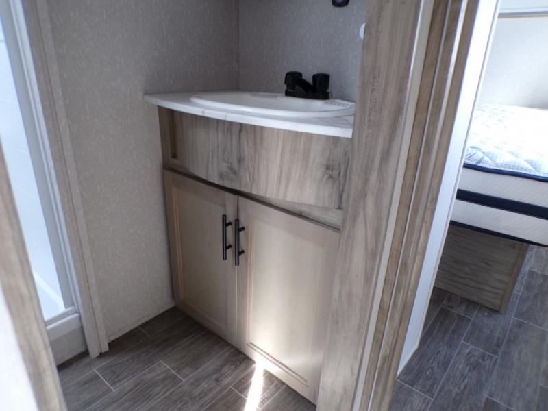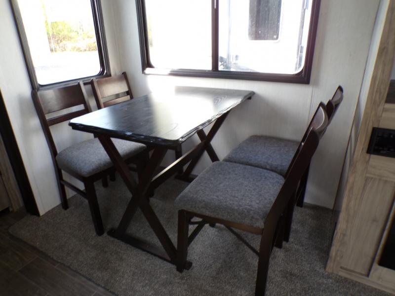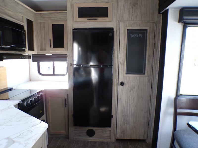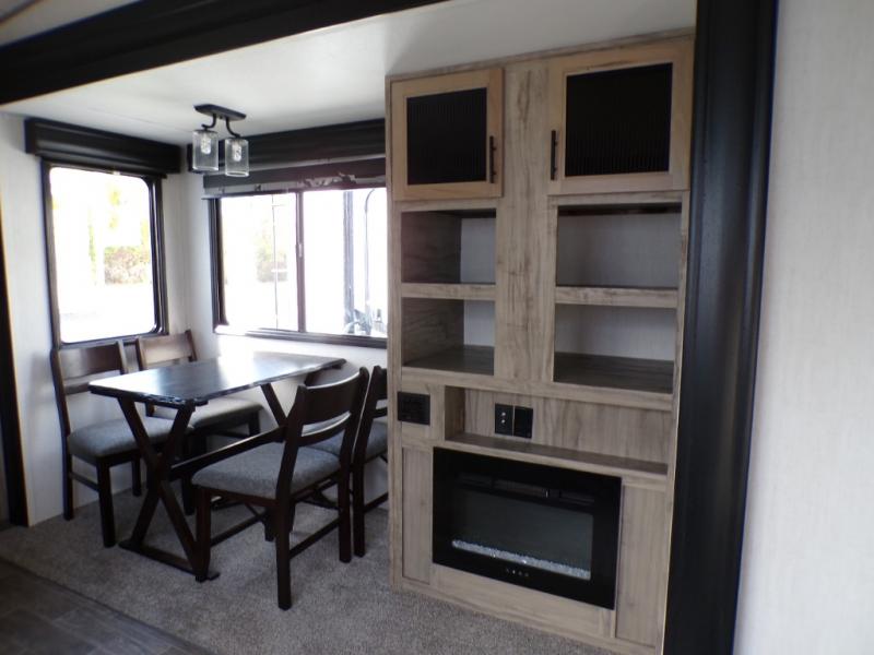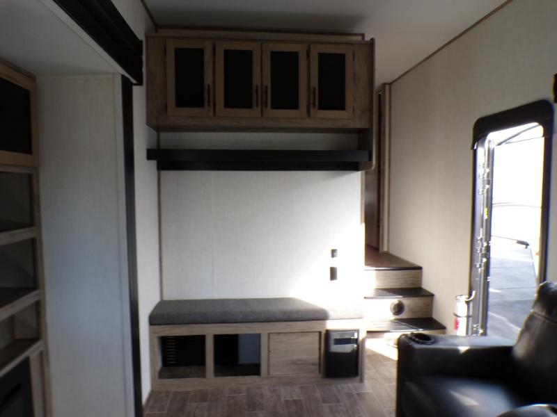 Are you interested in taking your camping game up a notch? If so, you'll certainly want to add this Cherokee Arctic Wolf fifth wheel to the roster! For a romantic getaway or guys' party weekend, this fifth wheel is 100% accommodating. Up at the front of this unit is a private bedroom where you will find great relaxation on the residential queen bed. Right next to the bedroom is a full bathroom that has everything you need to get ready like a pro each morning. The main living area is the big attraction on this unit because it is perfectly set up for lounging at your best. The home theater seating is across from the fireplace, and above the fireplace is an area prepped for a TV. You'll find a free-standing table with two fixed chairs and two folding chairs right next to the rear kitchen, so you can take in the sights and sounds of dinner being prepared as you socialize with the chef. Another great feature on this model is the entryway shoe storage and bench.