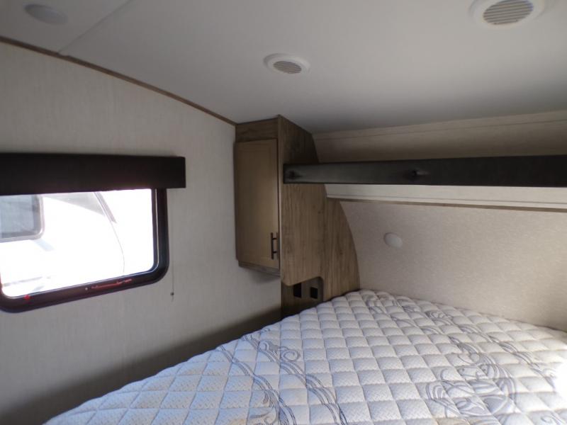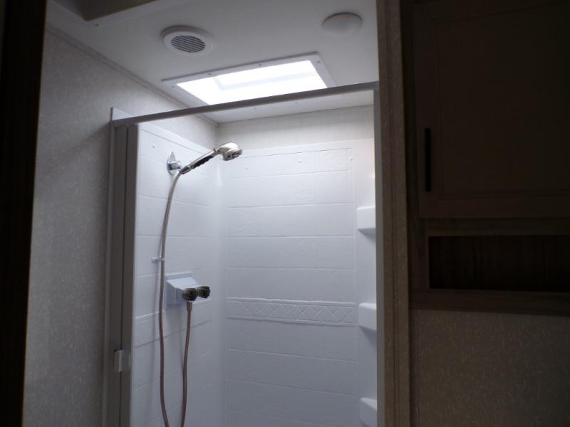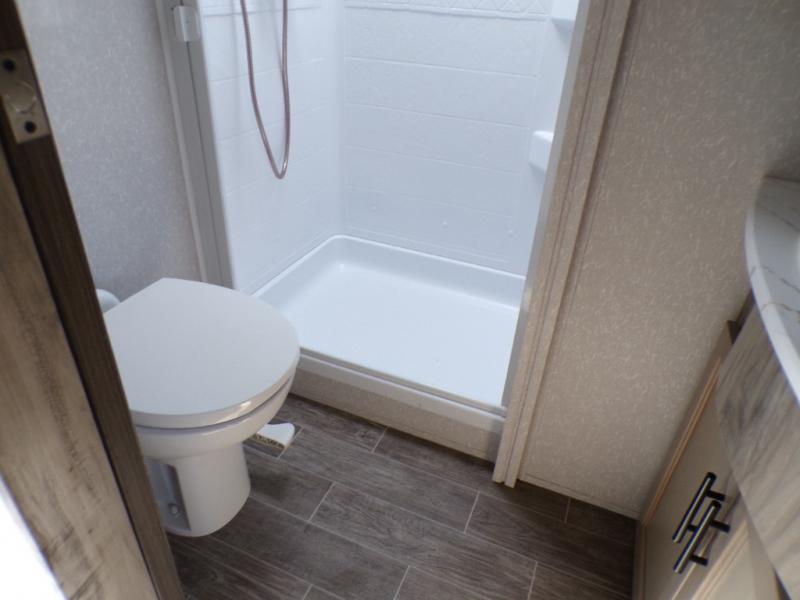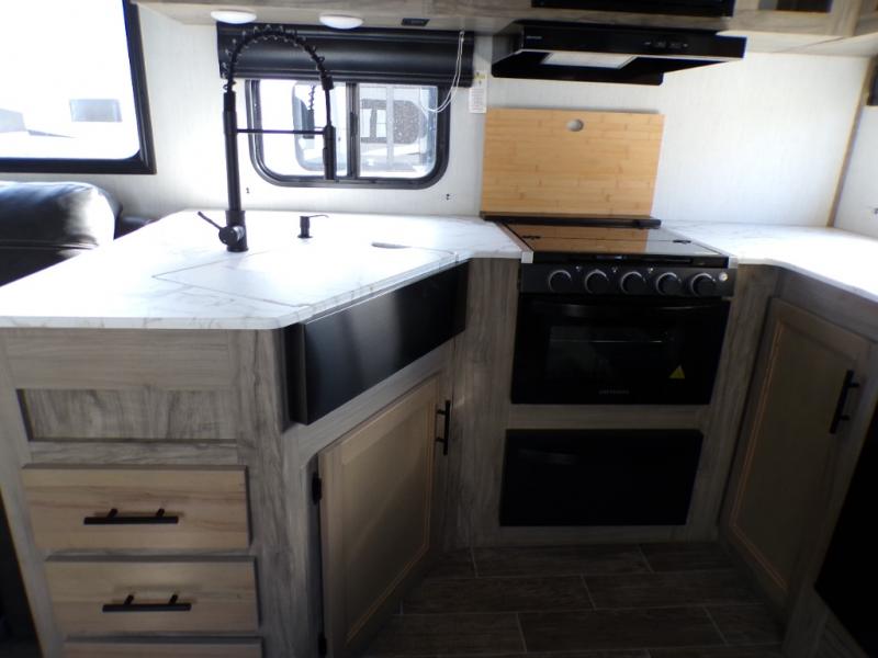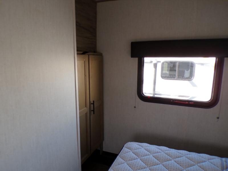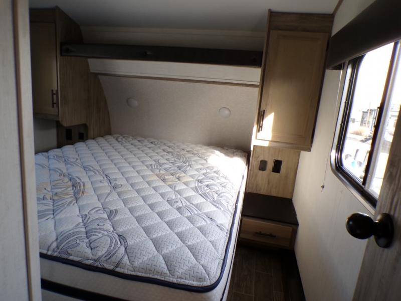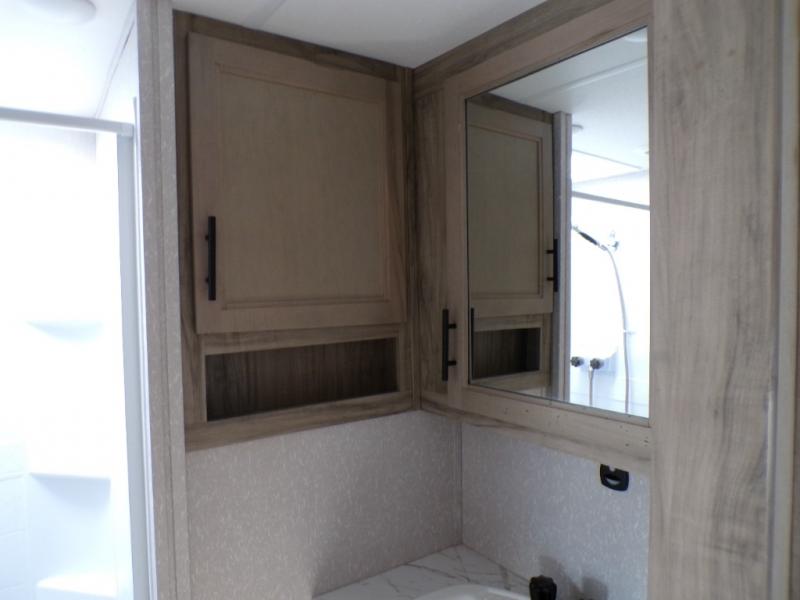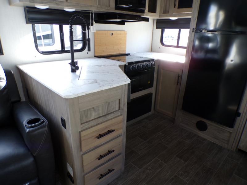 Are you interested in taking your camping game up a notch? If so, you'll certainly want to add this Cherokee Arctic Wolf fifth wheel to the roster! For a romantic getaway or guys' party weekend, this fifth wheel is 100% accommodating. Up at the front of this unit is a private bedroom where you will find great relaxation on the residential queen bed. Right next to the bedroom is a full bathroom that has everything you need to get ready like a pro each morning. The main living area is the big attraction on this unit because it is perfectly set up for lounging at your best. The home theater seating is across from the fireplace, and above the fireplace is an area prepped for a TV. You'll find a free-standing table with two fixed chairs and two folding chairs right next to the rear kitchen, so you can take in the sights and sounds of dinner being prepared as you socialize with the chef. Another great feature on this model is the entryway shoe storage and bench.