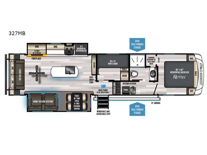 If you want something that is going to accommodate the whole family, check out this Cherokee Arctic Wolf fifth wheel! Not only is there a private bedroom with a residential queen bed for you, but there is also a private bunkhouse with triple bunk beds for any other tired campers. You can even use the tri-fold sofa out in the main living area for additional sleeping space. This main living area has home theater seating across from a fireplace with TV prep, so you can relax in true comfort each night. You can also play a game or put together a puzzle at the free-standing table with two fixed chairs and two folding chairs. This whole area will be kept cool when you switch on the ceiling fan, and if you need to head outside to check on the campfire, you can easily grab your jacket from the entryway coat drop zone and your sandals from the shoe storage under the steps.