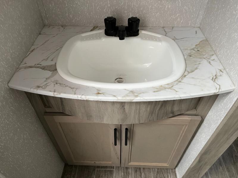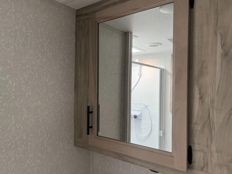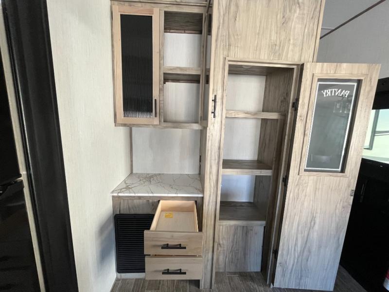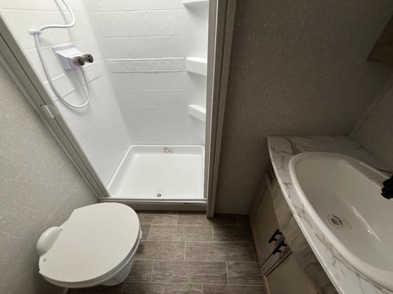 The private bedroom suite offers a peaceful retreat with a comfortable bed, large wardrobes, and excellent storage for clothing and essentials. The full bathroom includes a spacious shower, vanity, linen storage, and washer/dryer prep, making this fifth wheel especially appealing for long-term travel and full-time use.