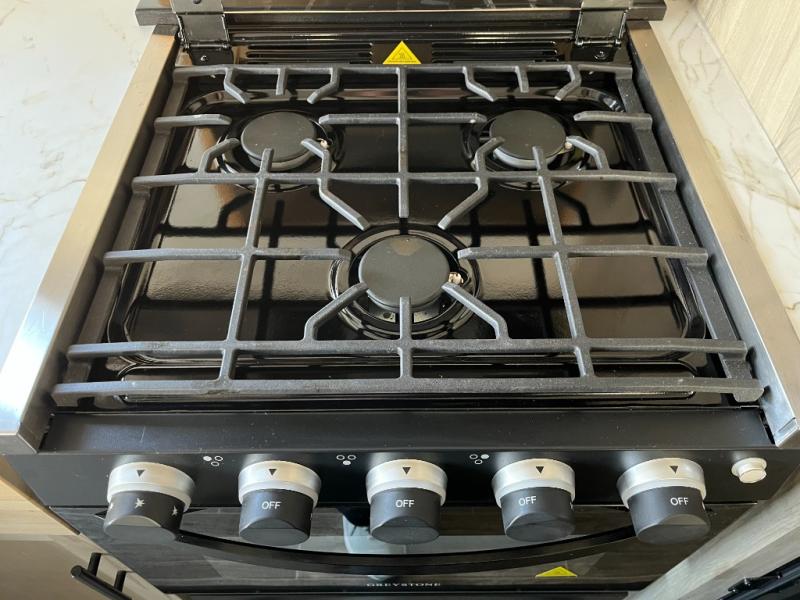 Ample counter space, quality appliances, and abundant storage make cooking on the road easy.