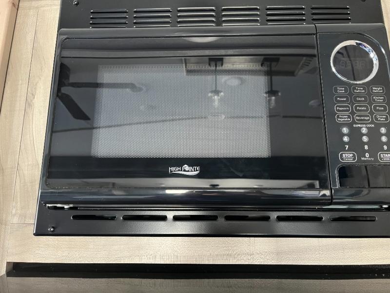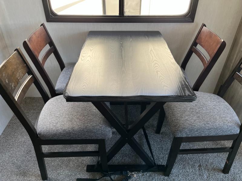 Step inside and enjoy a bright, open interior that immediately feels welcome. The main living area offers plenty of room to relax, entertain, or unwind after a day of travel. Comfortable seating, large windows, and an entertainment center create a cozy environment that feels perfect for movie nights or quiet evenings at the campground.