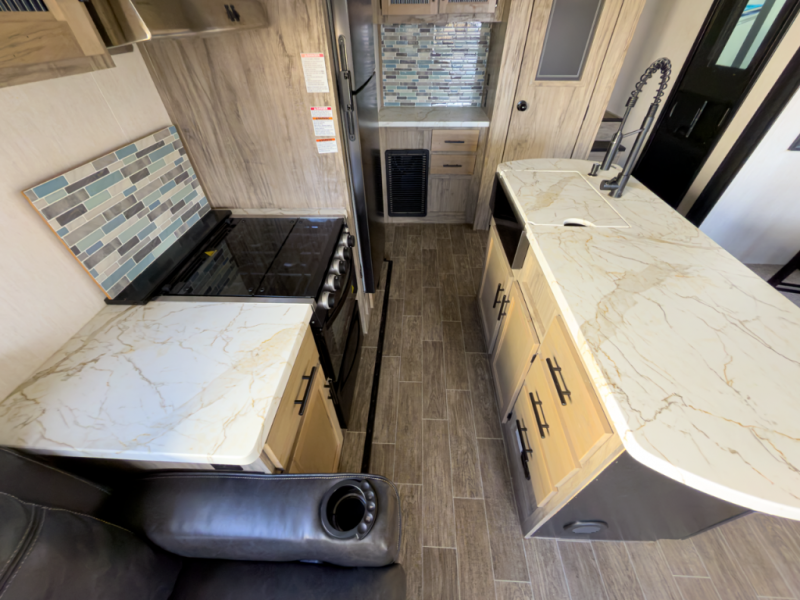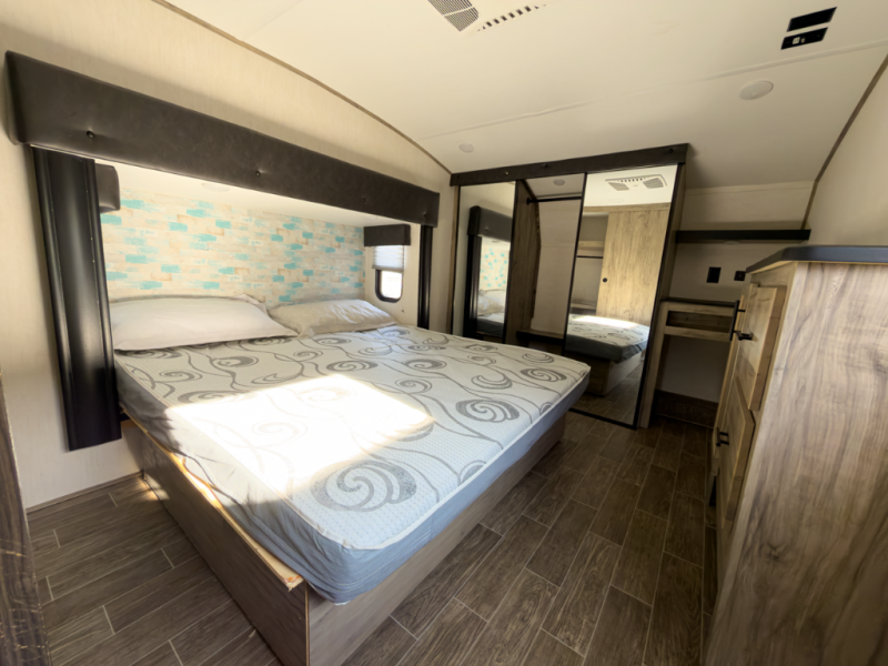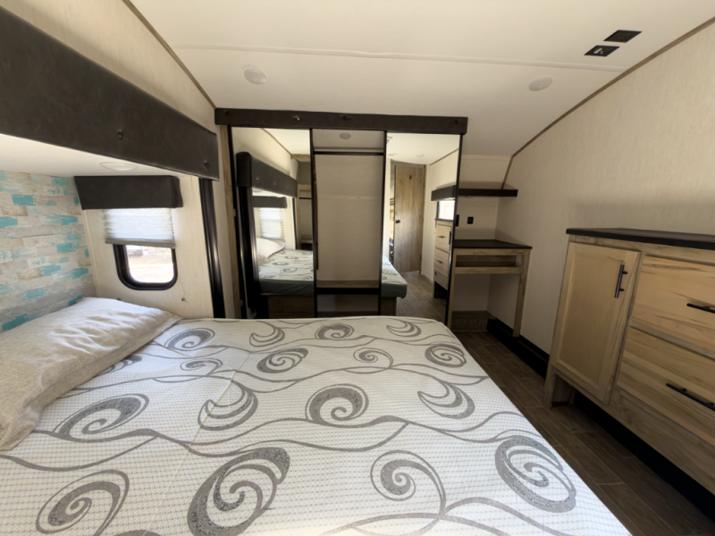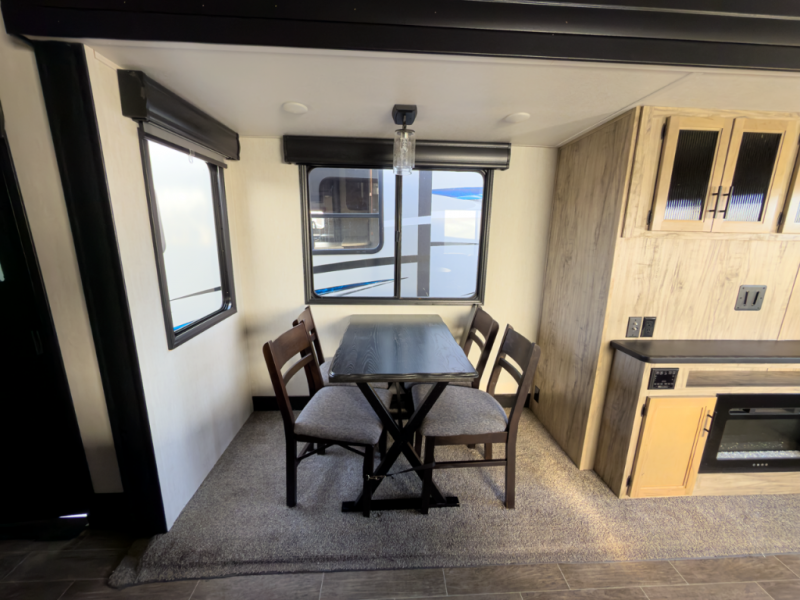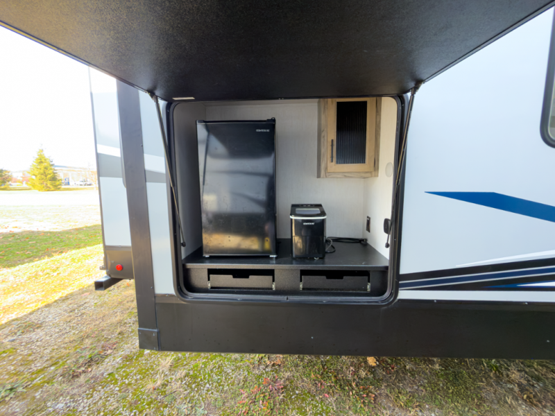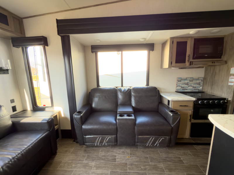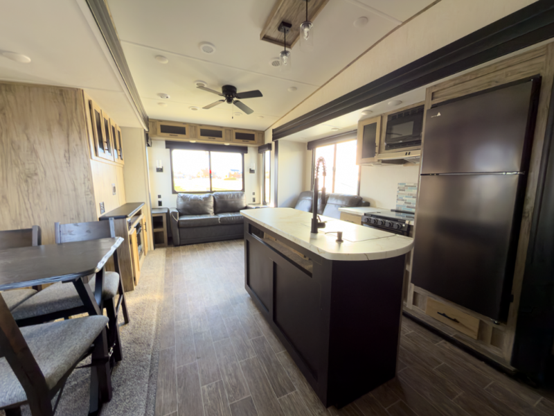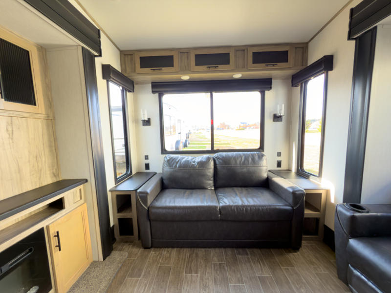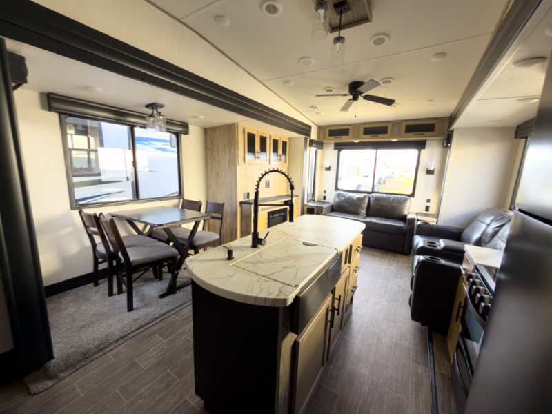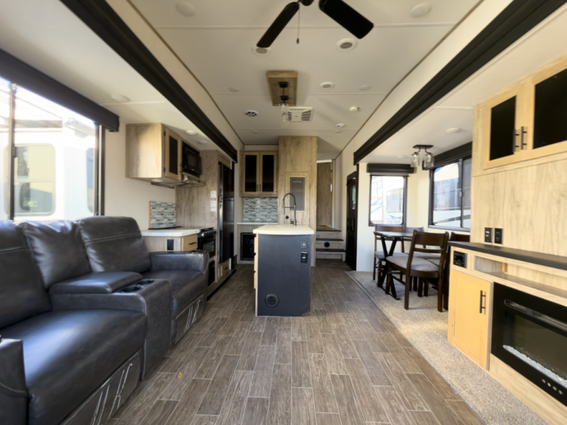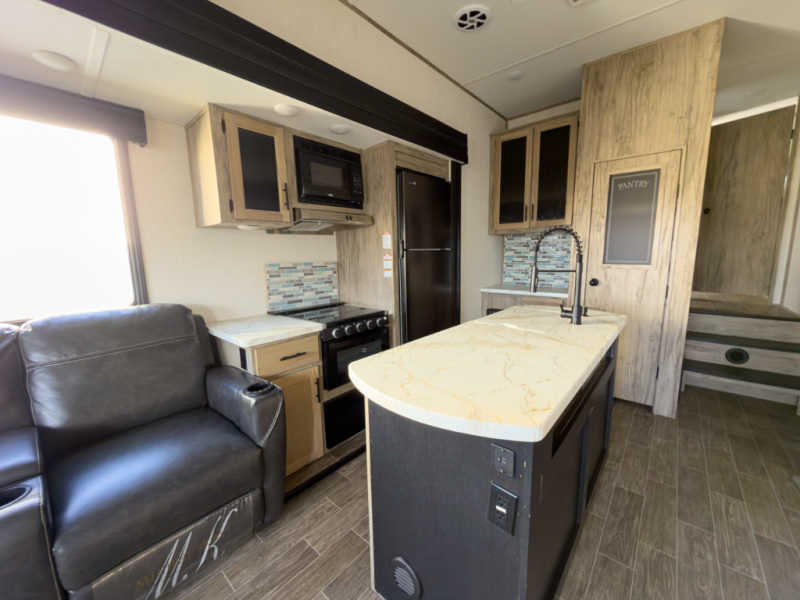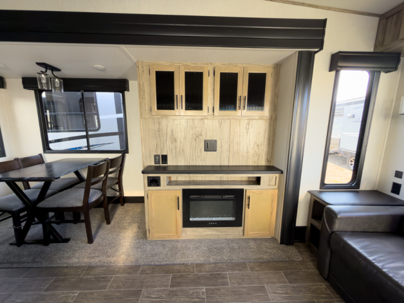 This Cherokee Arctic Wolf Suite fifth wheel is quite extraordinary and accommodating! It has a set of opposing slides in the main living area so that you can have more space to sit back on the theater seating and tri-fold sofa. You can switch on the fireplace to add some warmth to this space if it's a cool night, or if it is a hot afternoon, simply switch on the ceiling fan. The table with two fixed/two foldable chairs is going to be great for sitting down to eat a meal together, and after dinner, you can prepare coffee for everyone at the coffee bar. You'll also be able to grab dessert from the walk-in pantry to go with your coffee. The Juice Pack 50W solar panel will help your unit stay powered when you can't connect at a campsite, and the private bedroom up front is going to provide great relaxation with its king bed slide.
