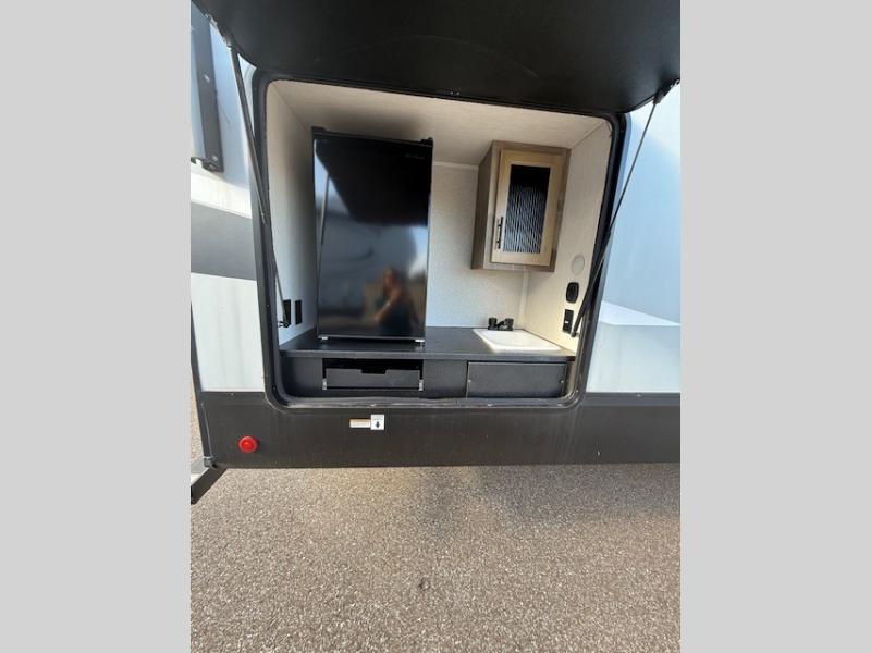 This Cherokee Arctic Wolf Suite fifth wheel is an excellent choice if you have a large family that wants to get away! Not only is there a private bedroom up front for you, but there is also a bedroom suite in the back. This suite has a 54" x 74" bed next to some wardrobe storage, a 60" x 80" loft above the bed with a ladder, a half bathroom all to itself, and the second exterior entry door. What a space! You'll also be highly impressed with the living area because it has a large slide that holds two sets of home theater seating with removable tables in front. Now you can sit down and enjoy dinner while you watch the optional residential-size LED TV that you added above the fireplace. The large pantry is another feature you'll appreciate since it can store all of the food needed to feed your group, and the Juice Pack 50W solar panel will help your unit stay powered wherever you camp.