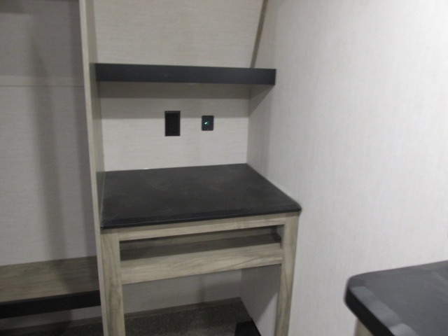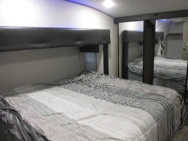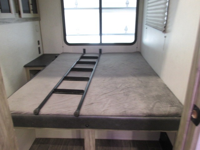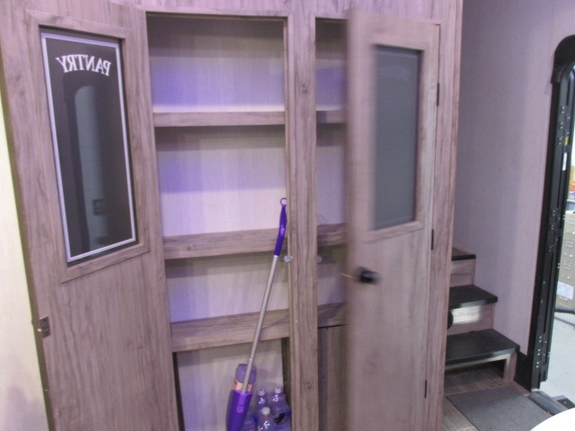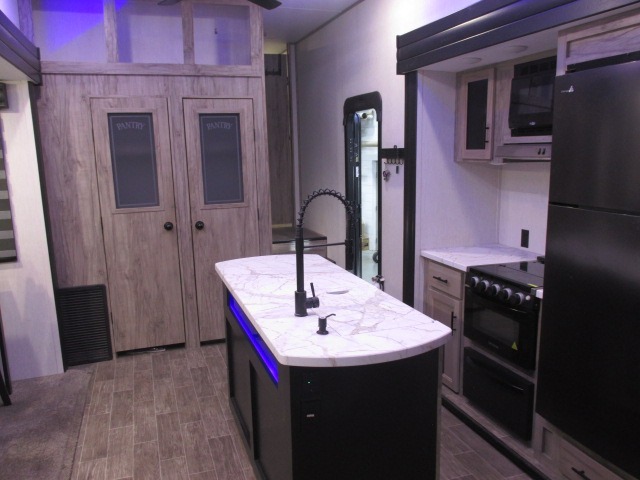 This Cherokee Arctic Wolf Suite fifth wheel is an excellent choice if you have a large family that wants to get away! Not only is there a private bedroom up front for you, but there is also a bedroom suite in the back. This suite has a 54" x 74" bed next to some wardrobe storage, a 60" x 80" loft above the bed with a ladder, a half bathroom all to itself, and the second exterior entry door. What a space! You'll also be highly impressed with the living area because it has a large slide that holds two sets of home theater seating with removable tables in front. Now you can sit down and enjoy dinner while you watch the optional residential-size LED TV that you added above the fireplace. The large pantry is another feature you'll appreciate since it can store all of the food needed to feed your group, and the Juice Pack 50W solar panel will help your unit stay powered wherever you camp.