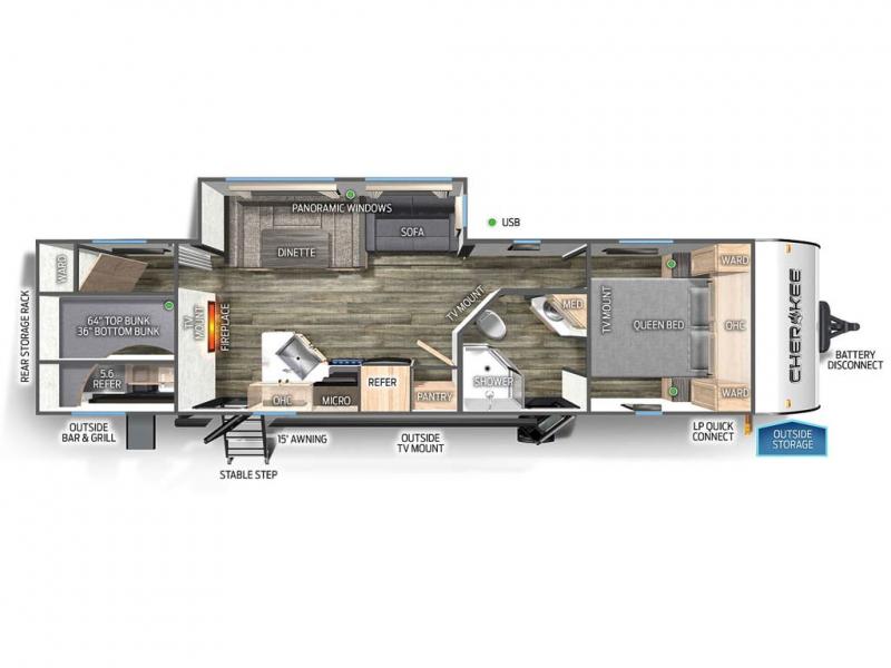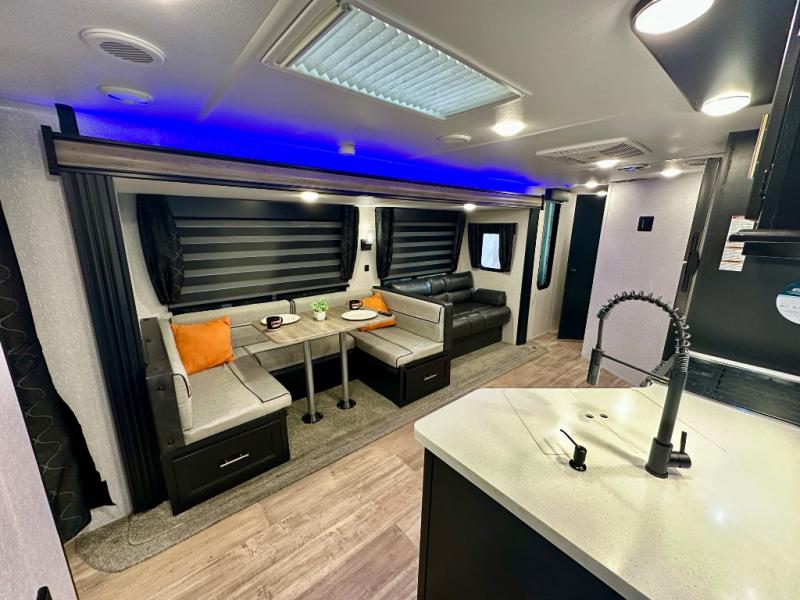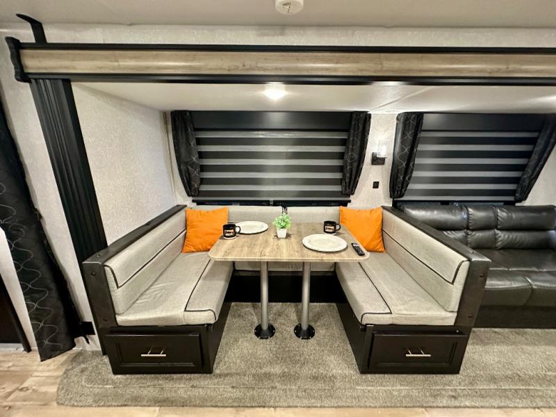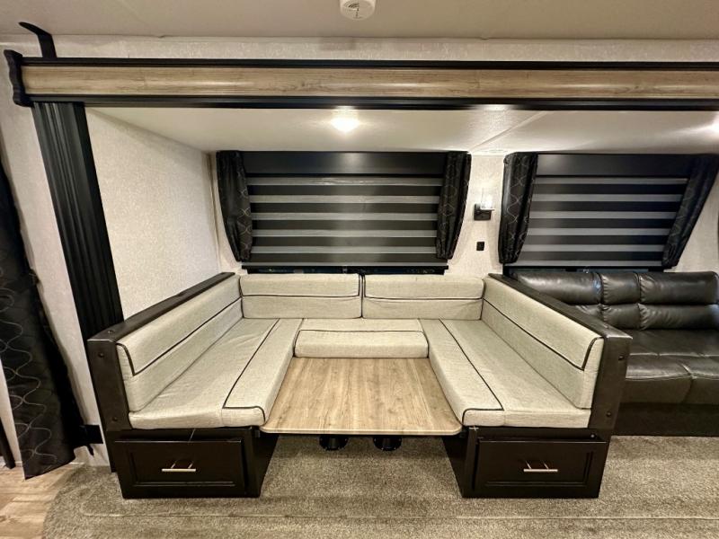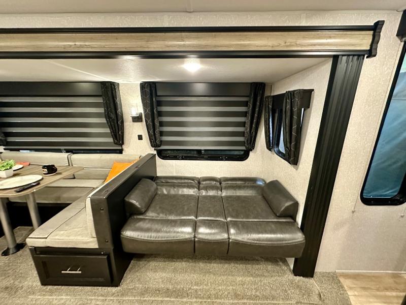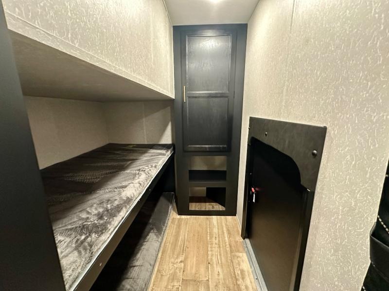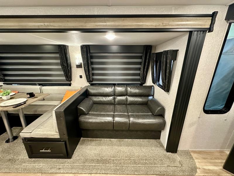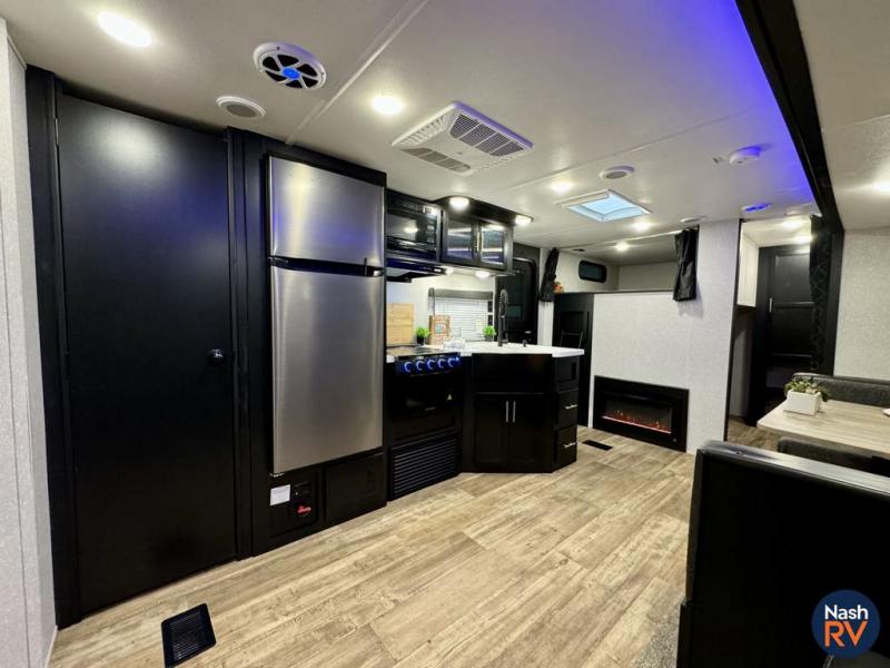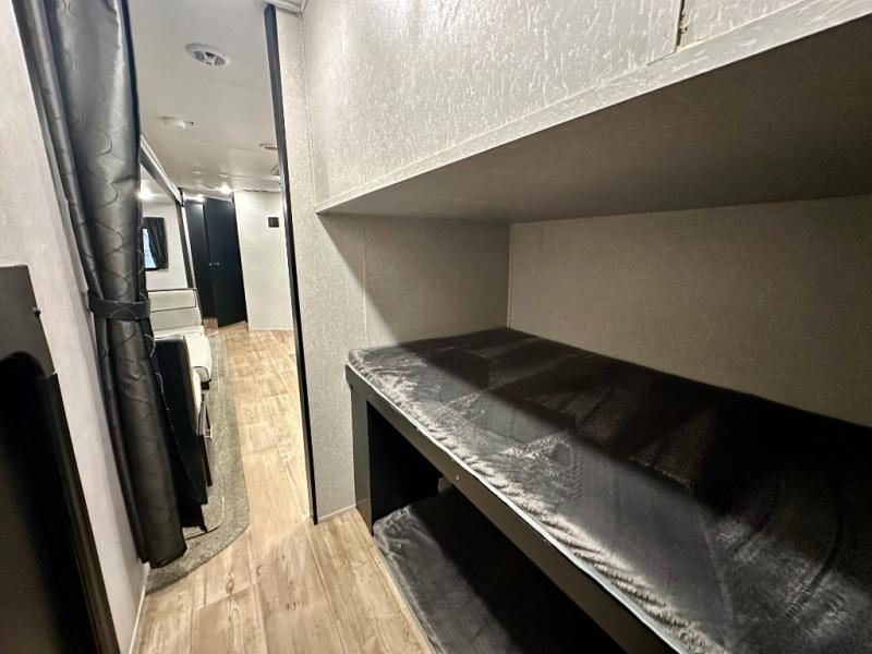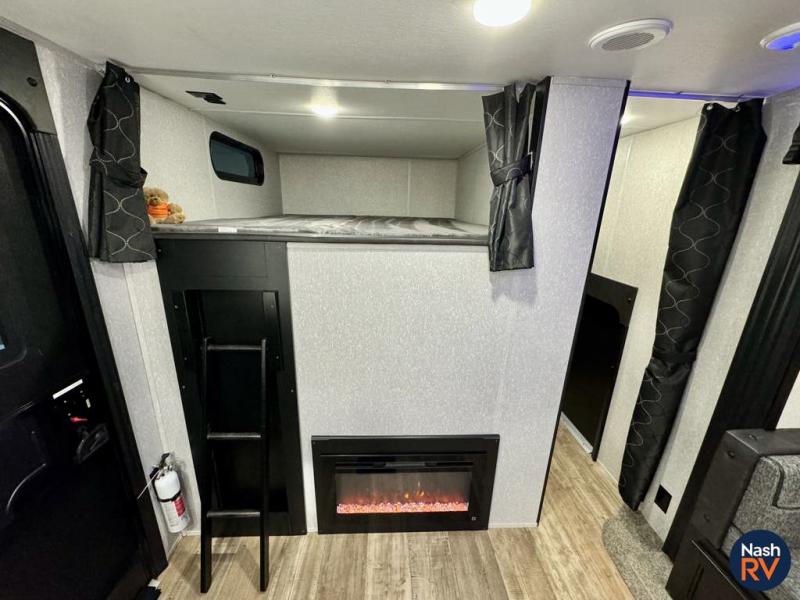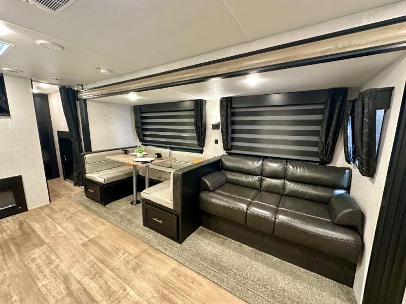 How does having a master bedroom for yourself, a bunkhouse for your oldest kiddo and a loft area for two more kids sound in your next travel trailer? This innovated design gives everyone their own space at night with a full queen loft bed, a 36" bunk bed and a walk-around queen bed, plus the U-shaped dinette and sofa provide more sleeping space. Everyone will enjoy the fireplace on chilly nights and the cook will love all the kitchen appliances including the large pantry and farm sink. The outdoor bar and grill with a side-by-side refrigerator and freezer, an ice maker, a pull-out cooktop, a sink and large storage areas are a must have when you love to be outside.