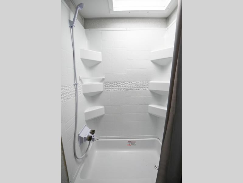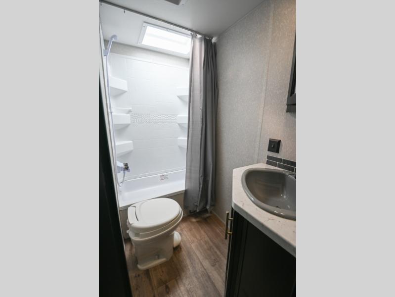 With this Cherokee Grey Wolf travel trailer, there are a set of double-size bunks that your kiddos are sure to love, and you will love having your own Cherokee Sleep System bed. The bed can be easily folded up to give you a full sofa. The location of the full bathroom in the back next to the bunk beds offers even more convenience, especially at night. This unit will give your larger family a great camping experience. You will find ample storage both inside and out with large overhead cabinets inside and wardrobes on either side of the front bed. On the outside, there are storage compartments for your exterior camping gear in both the front and rear making it easy to stow away outdoor camp chairs and games that you can enjoy while hanging out under the 15' power awning.