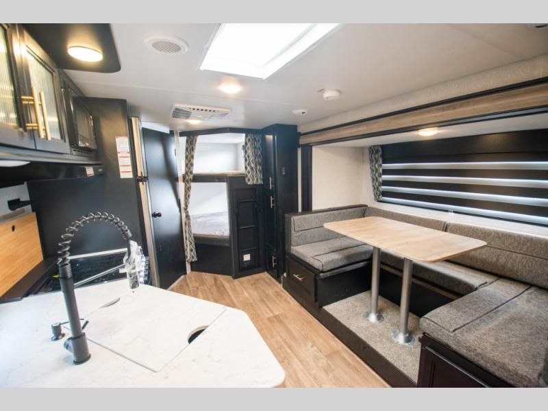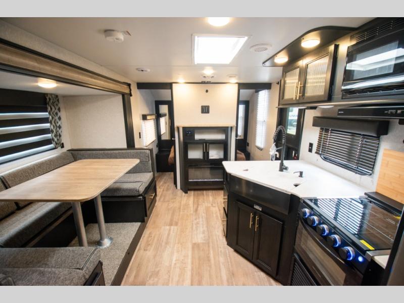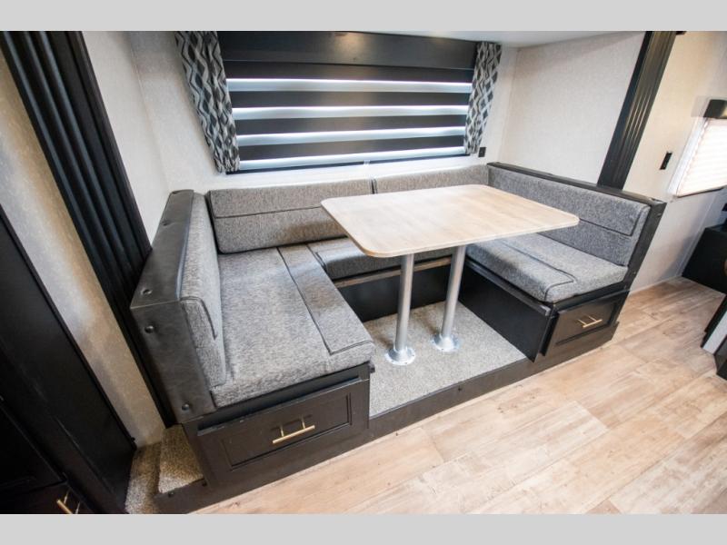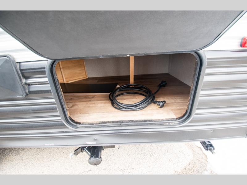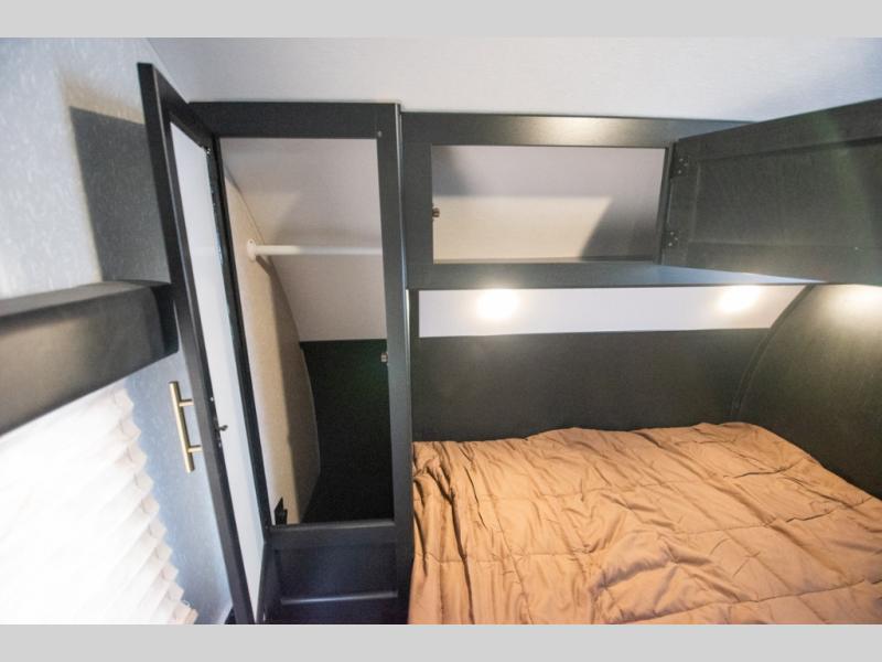 You will love the space provided in this dual entry Cherokee Grey Wolf travel trailer that has double-size bunks! The rear entry door leads right into the full bath allowing easy access from outside when you need to use the bathroom while you're enjoying the great outdoors. The large U-shaped dinette slide will not only seat everyone comfortably for a meal or a game, but since it also slides out, it opens up the interior even more to give you plenty of space for foot traffic. For all of your outdoor gear, you will find the outside storage compartments handy for stowing away your things when not in use. While the kids enjoy their bunk beds, you will enjoy a good night's rest in your queen bed with wardrobes on either side up in the front private bedroom!