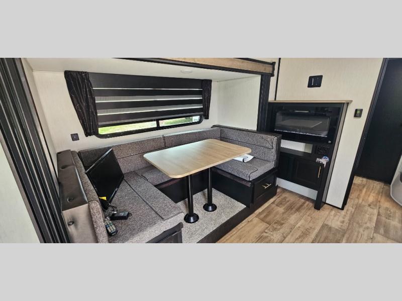 This Cherokee Grey Wolf travel trailer is perfect for your small family and will leave you planning your next outing before you are back from your current weekend away! You will find all of the comforts you need with plenty of livable space including a U-shaped dinette slide. There is also a sofa for more seating when company arrives, and there are end tables on either side to prevent spills. A spacious walk-through bath leads to a front private bedroom where you will enjoy a great night's rest on a comfortable queen-size bed. You will find ample storage for clothing in the wardrobes that are above handy nightstands for your personal things. There are even lights mounted above the bed on each side which makes it easy to read a couple of chapters before drifting off to sleep.