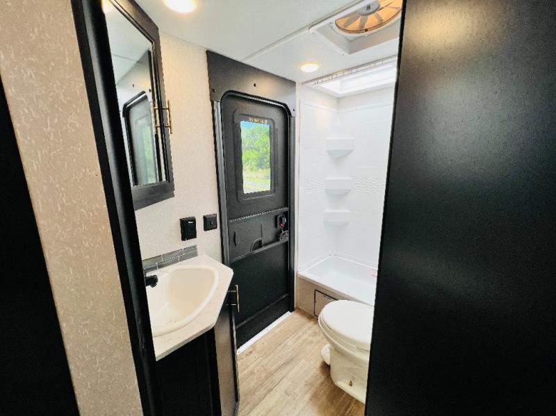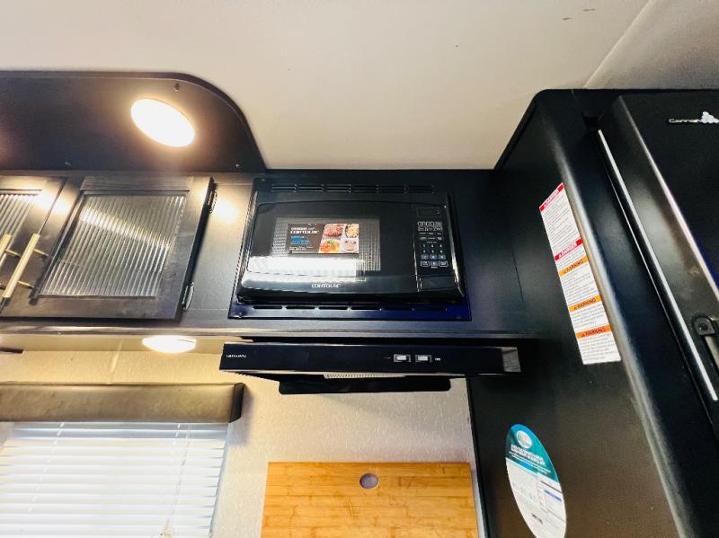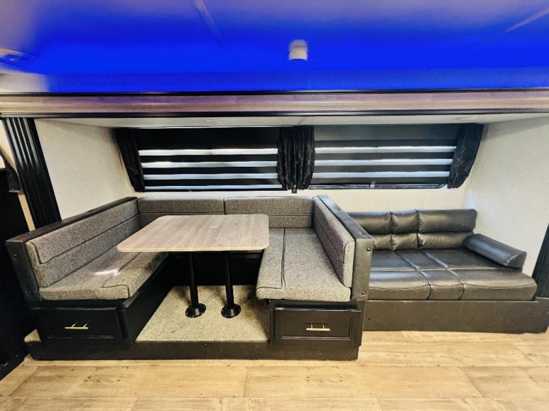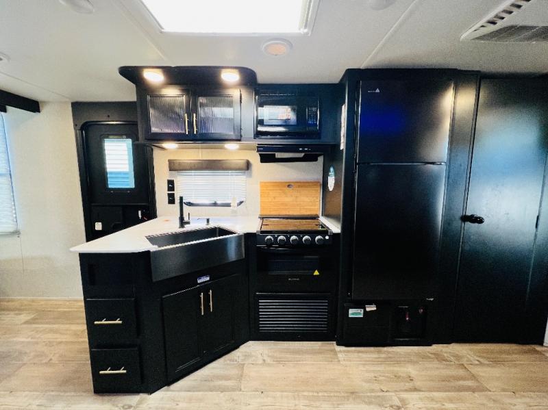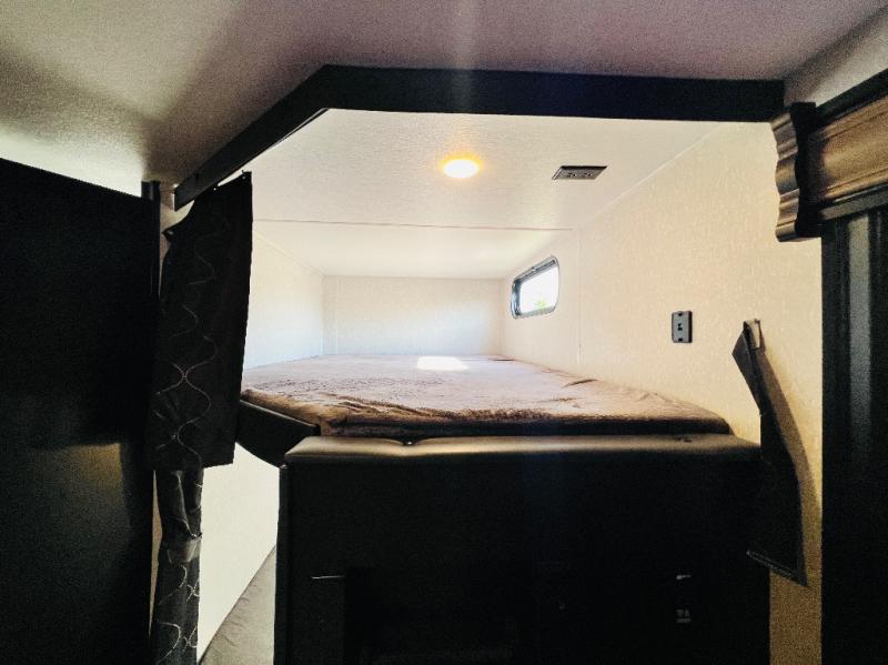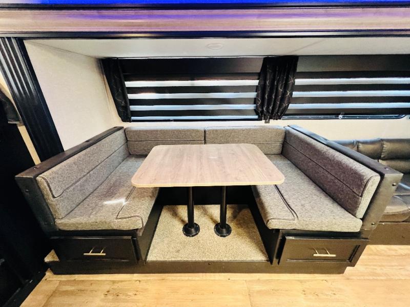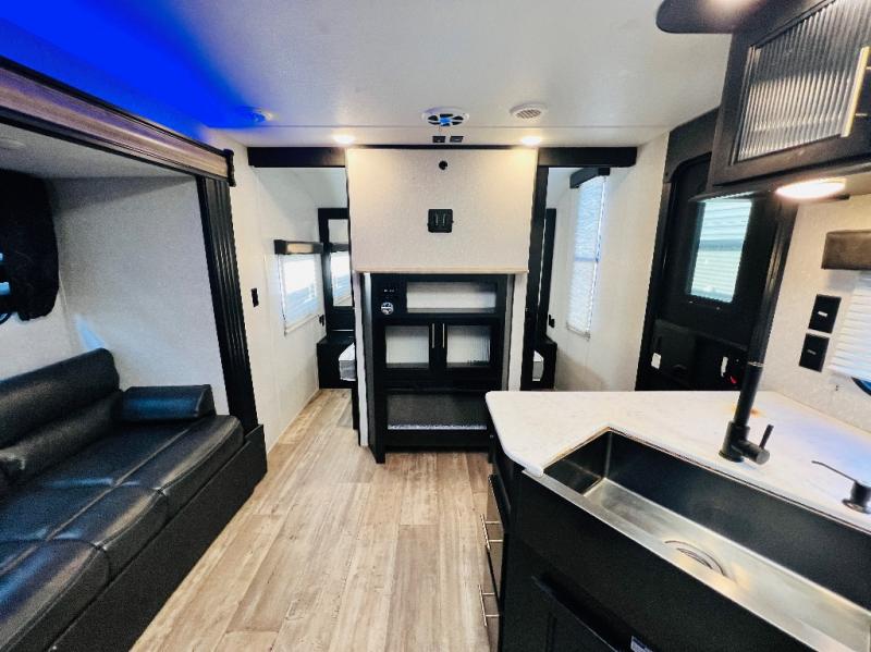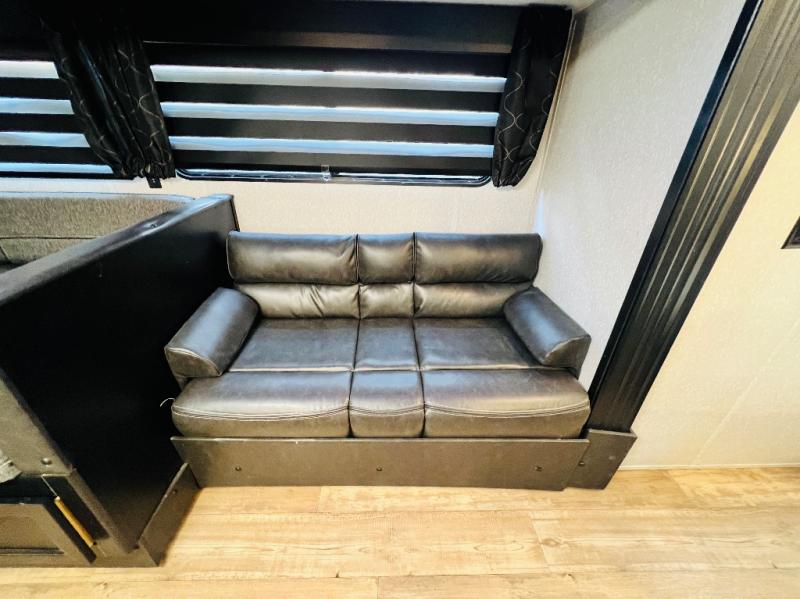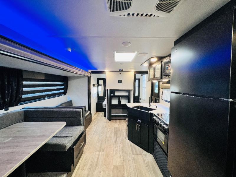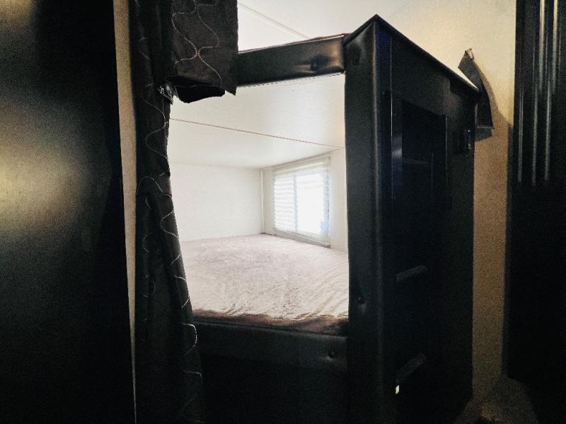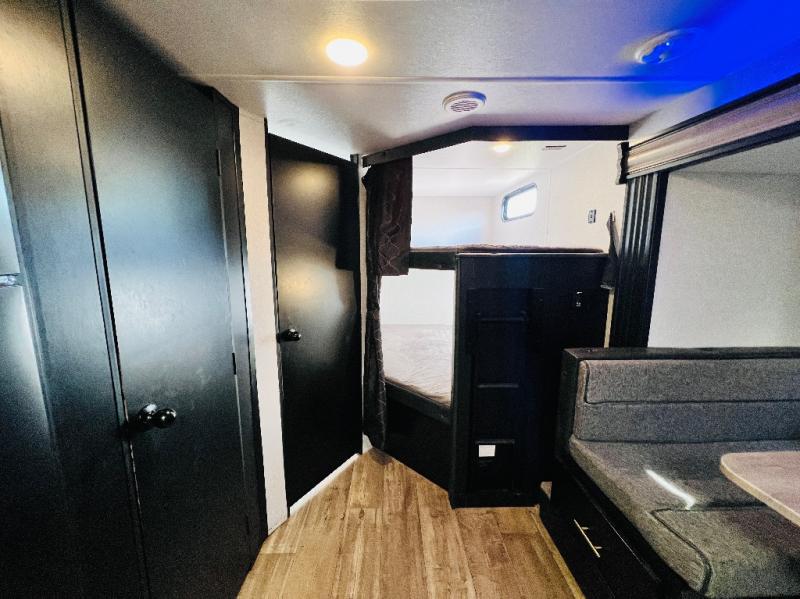 Come on inside this Cherokee Grey Wolf travel trailer and experience the convenience of a smooth flow of traffic in and out with two entry doors. The rear door leads into a full bath which is great for accessibility when outside and when you need to use the bathroom. Once inside, you will notice the large U-shaped dinette and the sofa which sit on the slide and create a spacious footprint for moving about, as well as great places to play games and socialize with your friends and family. A walk-in pantry provides plenty of storage allowing you to stock up on your favorite snacks and dry goods for your family adventure. At night, there is sleeping space for everyone between the double-size bunks and the queen-size bed, plus the furniture.
