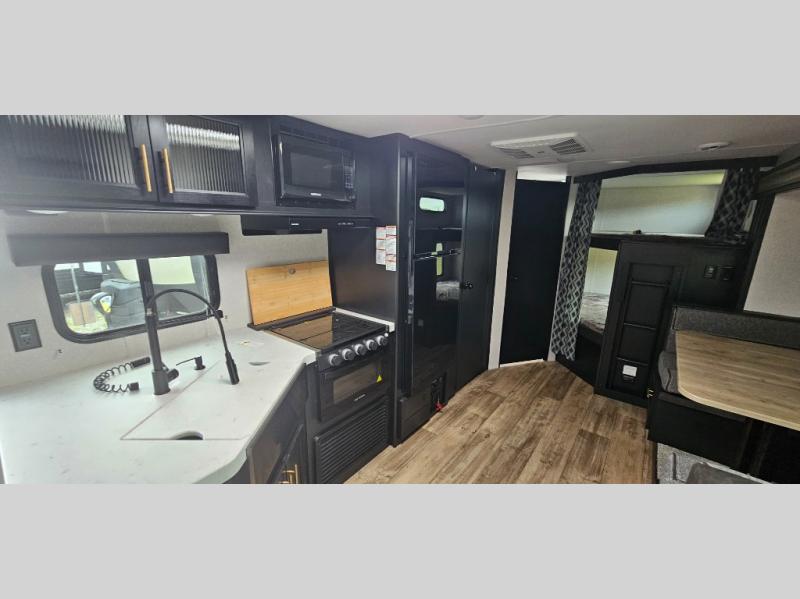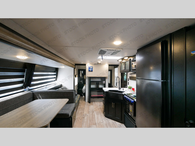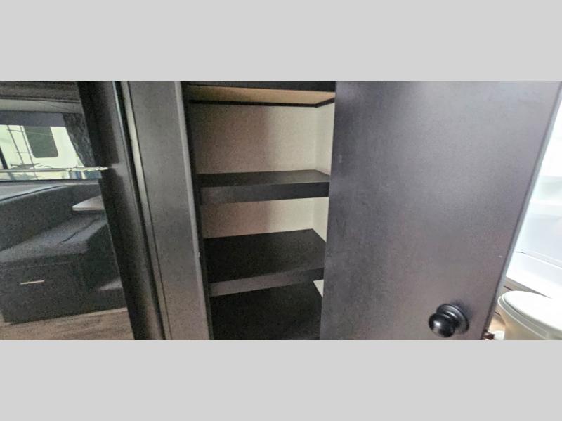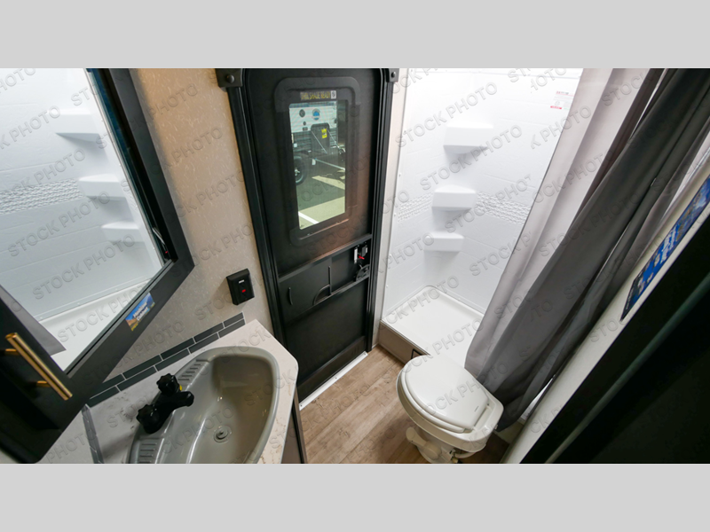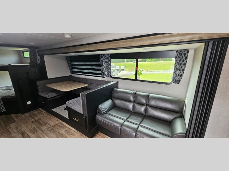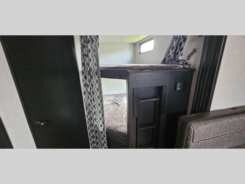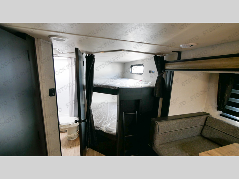 Come on inside this Cherokee Grey Wolf travel trailer and experience the convenience of a smooth flow of traffic in and out with two entry doors. The rear door leads into a full bath which is great for accessibility when outside and when you need to use the bathroom. Once inside, you will notice the large U-shaped dinette and the sofa which sit on the slide and create a spacious footprint for moving about, as well as great places to play games and socialize with your friends and family. A walk-in pantry provides plenty of storage allowing you to stock up on your favorite snacks and dry goods for your family adventure. At night, there is sleeping space for everyone between the double-size bunks and the queen-size bed, plus the furniture.
