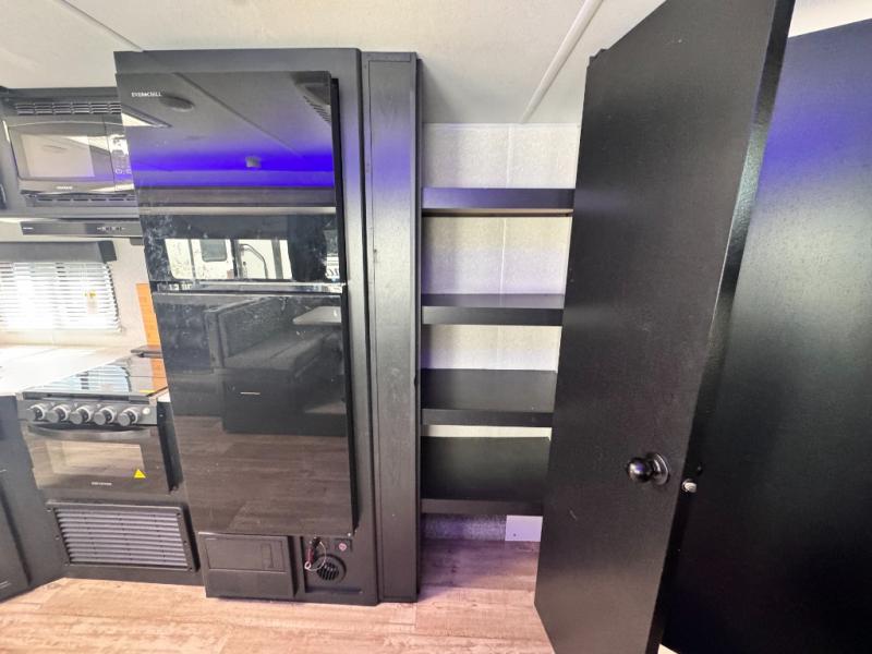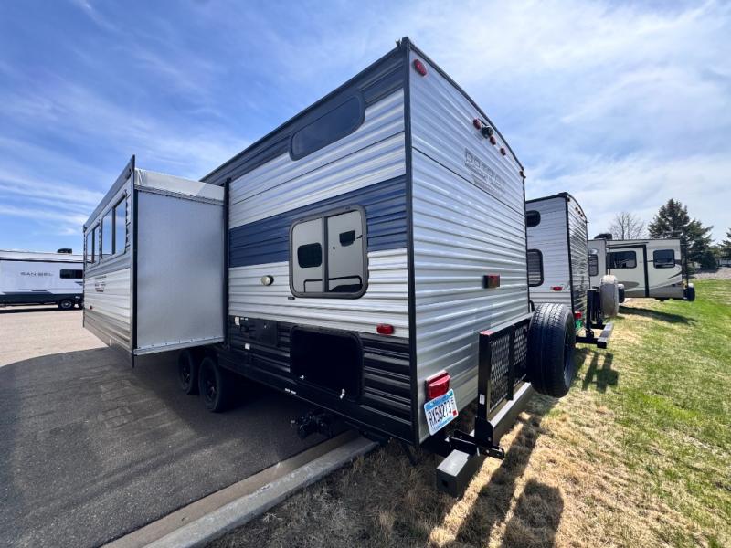 Come on inside this Cherokee Grey Wolf travel trailer and experience the convenience of a smooth flow of traffic in and out with two entry doors. The rear door leads into a full bath which is great for accessibility when outside and when you need to use the bathroom. Once inside, you will notice the large U-shaped dinette and the sofa which sit on the slide and create a spacious footprint for moving about, as well as great places to play games and socialize with your friends and family. A walk-in pantry provides plenty of storage allowing you to stock up on your favorite snacks and dry goods for your family adventure. At night, there is sleeping space for everyone between the double-size bunks and the queen-size bed, plus the furniture.