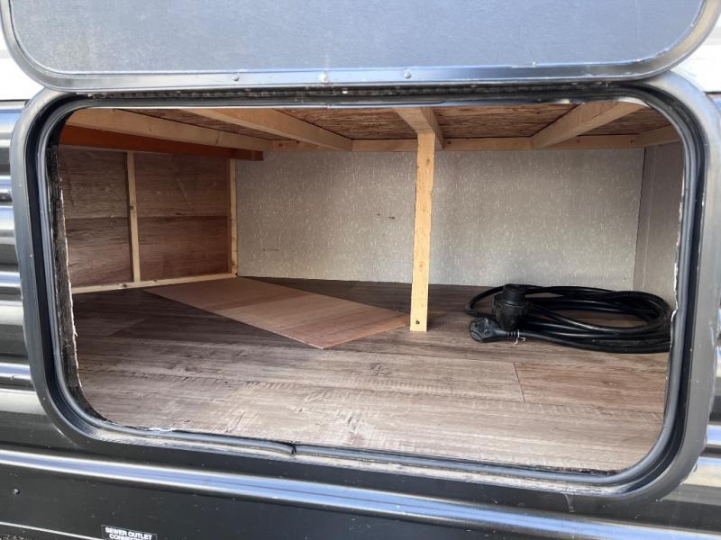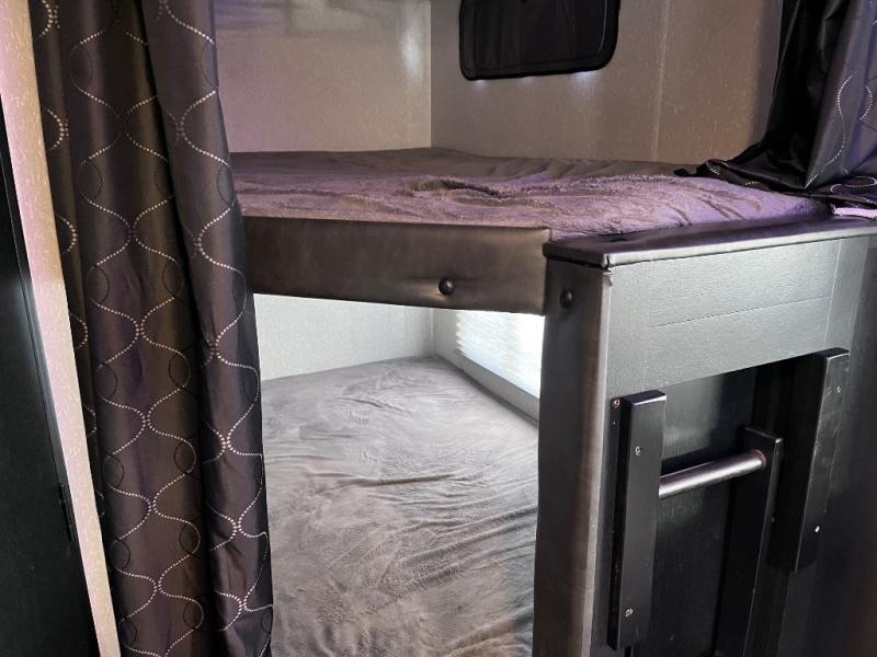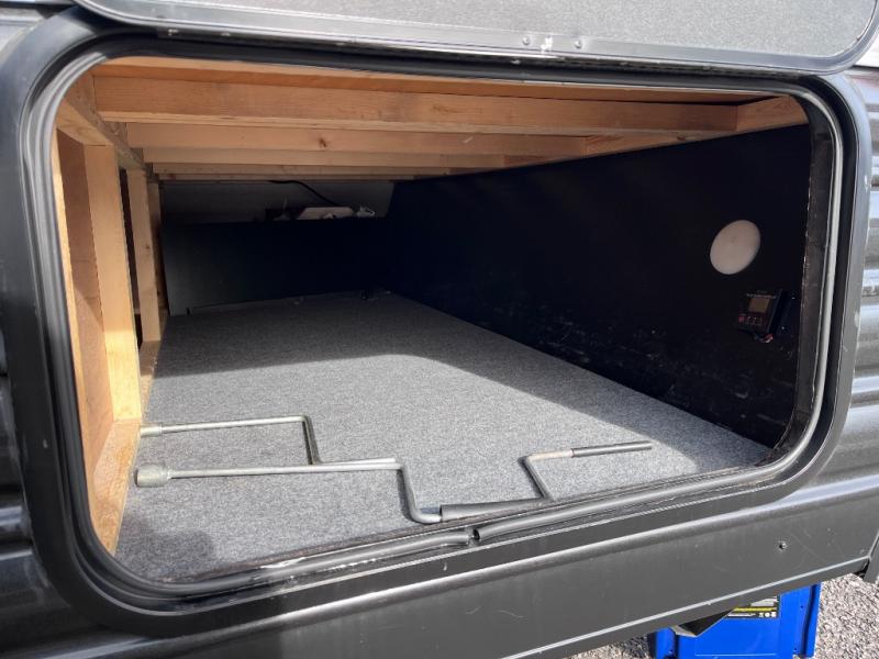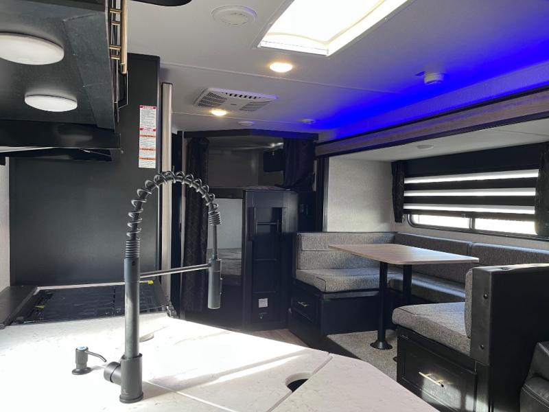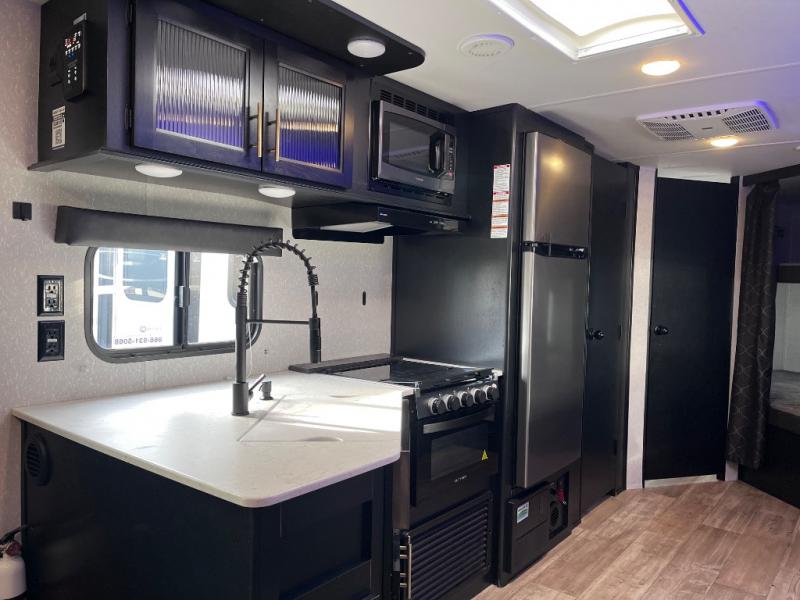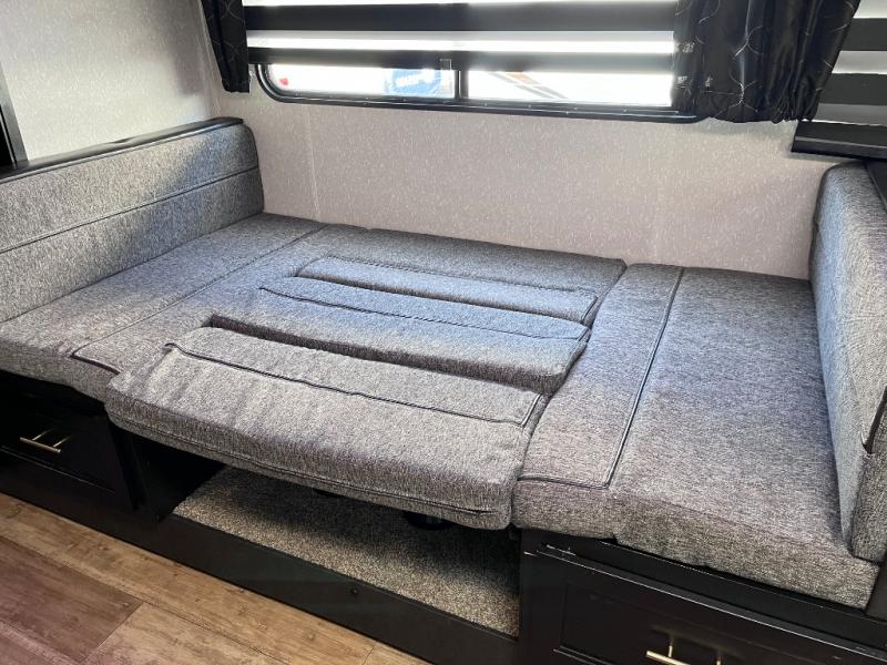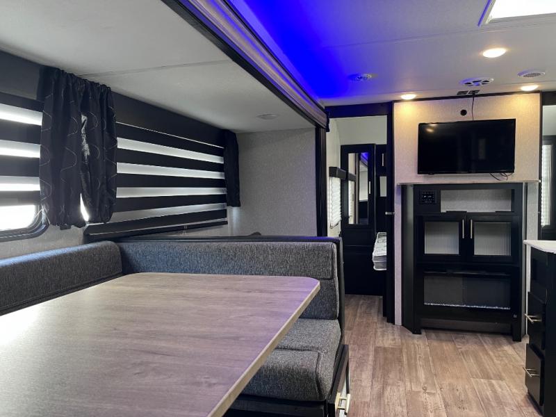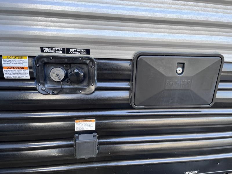 Come on inside this Cherokee Grey Wolf travel trailer and experience the convenience of a smooth flow of traffic in and out with two entry doors. The rear door leads into a full bath which is great for accessibility when outside and when you need to use the bathroom. Once inside, you will notice the large U-shaped dinette and the sofa which sit on the slide and create a spacious footprint for moving about, as well as great places to play games and socialize with your friends and family. A walk-in pantry provides plenty of storage allowing you to stock up on your favorite snacks and dry goods for your family adventure. At night, there is sleeping space for everyone between the double-size bunks and the queen-size bed, plus the furniture.