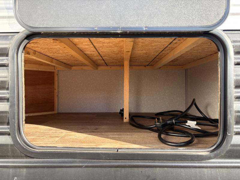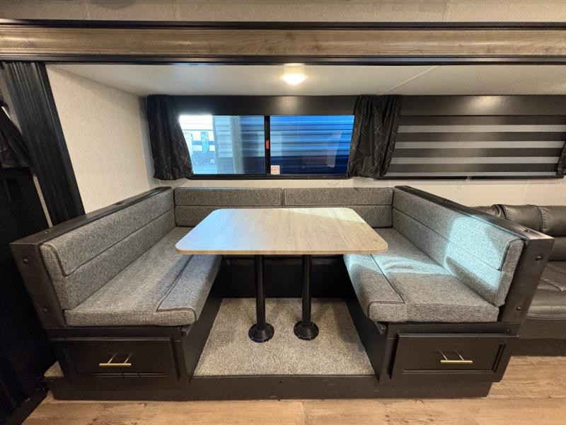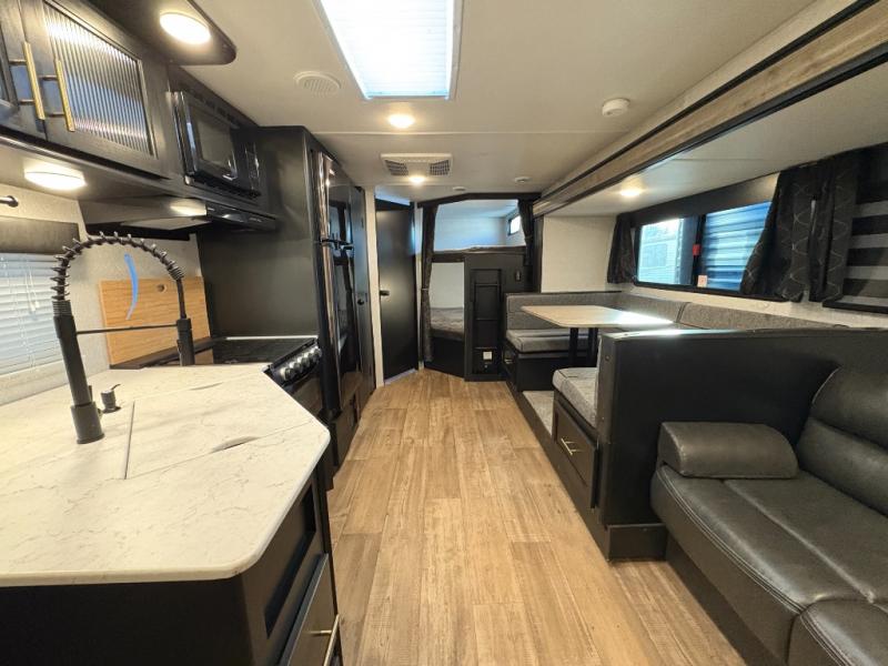 Come on inside this Cherokee Grey Wolf travel trailer and experience the convenience of a smooth flow of traffic in and out with two entry doors. The rear door leads into a full bath which is great for accessibility when outside and when you need to use the bathroom. Once inside, you will notice the large U-shaped dinette and the sofa which sit on the slide and create a spacious footprint for moving about, as well as great places to play games and socialize with your friends and family. A walk-in pantry provides plenty of storage allowing you to stock up on your favorite snacks and dry goods for your family adventure. At night, there is sleeping space for everyone between the double-size bunks and the queen-size bed, plus the furniture.