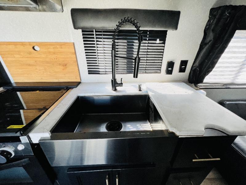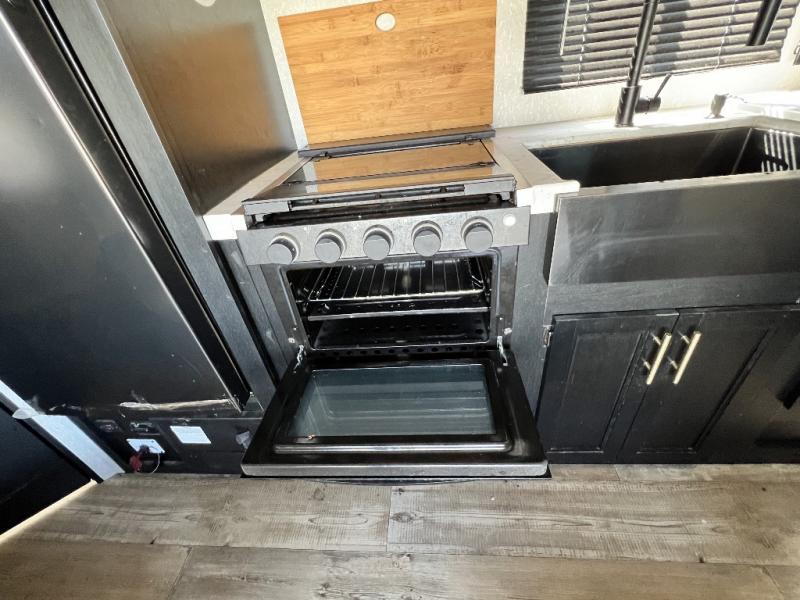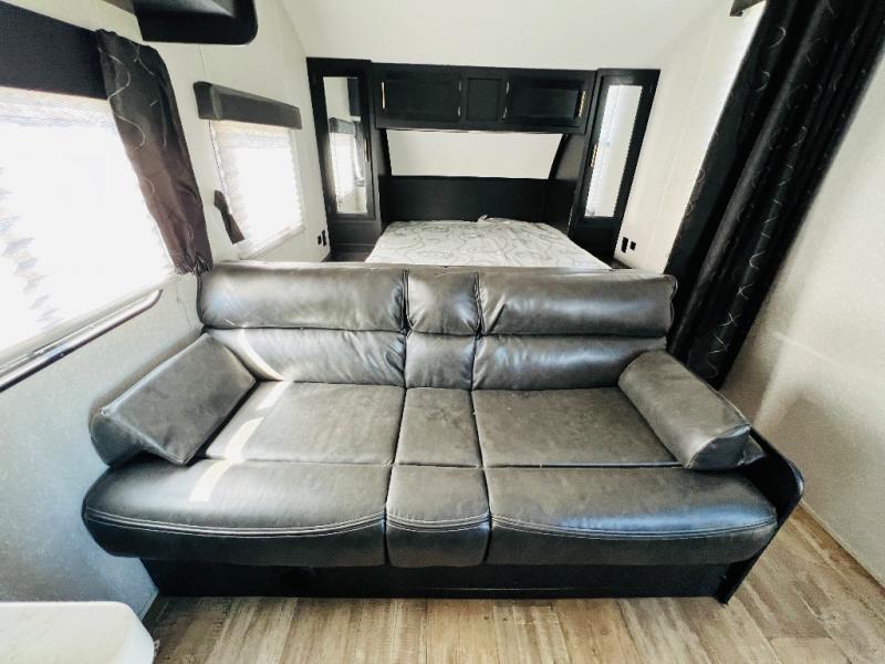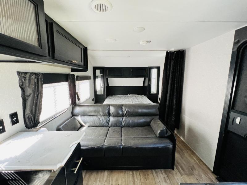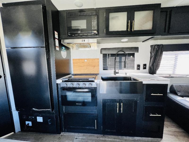 Enjoy cooking for nine in this Cherokee Grey Wolf travel trailer. With a three-burner cooktop, an overhead microwave, and an oven, you can easily cook just like home. The residential farm-style stainless steel sink makes cleaning your larger pots and pans quite simple, and the large overhead cabinets make storage an easy task as well. There is plenty of seating for the whole gang with the sofa and the booth dinette to play a game or two after you have enjoyed your delicious meal. Your kiddos are sure to love having their own set of double-size bunks conveniently located next to the rear bath, and you will love having your own front semi-private bedroom when you close the privacy curtain. You can also create some outdoor living space beneath the 15' power awning so that you can enjoy the great outdoors whether rain or shine!