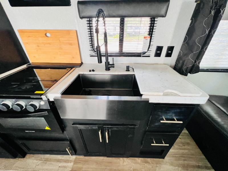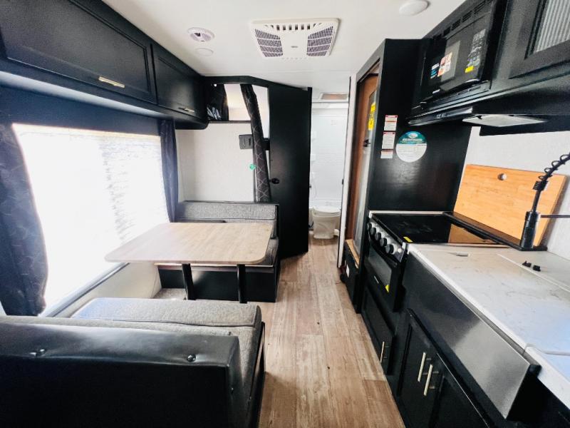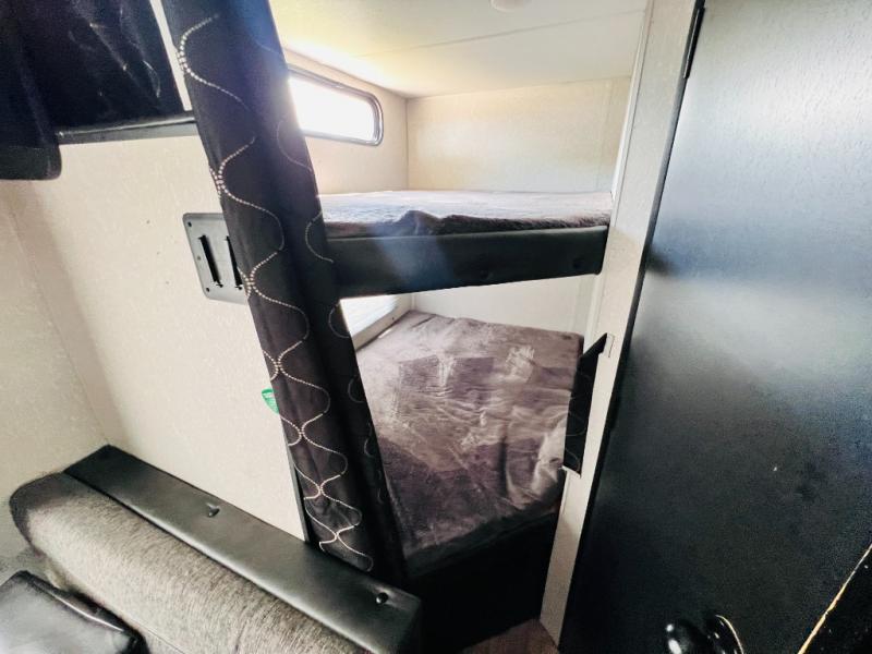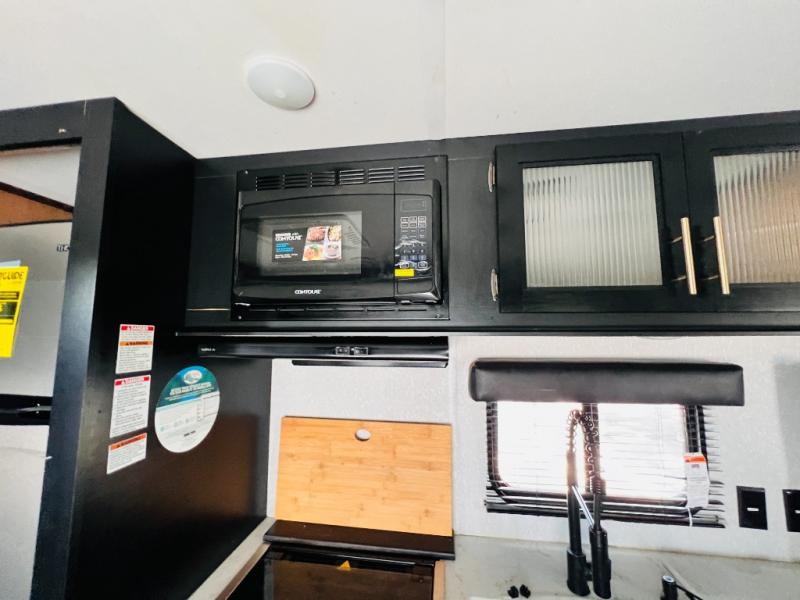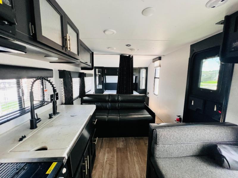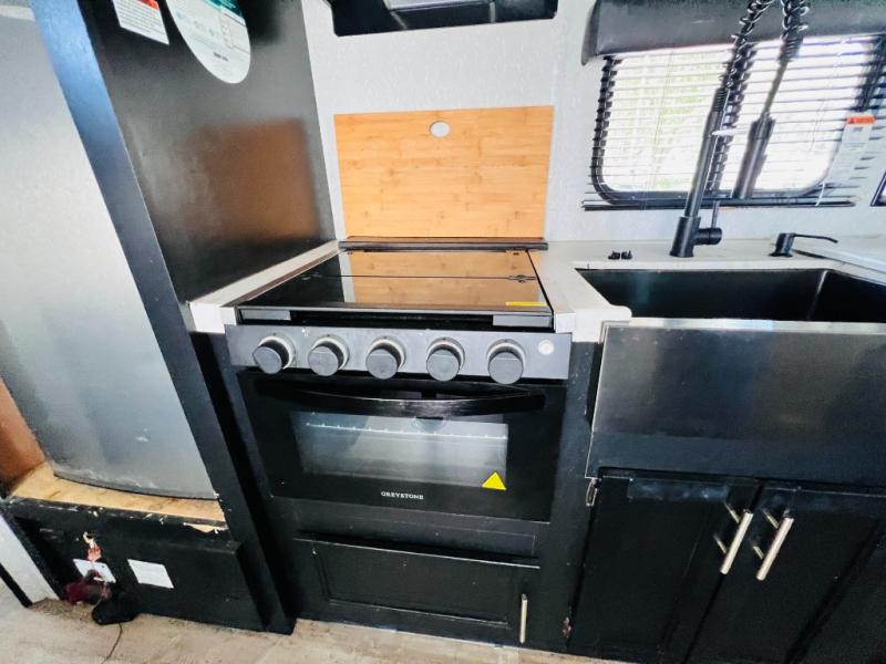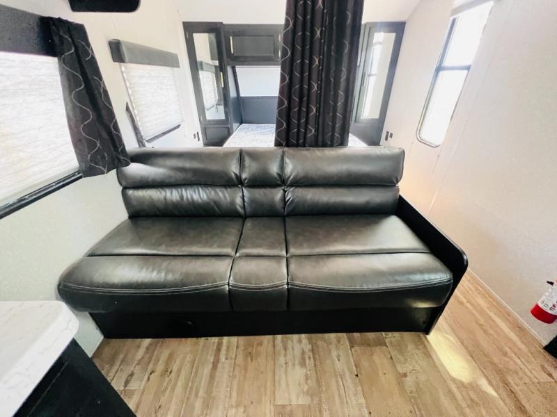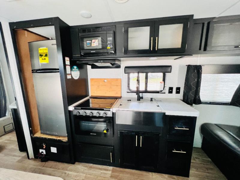 Enjoy cooking for nine in this Cherokee Grey Wolf travel trailer. With a three-burner cooktop, an overhead microwave, and an oven, you can easily cook just like home. The residential farm-style stainless steel sink makes cleaning your larger pots and pans quite simple, and the large overhead cabinets make storage an easy task as well. There is plenty of seating for the whole gang with the sofa and the booth dinette to play a game or two after you have enjoyed your delicious meal. Your kiddos are sure to love having their own set of double-size bunks conveniently located next to the rear bath, and you will love having your own front semi-private bedroom when you close the privacy curtain. You can also create some outdoor living space beneath the 15' power awning so that you can enjoy the great outdoors whether rain or shine!