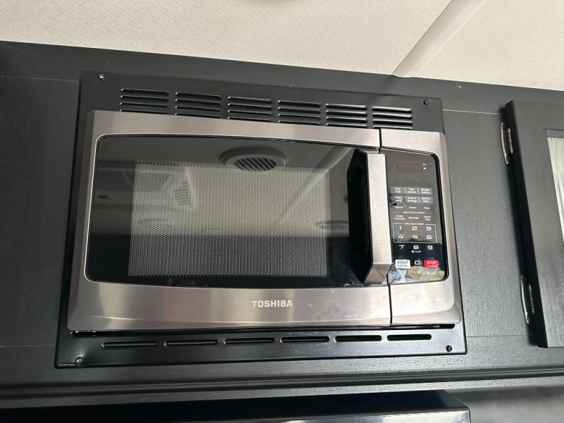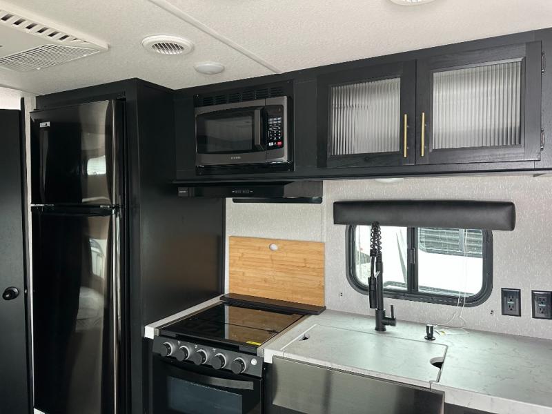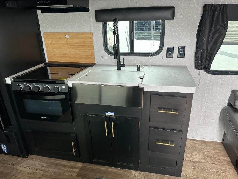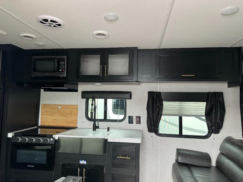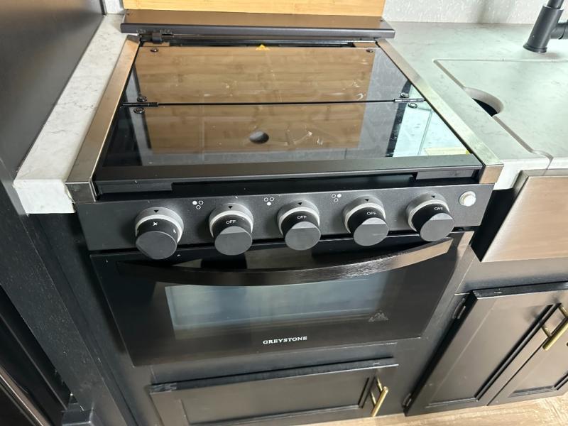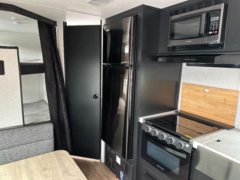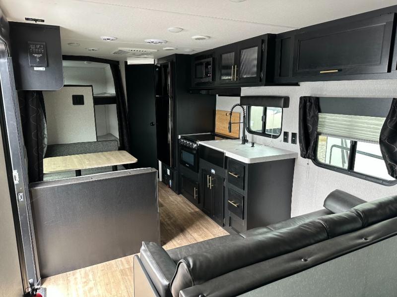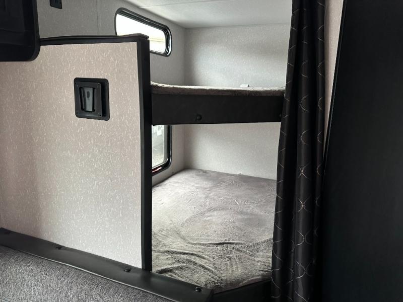 Enjoy cooking for nine in this Cherokee Grey Wolf travel trailer. With a three-burner cooktop, an overhead microwave, and an oven, you can easily cook just like home. The residential farm-style stainless steel sink makes cleaning your larger pots and pans quite simple, and the large overhead cabinets make storage an easy task as well. There is plenty of seating for the whole gang with the sofa and the booth dinette to play a game or two after you have enjoyed your delicious meal. Your kiddos are sure to love having their own set of double-size bunks conveniently located next to the rear bath, and you will love having your own front semi-private bedroom when you close the privacy curtain. You can also create some outdoor living space beneath the 15' power awning so that you can enjoy the great outdoors whether rain or shine!