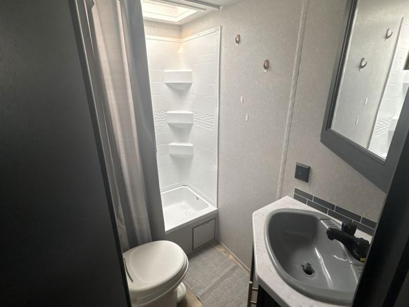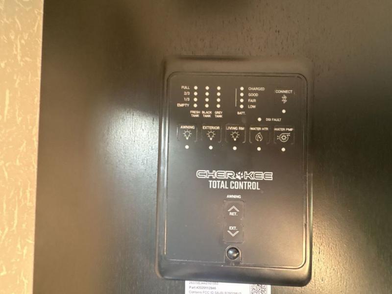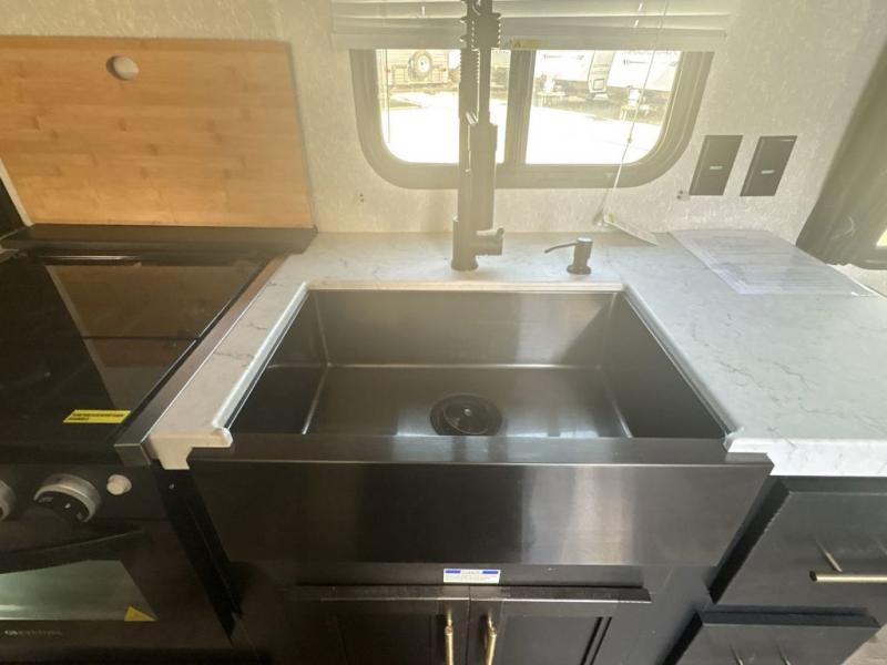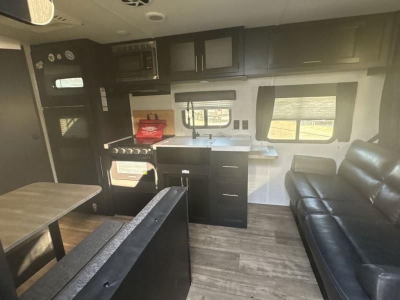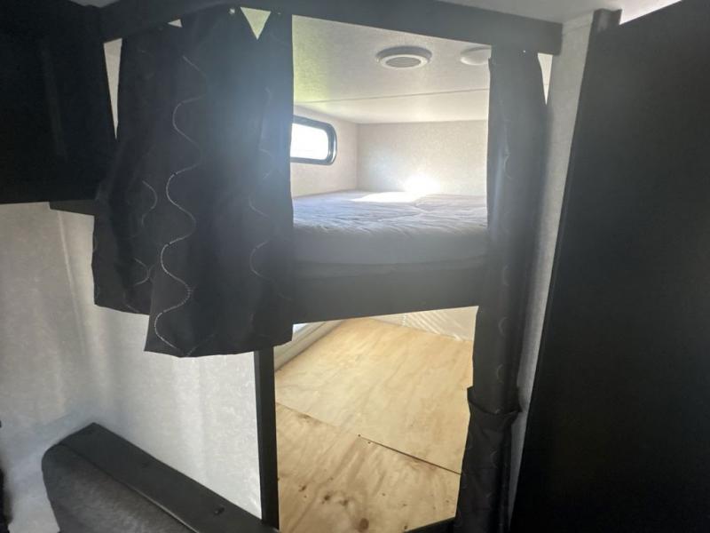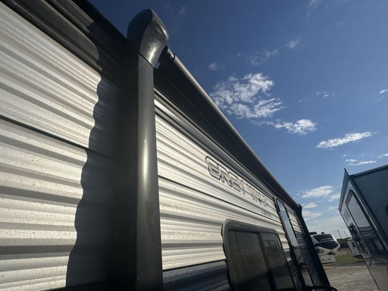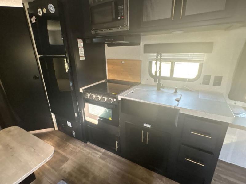 Enjoy cooking for nine in this Cherokee Grey Wolf travel trailer. With a three-burner cooktop, an overhead microwave, and an oven, you can easily cook just like home. The residential farm-style stainless steel sink makes cleaning your larger pots and pans quite simple, and the large overhead cabinets make storage an easy task as well. There is plenty of seating for the whole gang with the sofa and the booth dinette to play a game or two after you have enjoyed your delicious meal. Your kiddos are sure to love having their own set of double-size bunks conveniently located next to the rear bath, and you will love having your own front semi-private bedroom when you close the privacy curtain. You can also create some outdoor living space beneath the 15' power awning so that you can enjoy the great outdoors whether rain or shine!