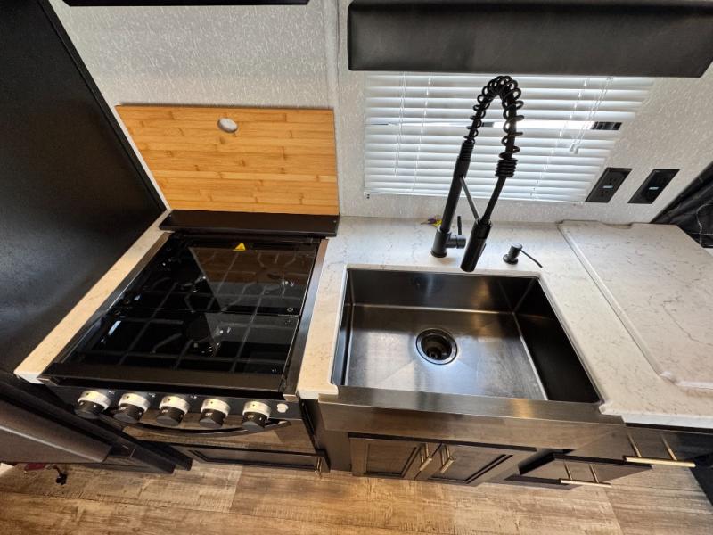 Kitchen Sink: Equipped with a residential farm-style black stainless steel sink.