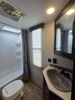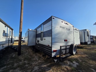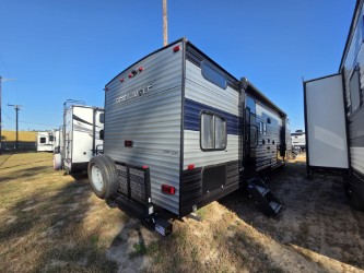 It's time you go camping the right way with this Forest River Cherokee Grey Wolf travel trailer! It features a front private bedroom with a queen bed for you to escape and recharge after a fun-filled day. Your kiddos are sure to love having their own set of rear double-size bunks with a ladder for safety, and you are sure to love that the rear corner bath is located right next to them. Inside the kitchen, there is a pantry big enough to hold your group's favorite snacks and a residential farm-style stainless steel sink to make your clean-up a breeze. There is also a U-shaped dinette for you to enjoy your meals at or play a card game or two!