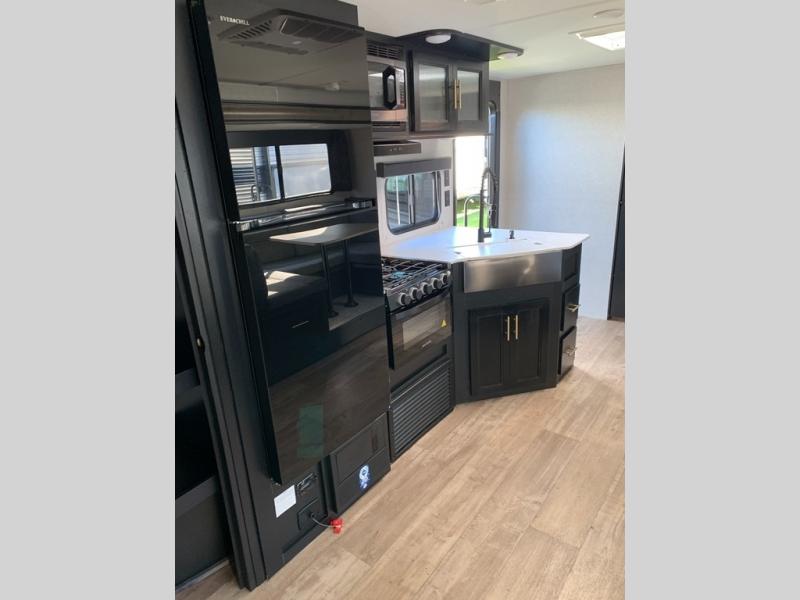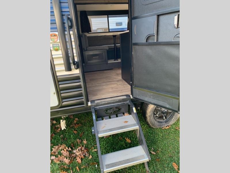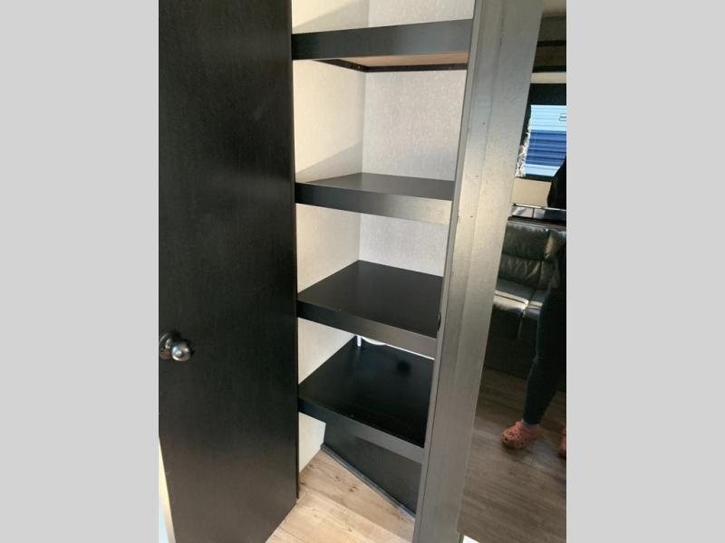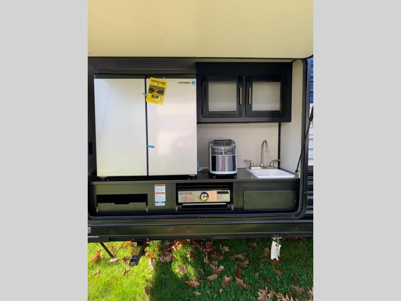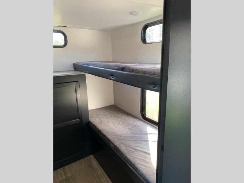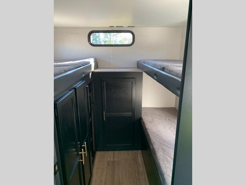 Your larger family will love spending weekends away with this Cherokee Grey Wolf travel trailer as their home away from home. This model offers lots of sleeping space with three bunk beds in the rear private bunkhouse. In the front, there is a master suite with wardrobes and nightstands on either side of the queen bed, and it even has private access to the dual-entry bath. The two entry doors will make accessing the trailer easy for everyone, and you will appreciate the abundant storage throughout this unit including large overhead cabinets, a walk-in pantry, and numerous outside storage compartments for all of your outdoor gear. You also even have an outdoor kitchen!