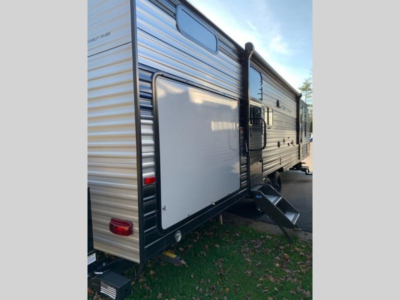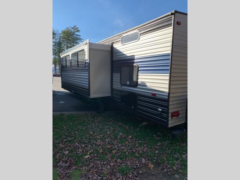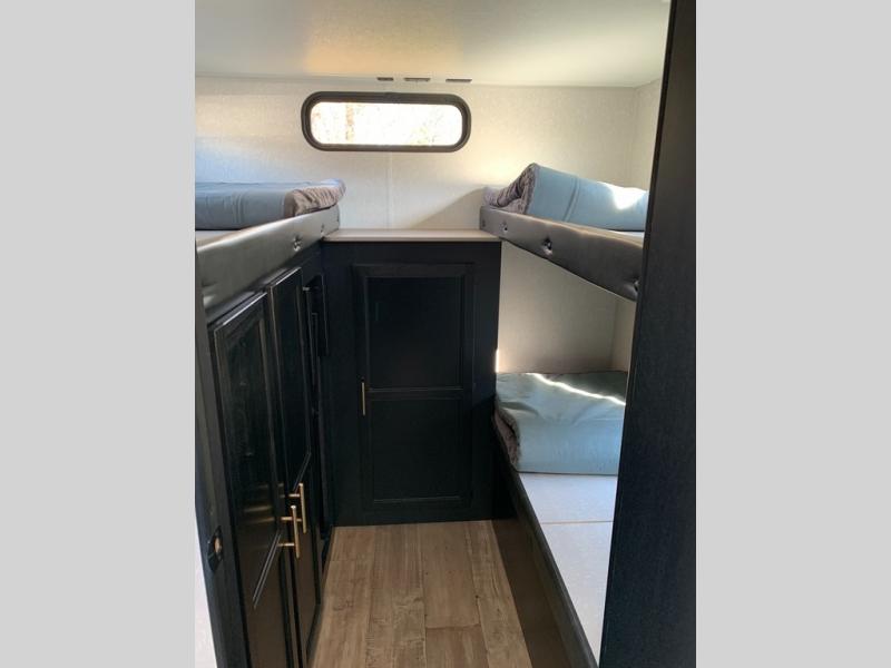 Your larger family will love spending weekends away with this Cherokee Grey Wolf travel trailer as their home away from home. This model offers lots of sleeping space with three bunk beds in the rear private bunkhouse. In the front, there is a master suite with wardrobes and nightstands on either side of the queen bed, and it even has private access to the dual-entry bath. The two entry doors will make accessing the trailer easy for everyone, and you will appreciate the abundant storage throughout this unit including large overhead cabinets, a walk-in pantry, and numerous outside storage compartments for all of your outdoor gear. You also even have an outdoor kitchen!