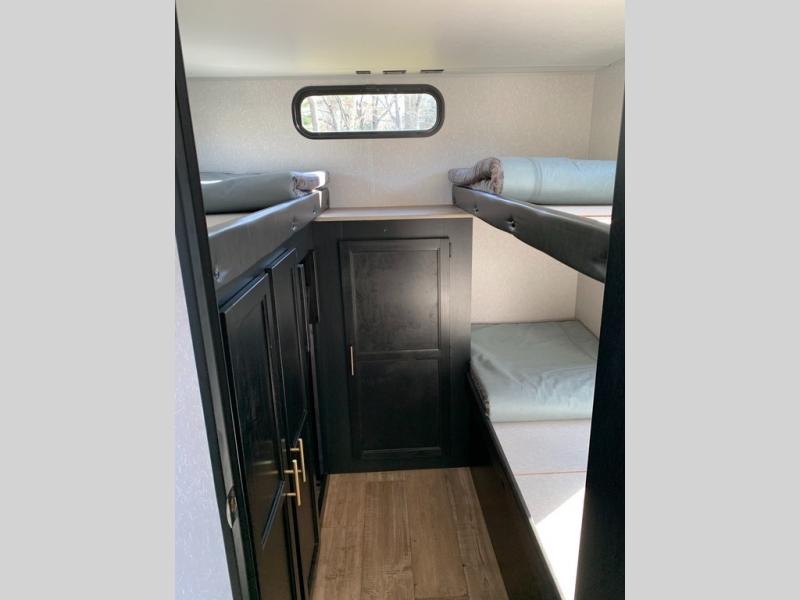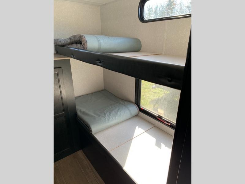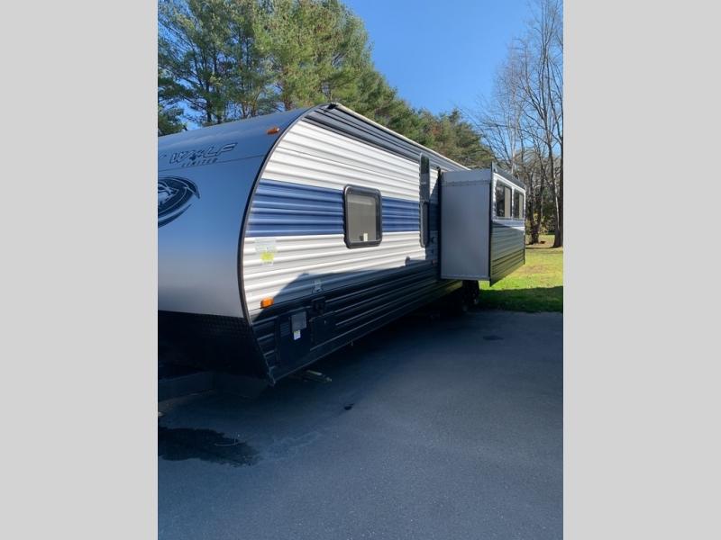 Your larger family will love spending weekends away with this Cherokee Grey Wolf travel trailer as their home away from home. This model offers lots of sleeping space with three bunk beds in the rear private bunkhouse. In the front, there is a master suite with wardrobes and nightstands on either side of the queen bed, and it even has private access to the dual-entry bath. The two entry doors will make accessing the trailer easy for everyone, and you will appreciate the abundant storage throughout this unit including large overhead cabinets, an oversized pantry, and numerous outside storage compartments for all of your outdoor gear. You also even have an outside bar & grill!