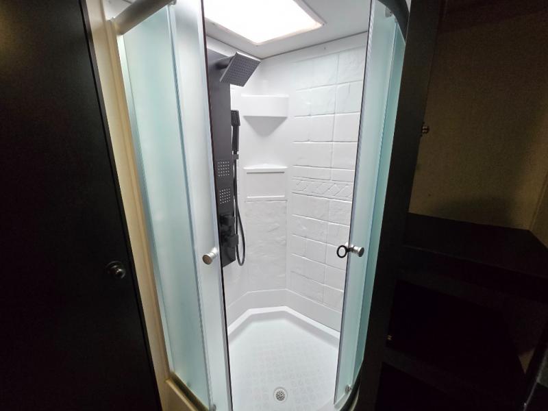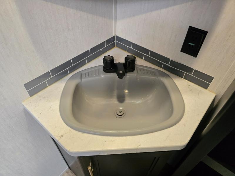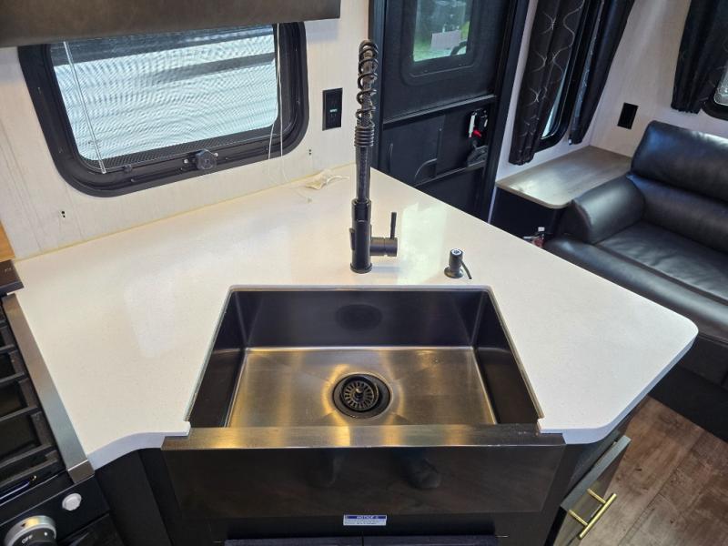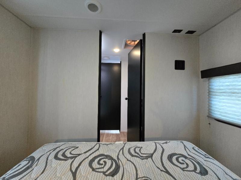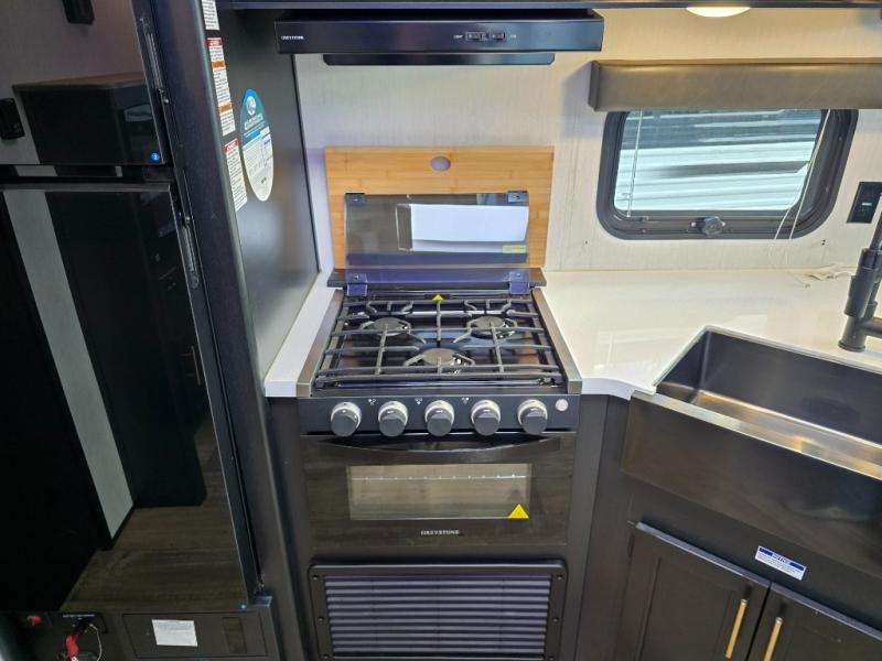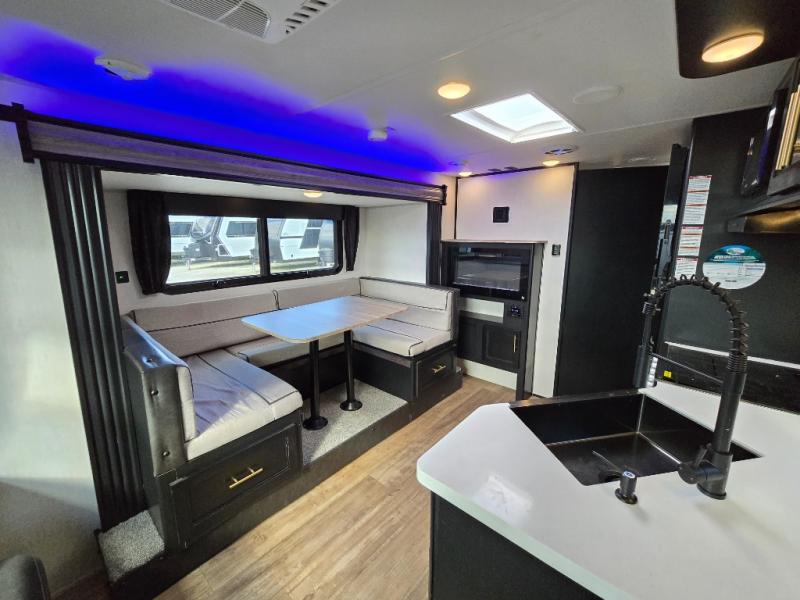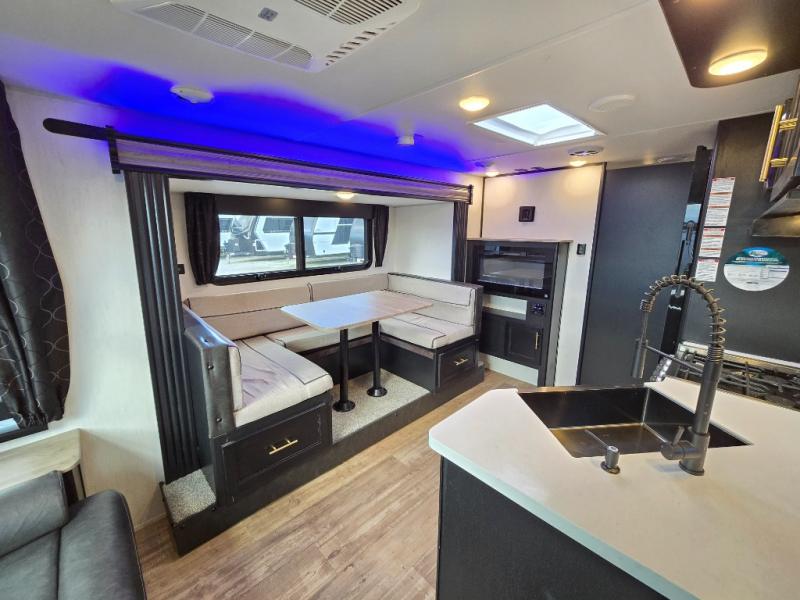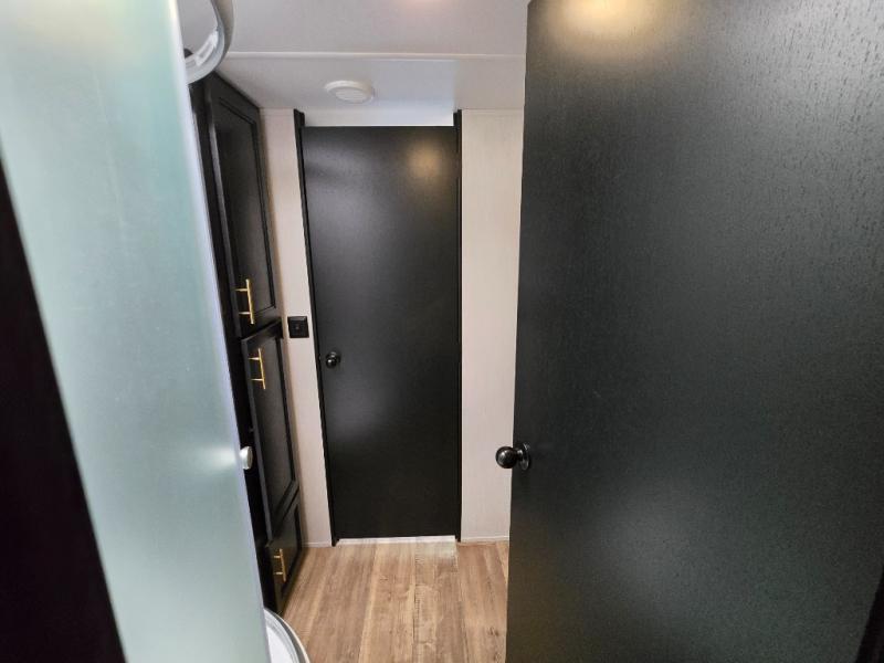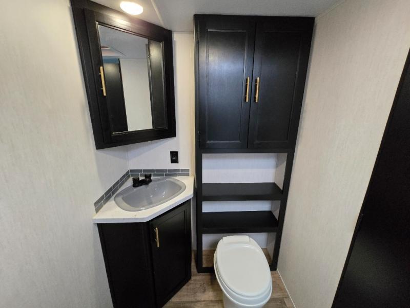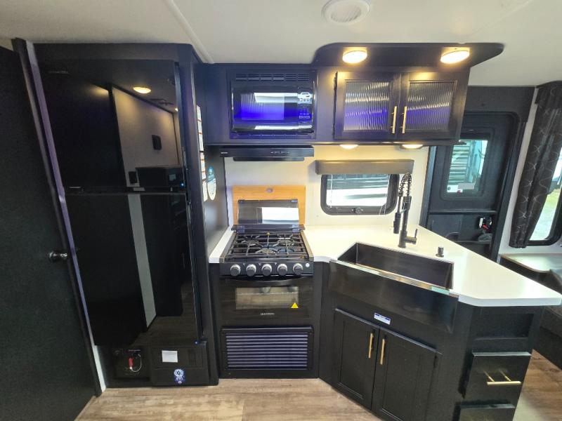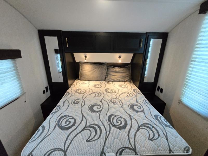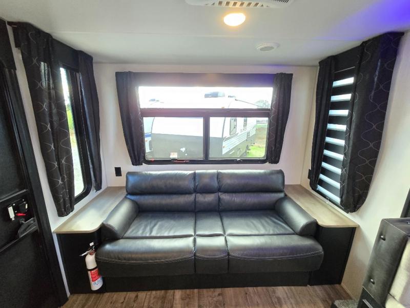 This Cherokee Grey Wolf Black Label travel trailer is perfect for your small family and will leave you planning your next outing before you are back from your current weekend away! You will find all of the comforts you need with plenty of livable space including a U-shaped dinette slide. There is also a sofa for more seating when company arrives, plus there are end tables on either side to prevent spills. A spacious walk-through bath leads to a front private bedroom where you will enjoy a great night's rest on a comfortable queen-size bed. You will find ample storage for clothing in the wardrobes that are above handy nightstands for your personal things. There are even lights mounted above the bed on each side which makes it easy to read a couple of chapters before drifting off to sleep.