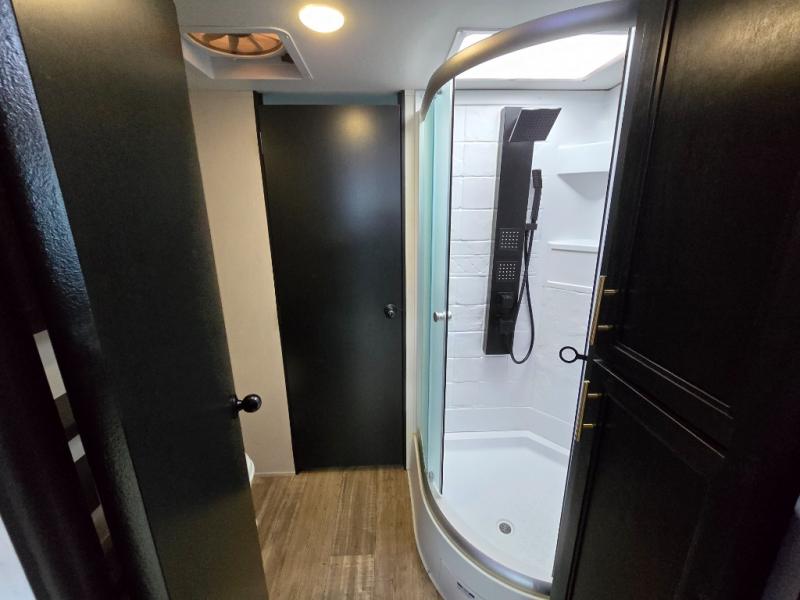 The Forest River Cherokee Grey Wolf Black Label travel trailers and toy haulers are attractive, enticing, and absolutely eye-catching! The Black Label comes with some features that are specifically unique to its name tag, like the solid-wood cabinet doors, solid-surface countertops, a pillowtop mattress, and an automotive frameless windows package. You can travel in confidence with the premium wheel package, seamless roofing membrane with heat reflectivity, Power Gear frame technology with space-saver rail design, and Cherokee back-up camera system. The Cherokee Grey Wolf's interior is highly attractive with its stainless steel kitchen suite package, premium bedding ensemble and comforter, and 8" ceiling-mounted subwoofer with accent lighting. You will also find a black waste tank flush-out kit, an outside shower with hot and cold water, an armored underbelly tank enclosure, a power tongue jack, and an RV grill quick connect.